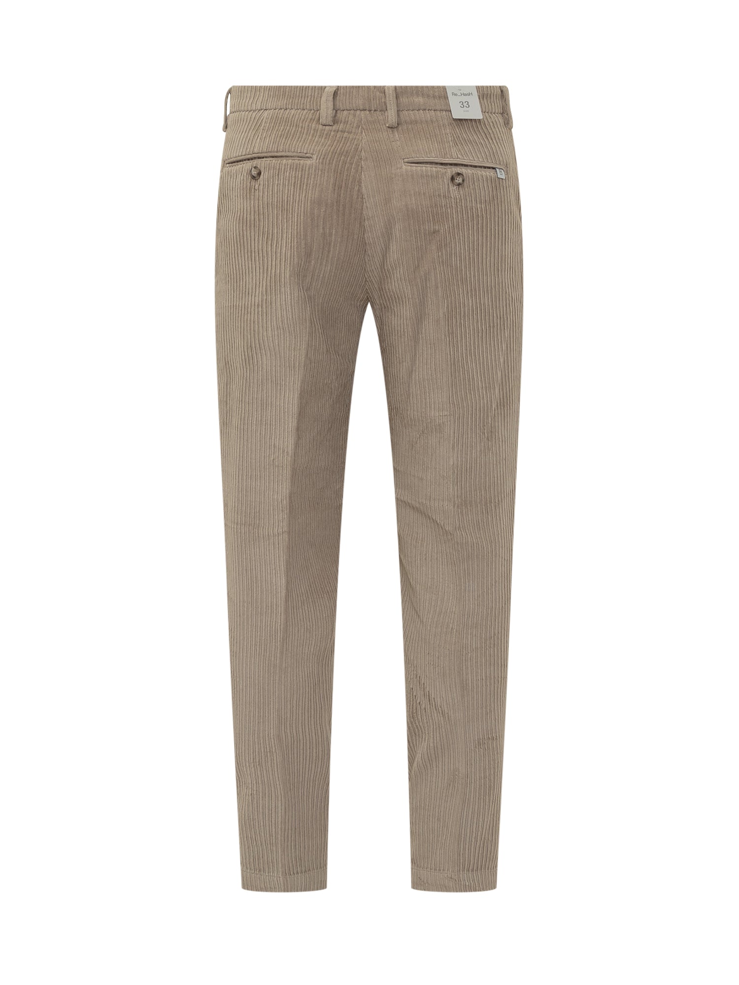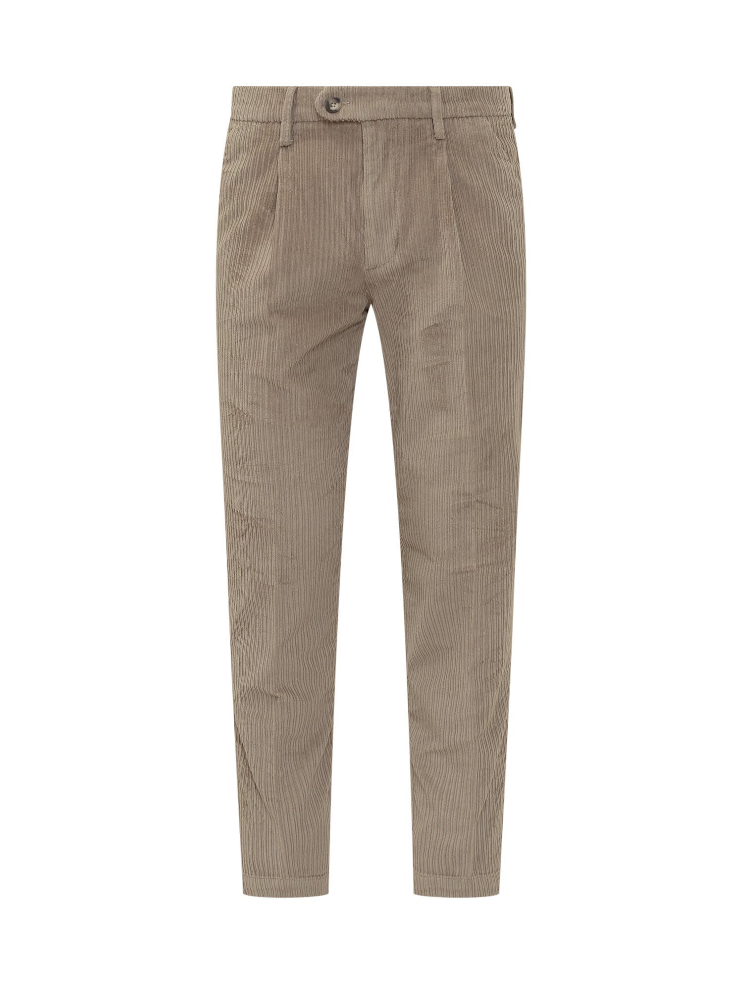 Re-Hash beige corduroy pants with front pleat and turned-up hem. Side and back pockets, button and zip closure.