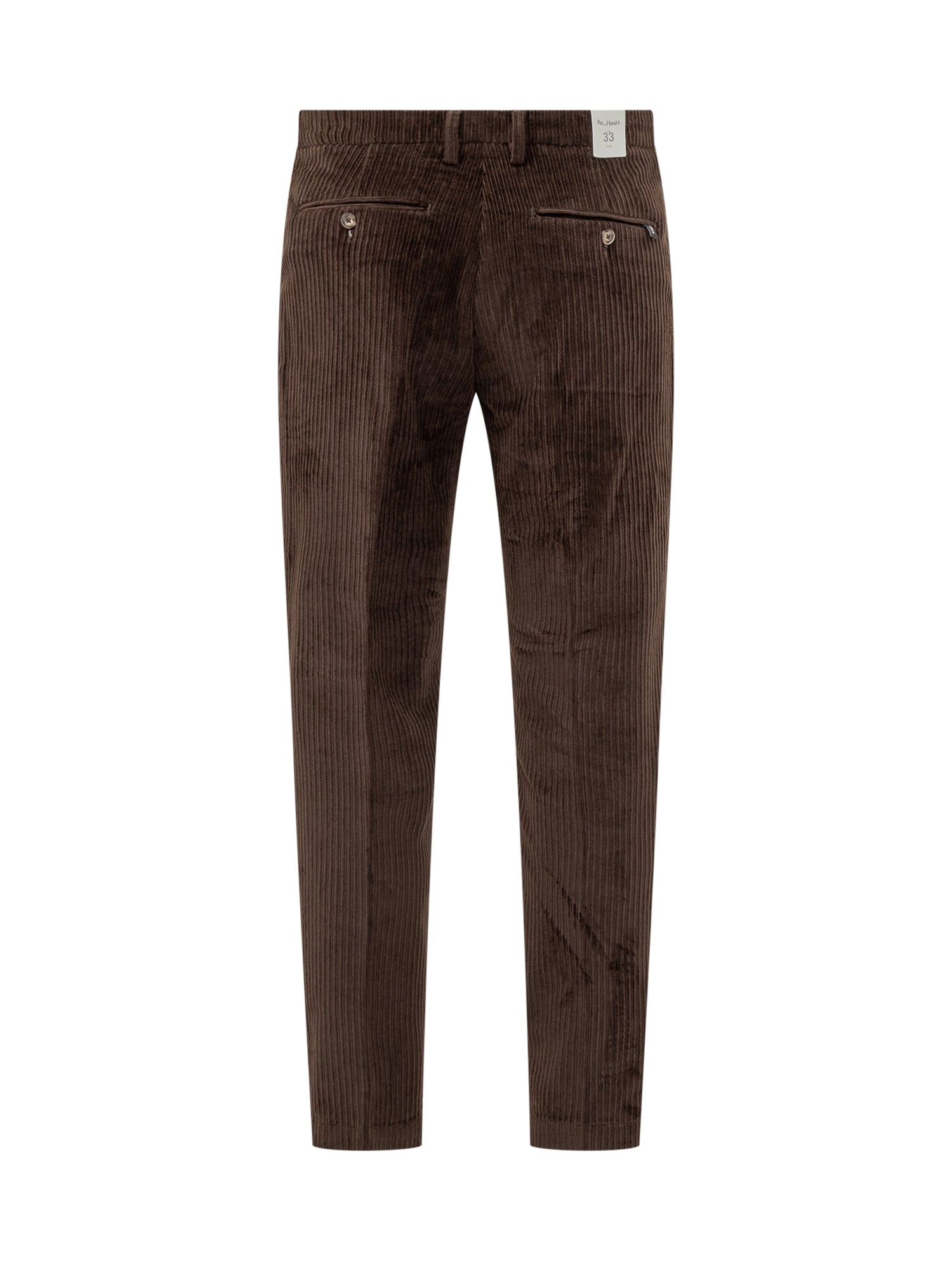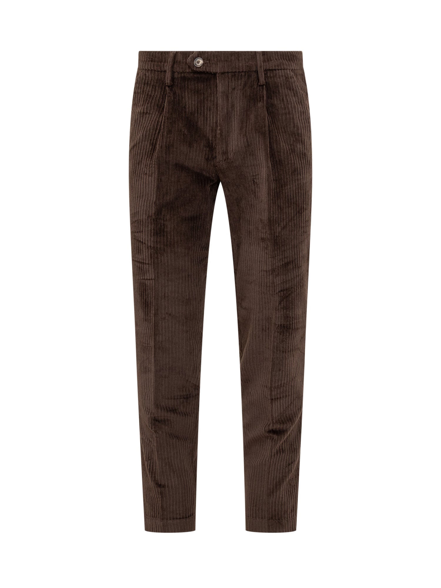Re-Hash brown corduroy pants with front pleat and turned-up hem. Side and back pockets, button and zip closure.