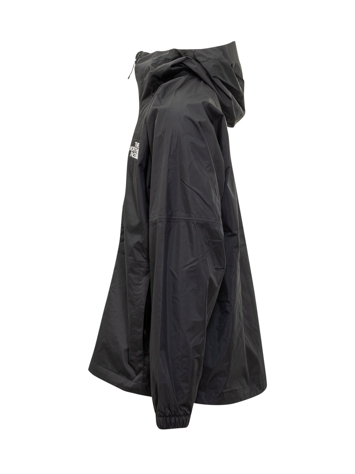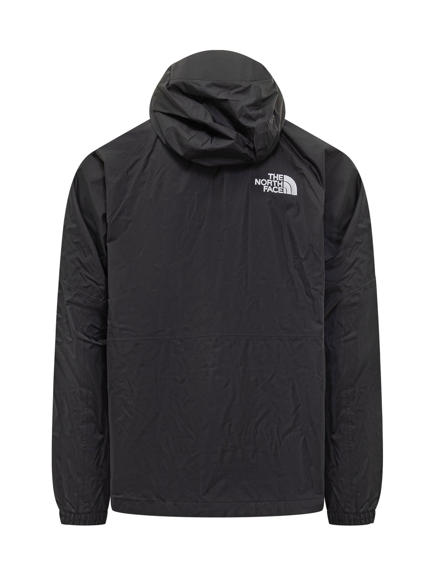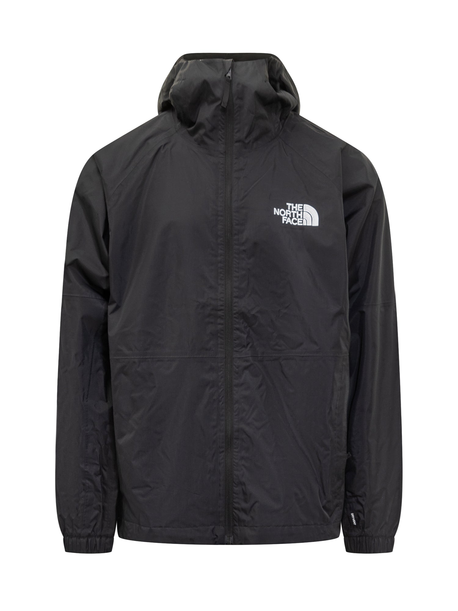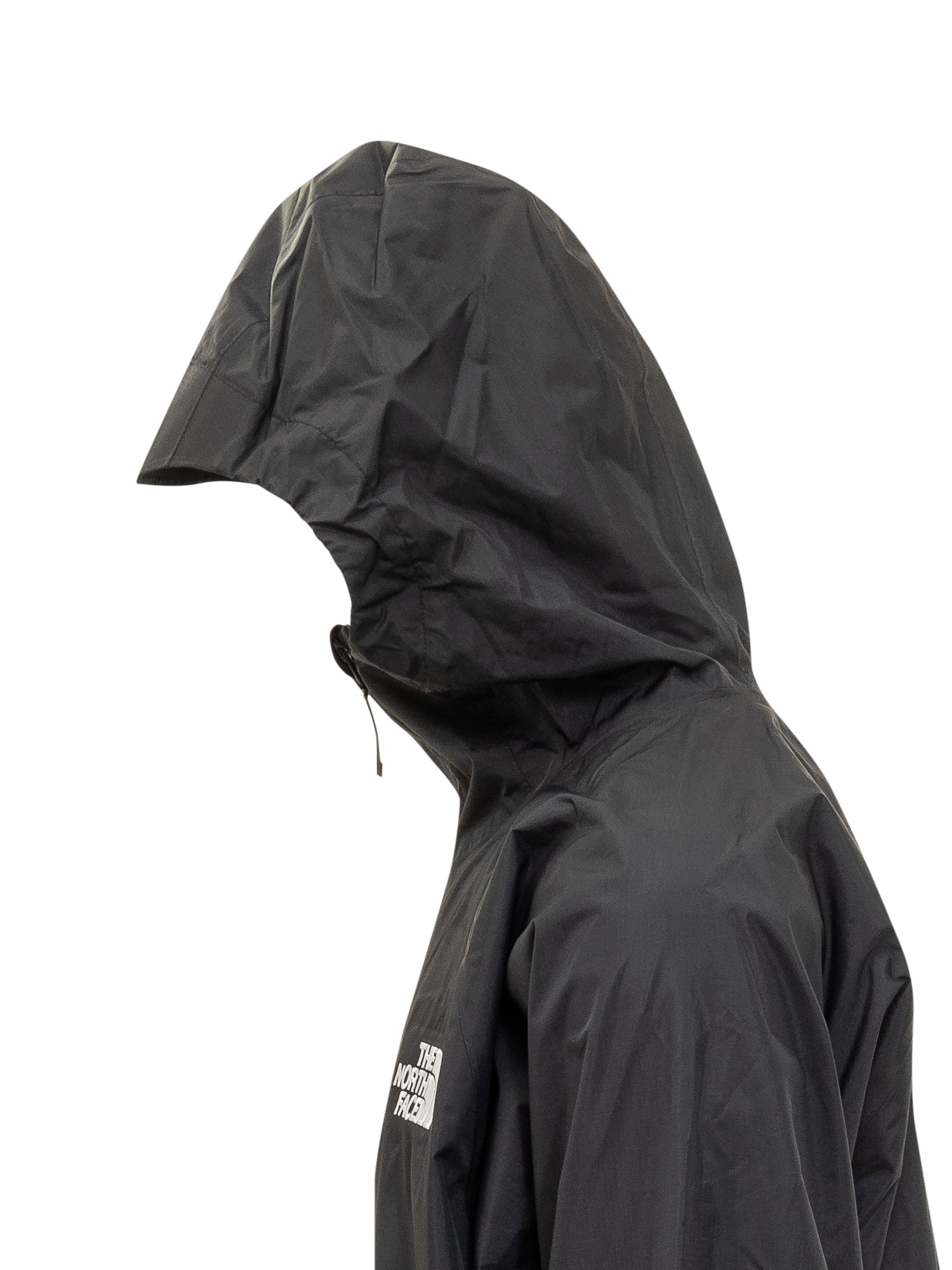 The North Face Build Up jacket in black technical fabric, lightweight and waterproof, featuring adjustable hood and front zip.