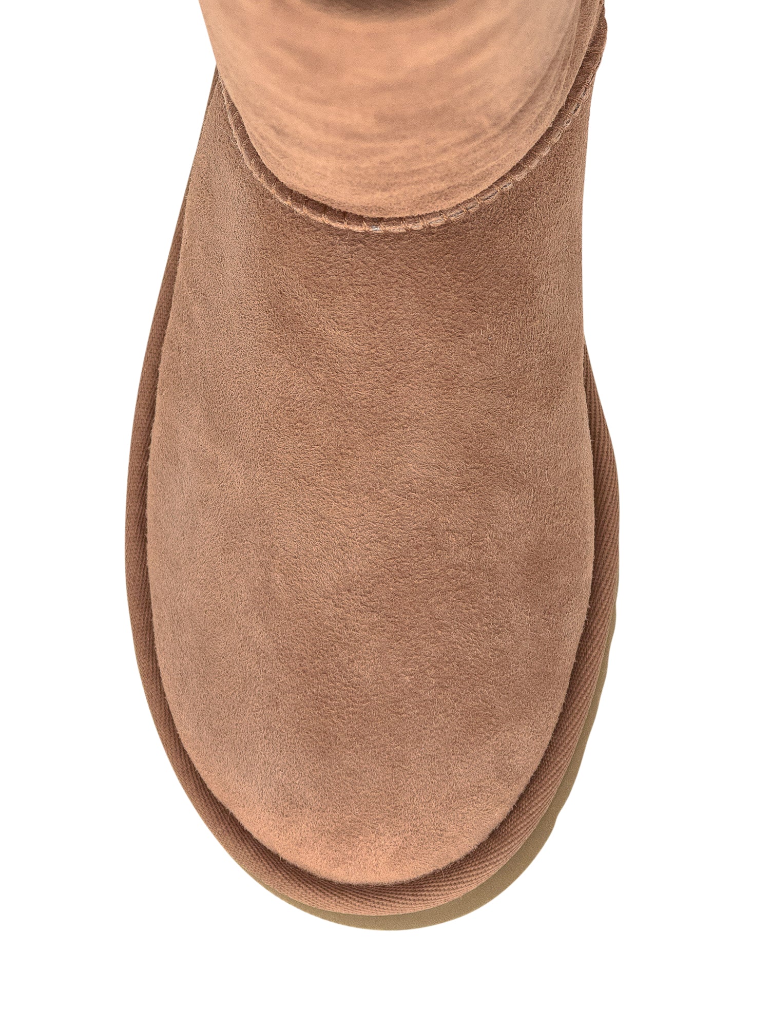 Beige suede high boot. Slip-on. Sheepskin lining. Logo patch at heel.