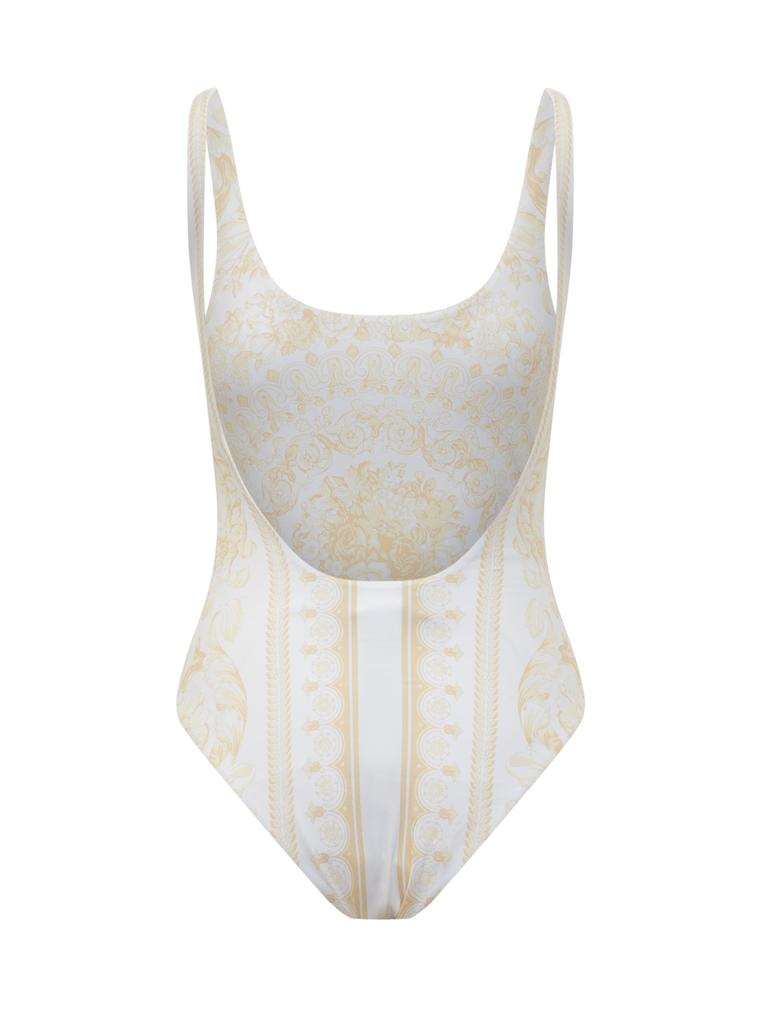 One-piece swimsuit crafted from responsible lycra, featuring a wide neckline and slim straps. The refined decorative print enhances the silhouette.
