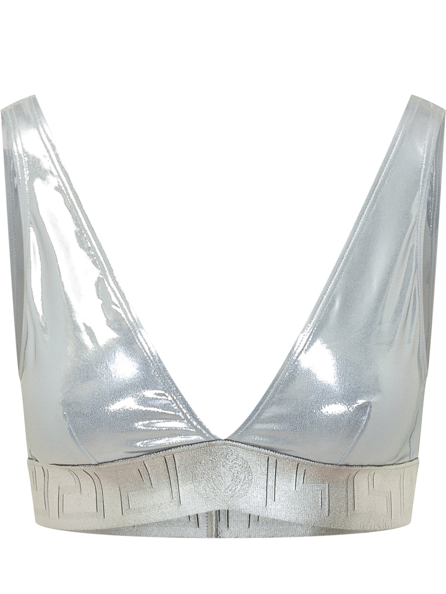 Bikini top in metallic lycra with deep neckline and elastic underband. Sleek and luminous design.