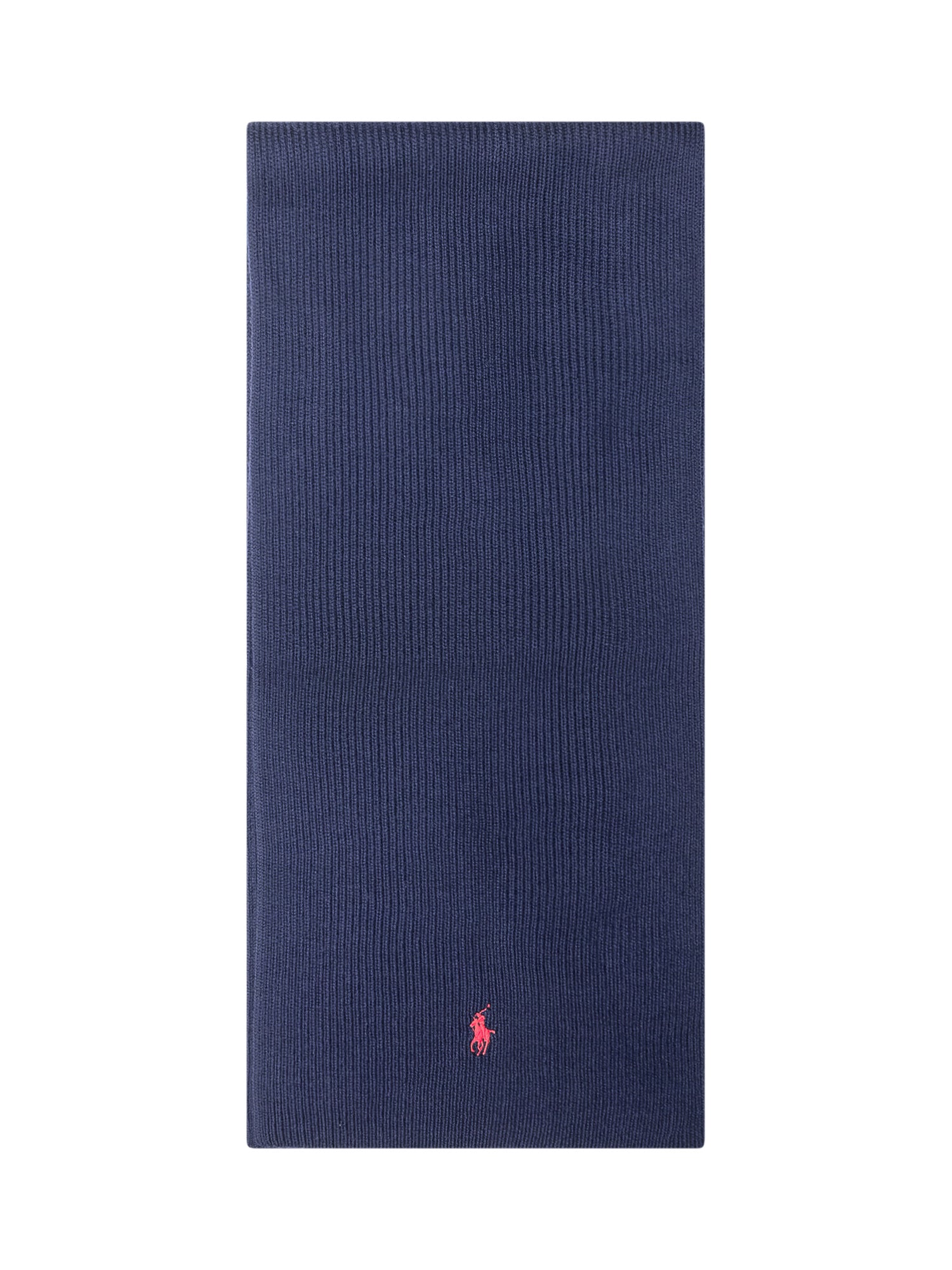 Polo Ralph Lauren blue knit scarf featuring the iconic pink embroidered logo.