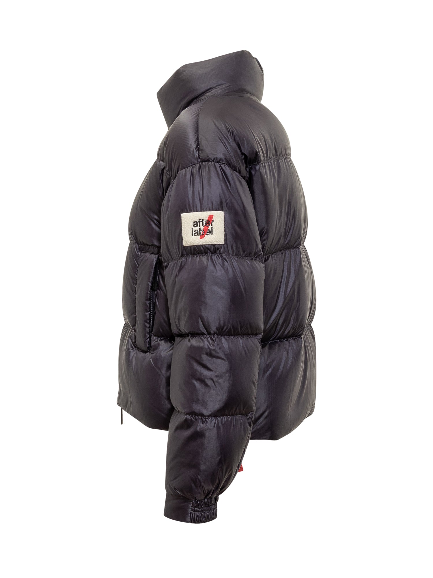 After Label shiny black short down jacket with high collar and zip fastening. Warm filling and minimal design.
