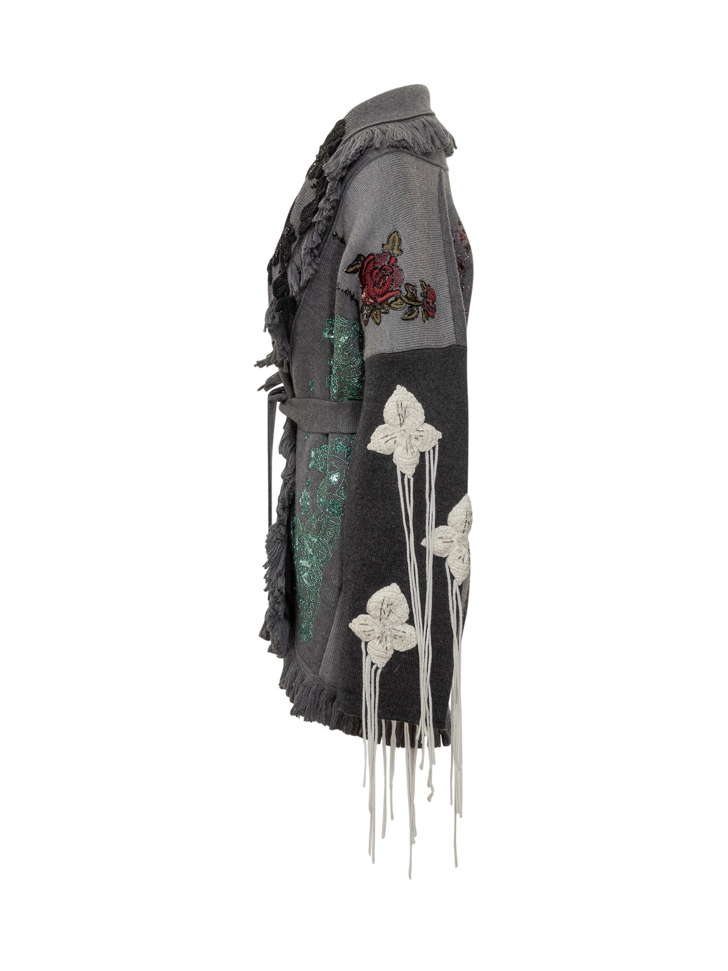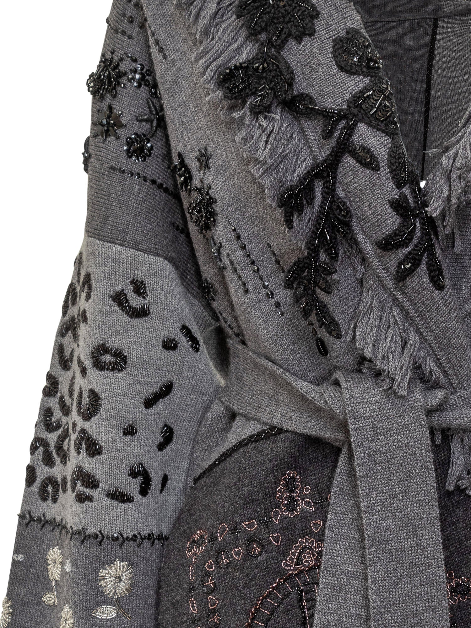 Alanui grey wool cardigan with belt, fringes, and multicolor embroidery. Beaded and sequin decorations create unique and refined patterns.