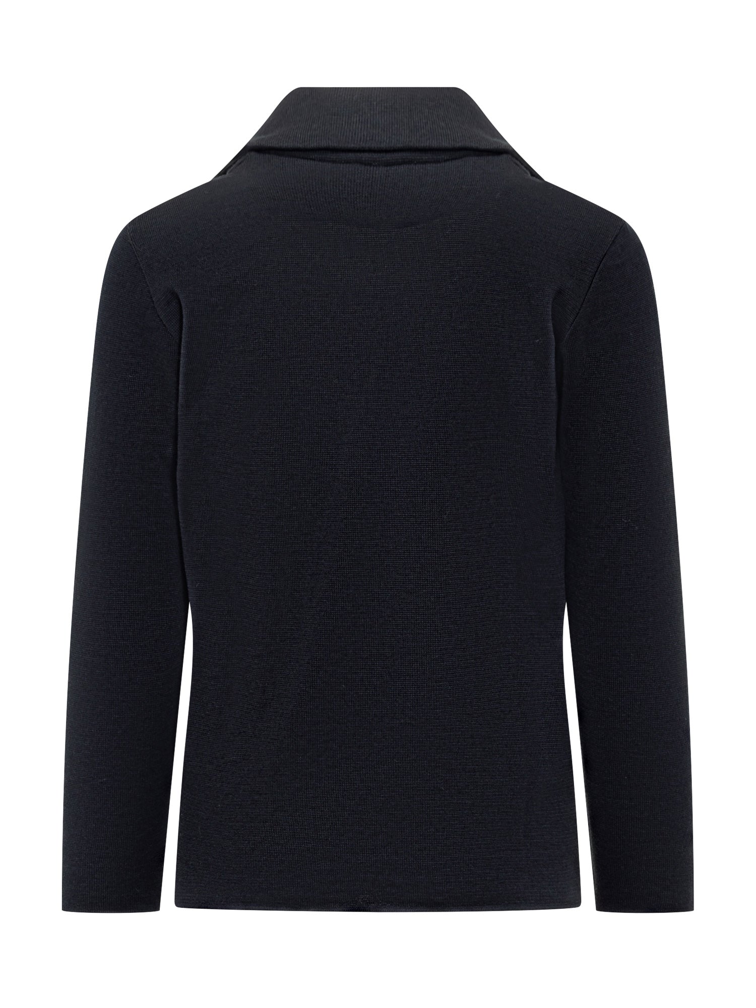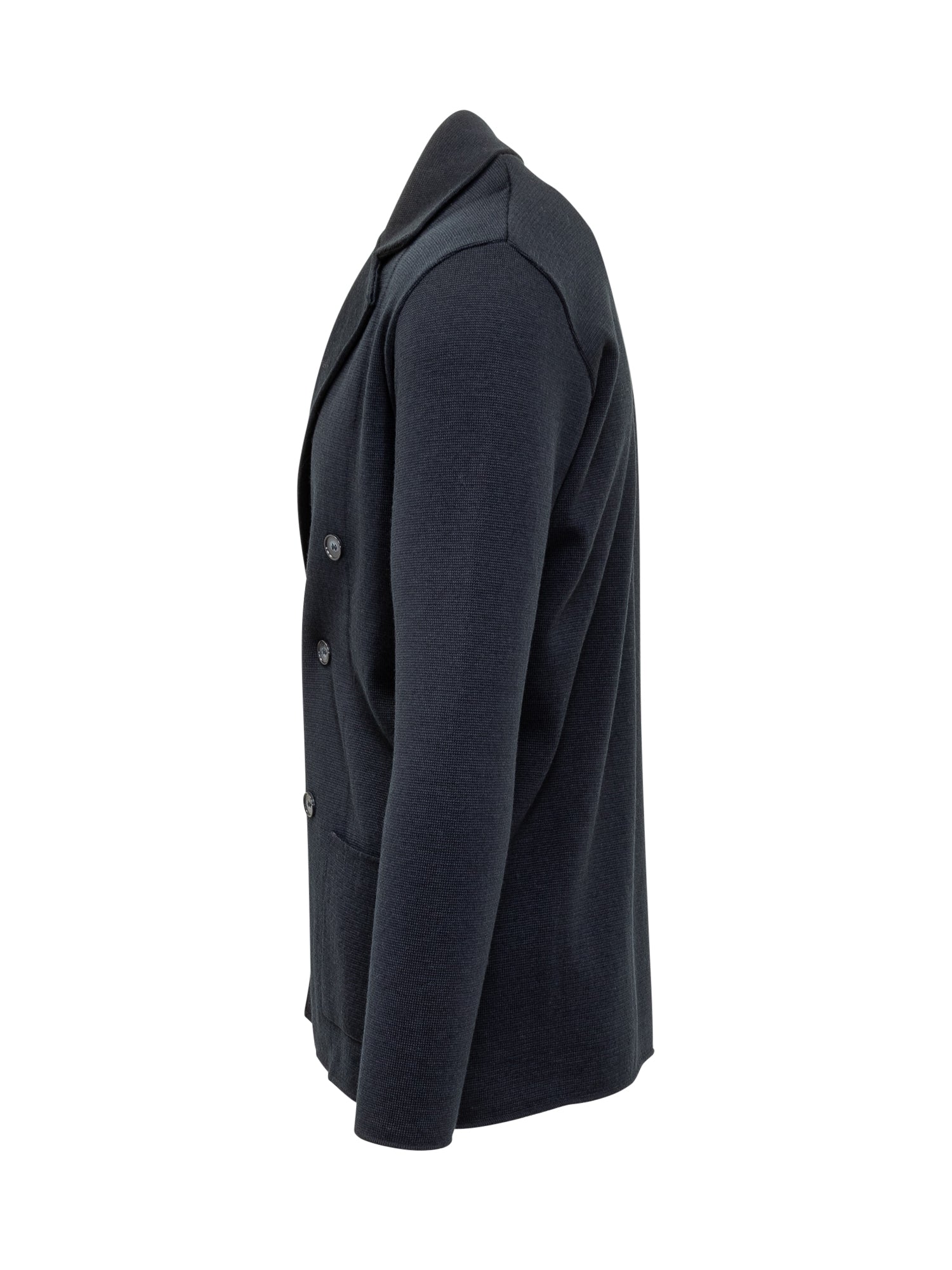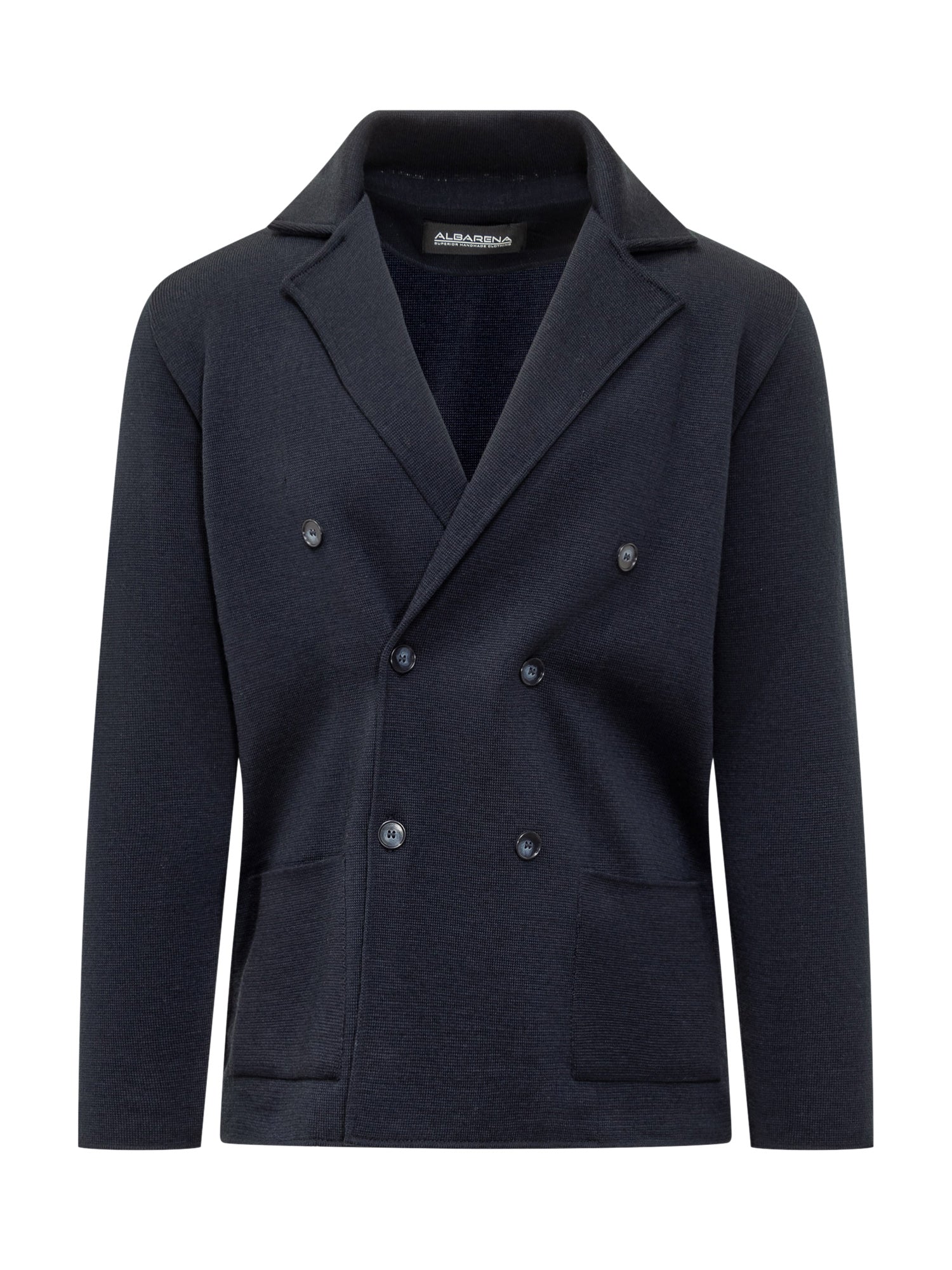 Albanera blue double-breasted knit jacket with six buttons and patch pockets. Modern design and superior comfort.