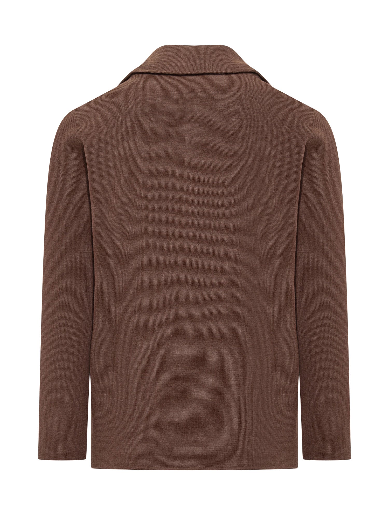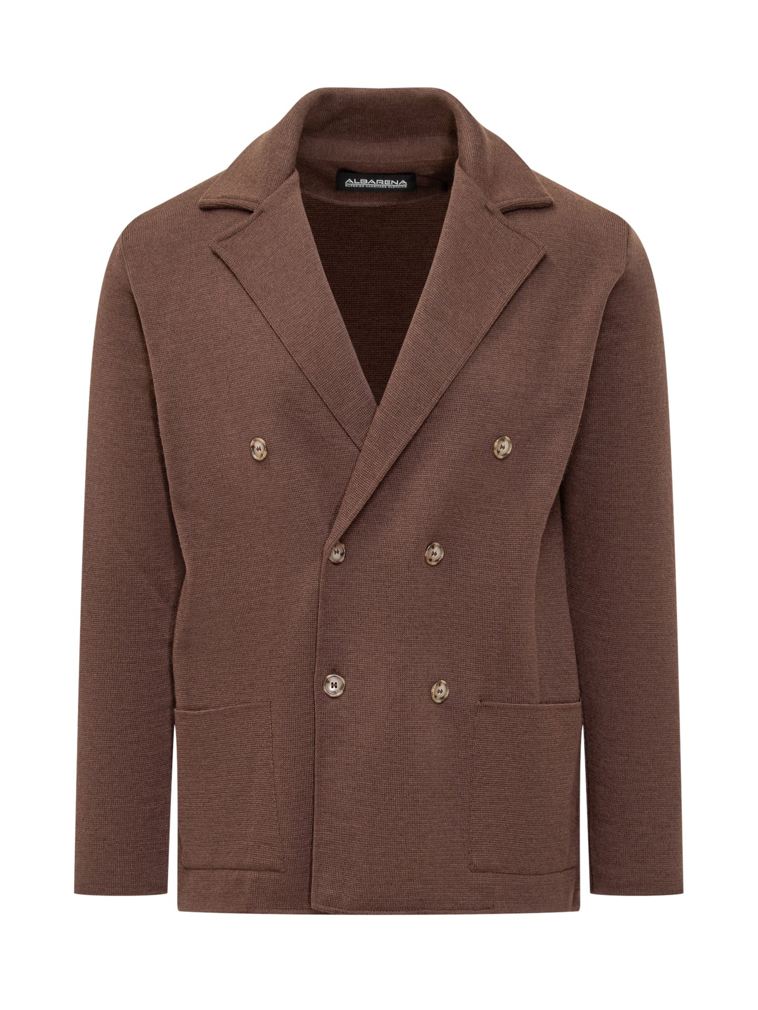 Albanera brown double-breasted knit jacket with six buttons and front pockets. Elegant and comfortable design.