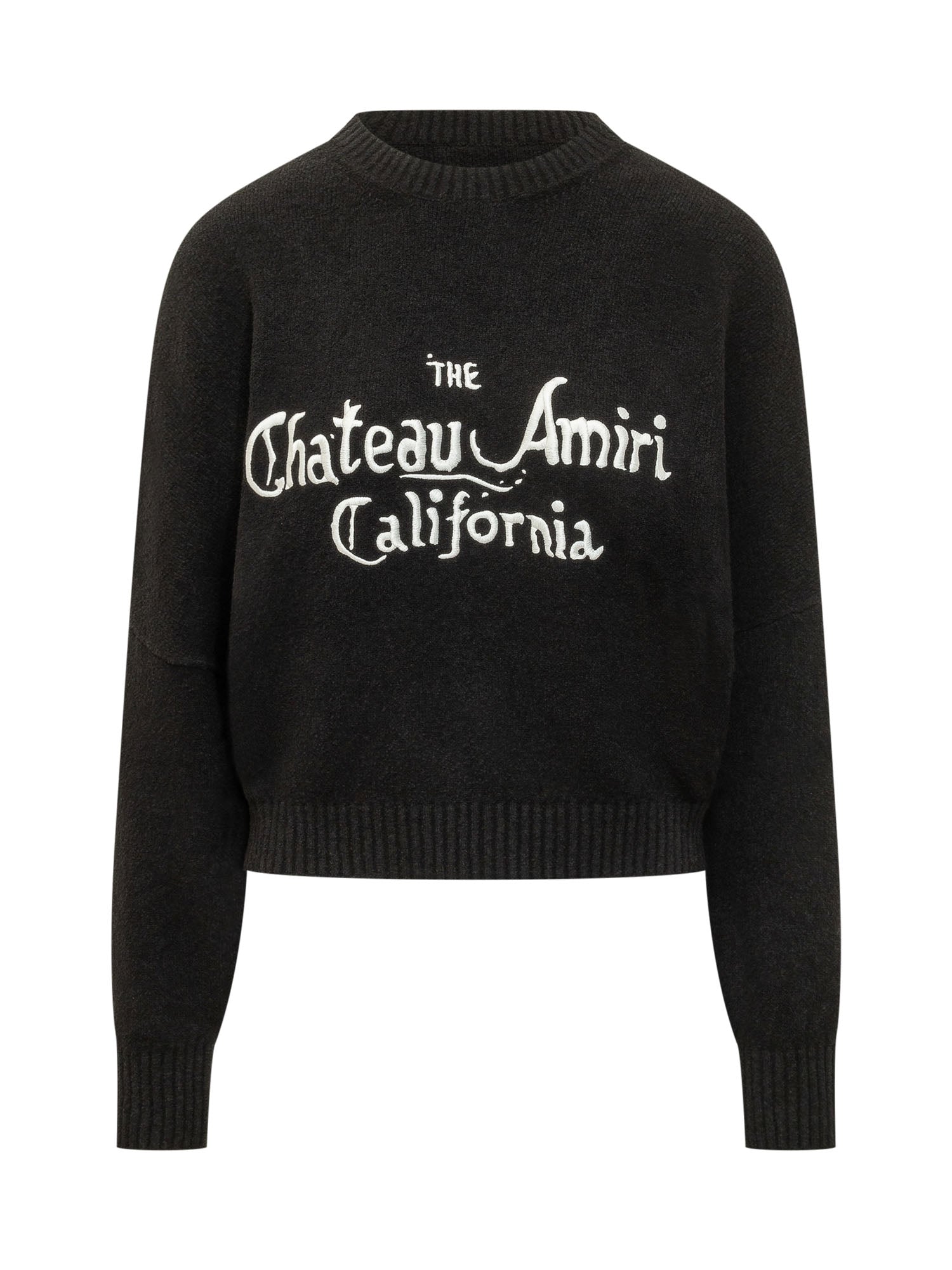 Crew neck sweater with long sleeves and knit structure. Cropped design with ribbed cuffs and hem. Front graphic print with contrasting lettering that defines the garment.