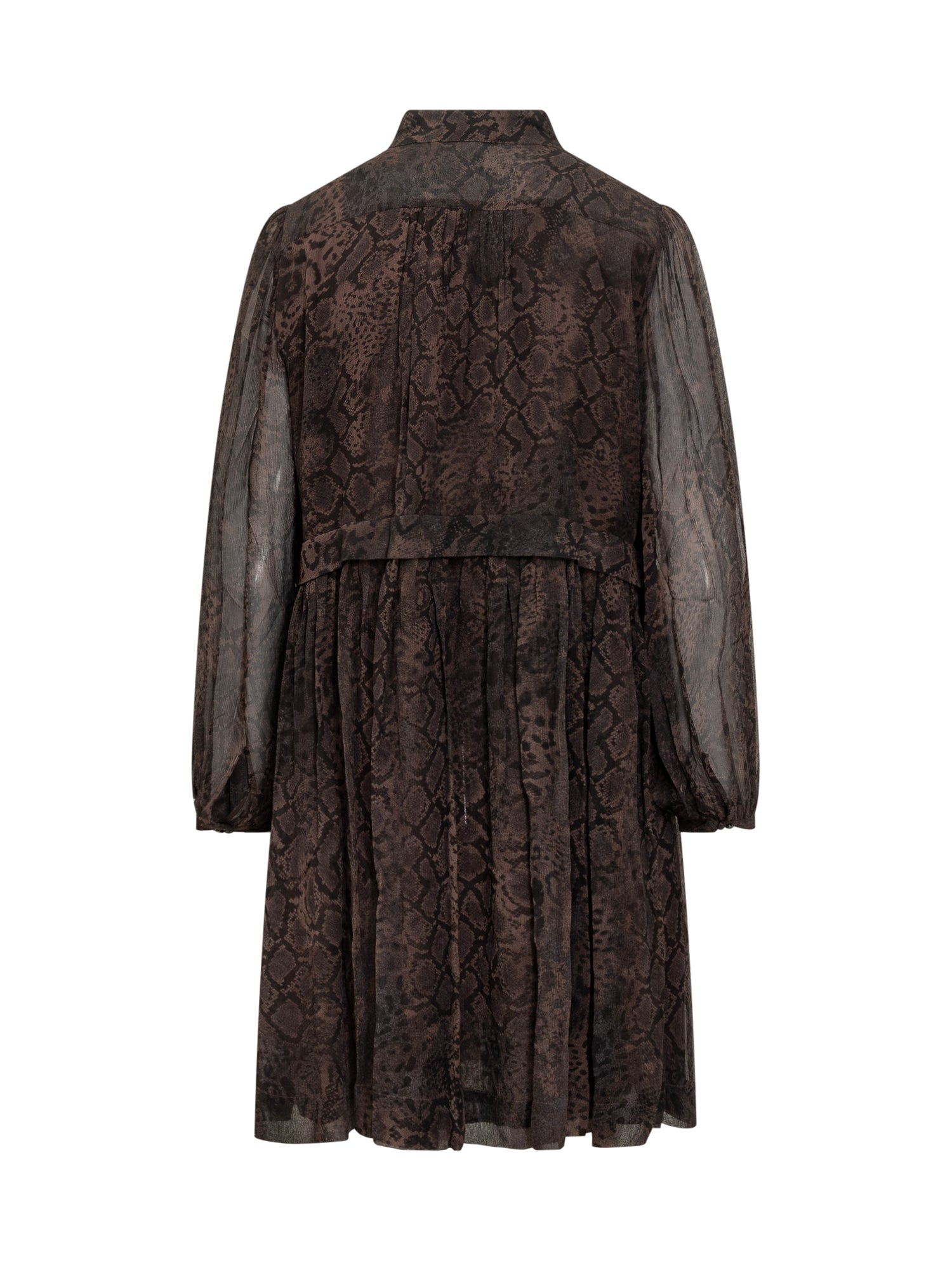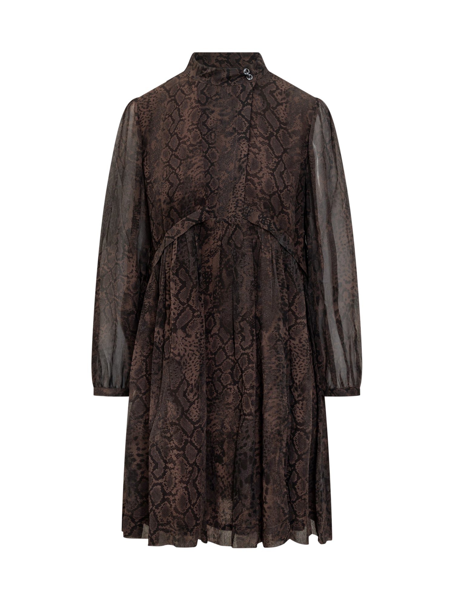 Ba&sh short dress featuring dark python print, high neck with button detail and sheer sleeves.