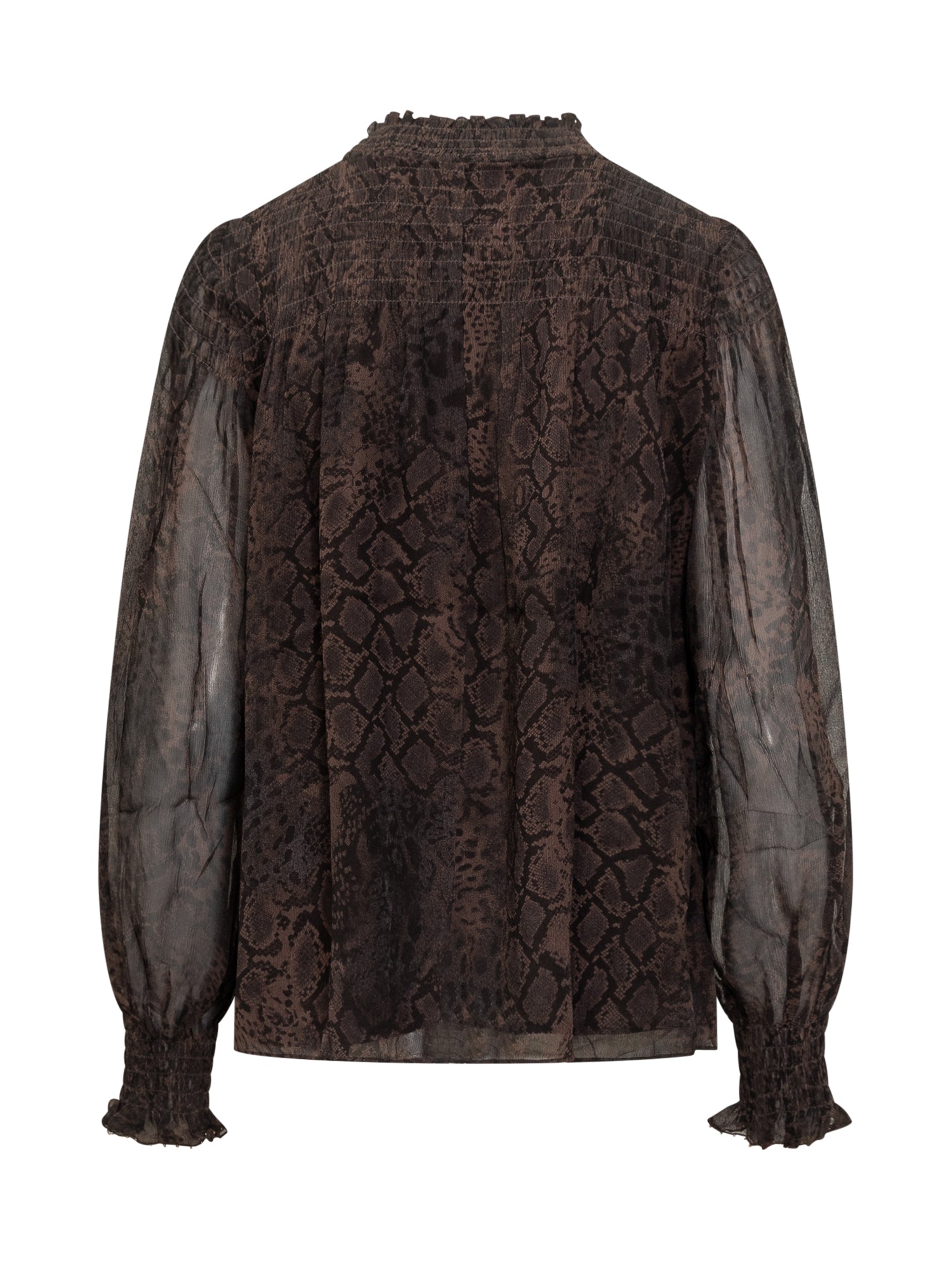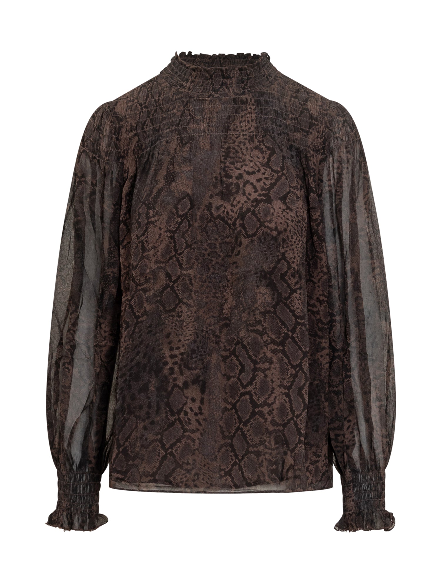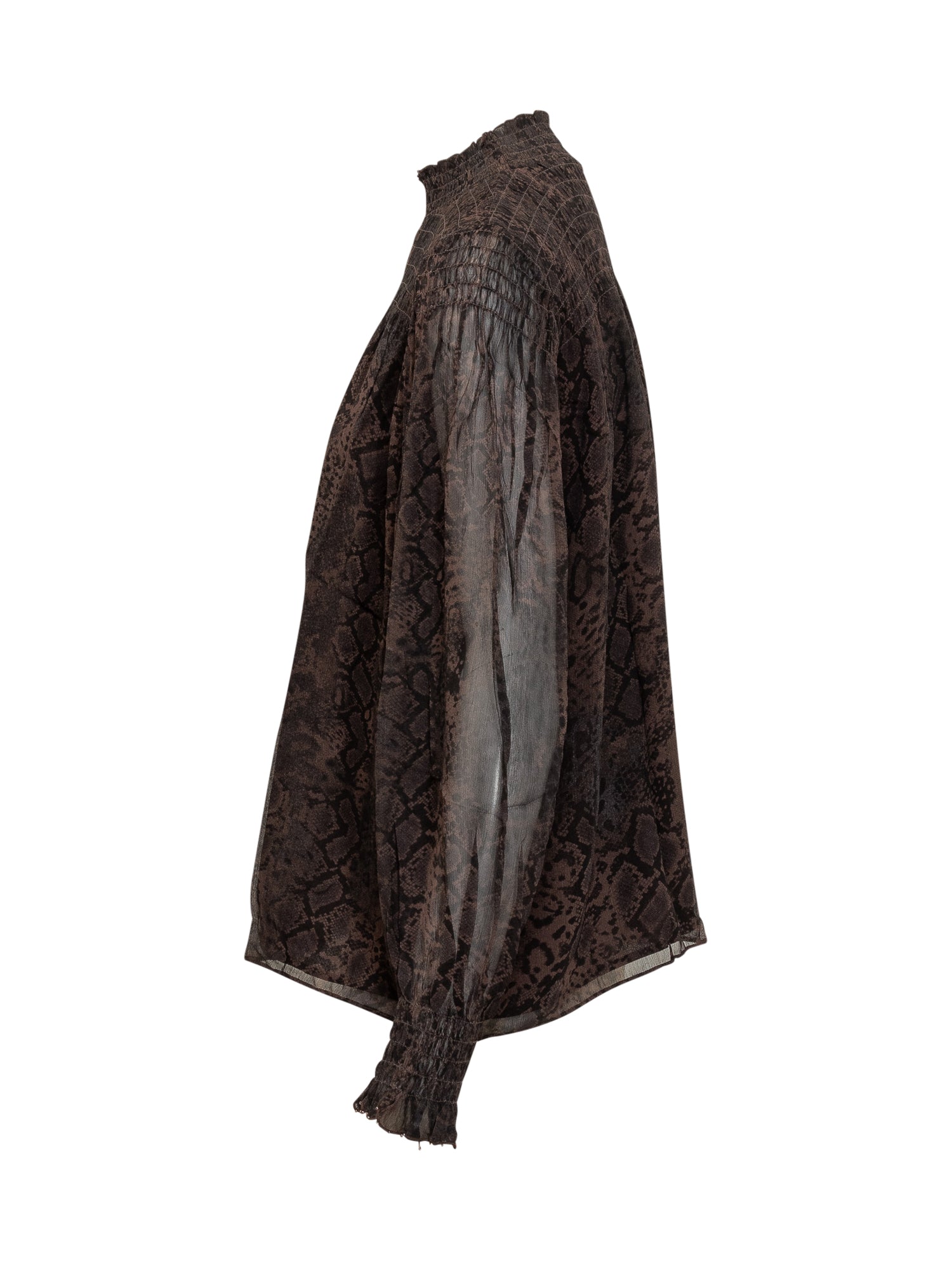 Ba&sh blouse in lightweight chiffon with snake print, ruffled collar and sheer long sleeves.