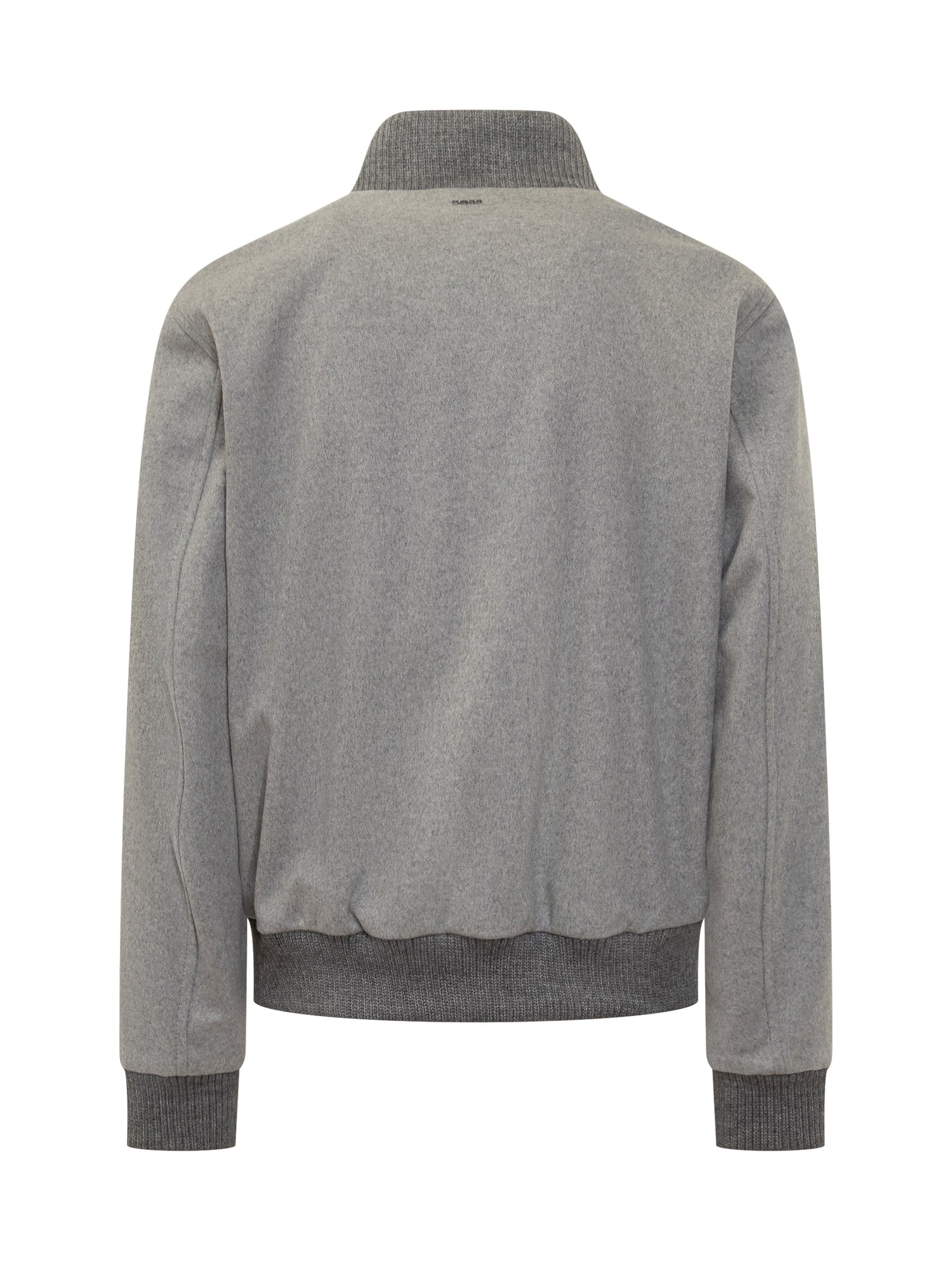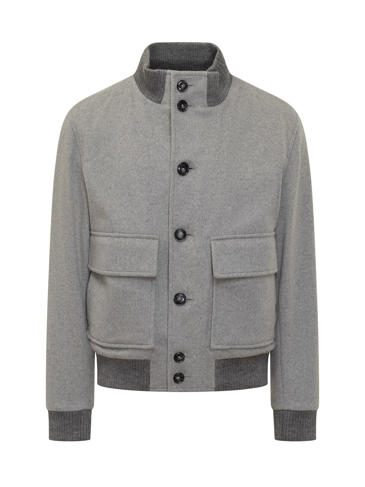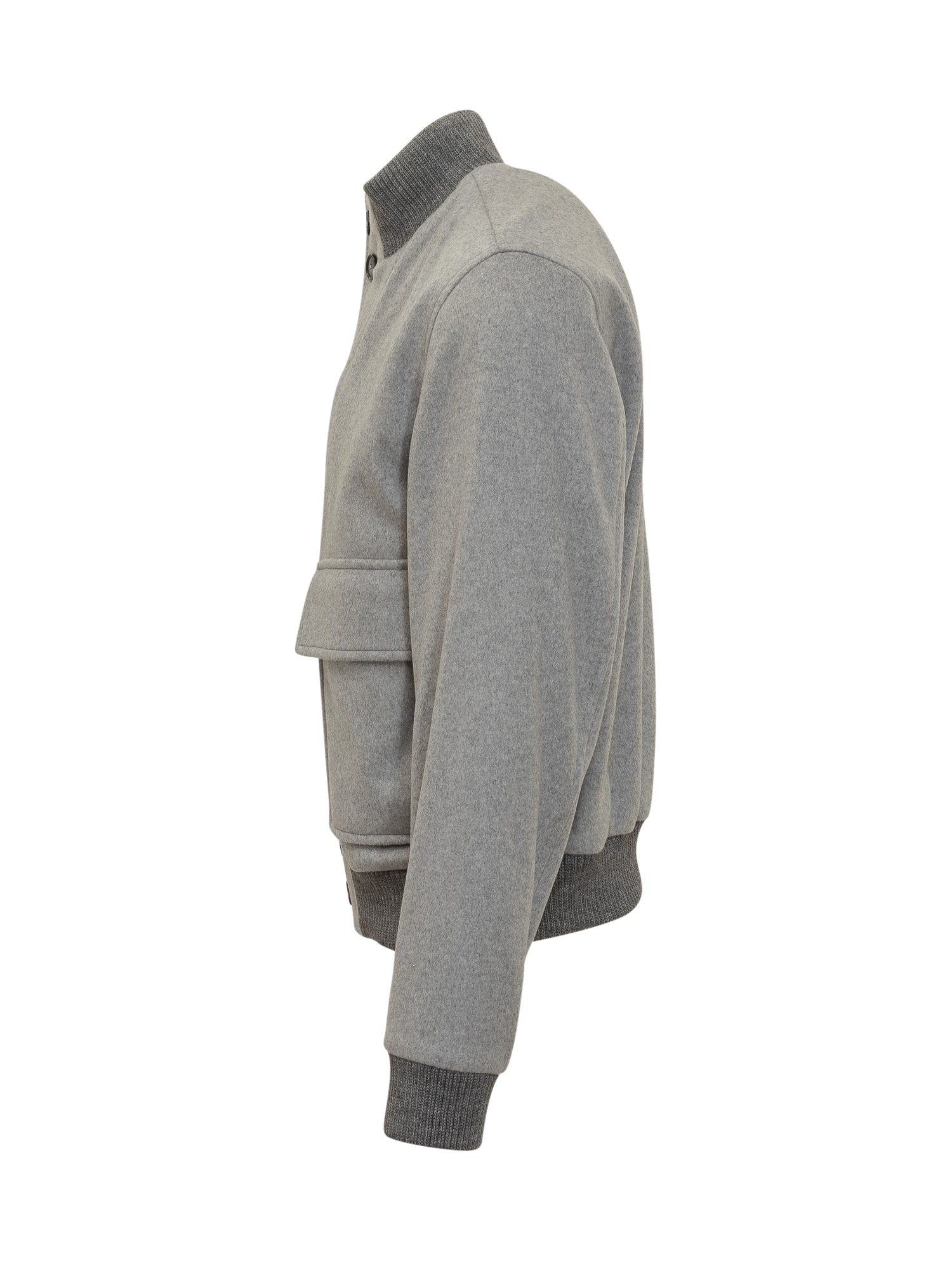 Boss grey wool jacket featuring button closure, ribbed stand collar and large front flap pockets.