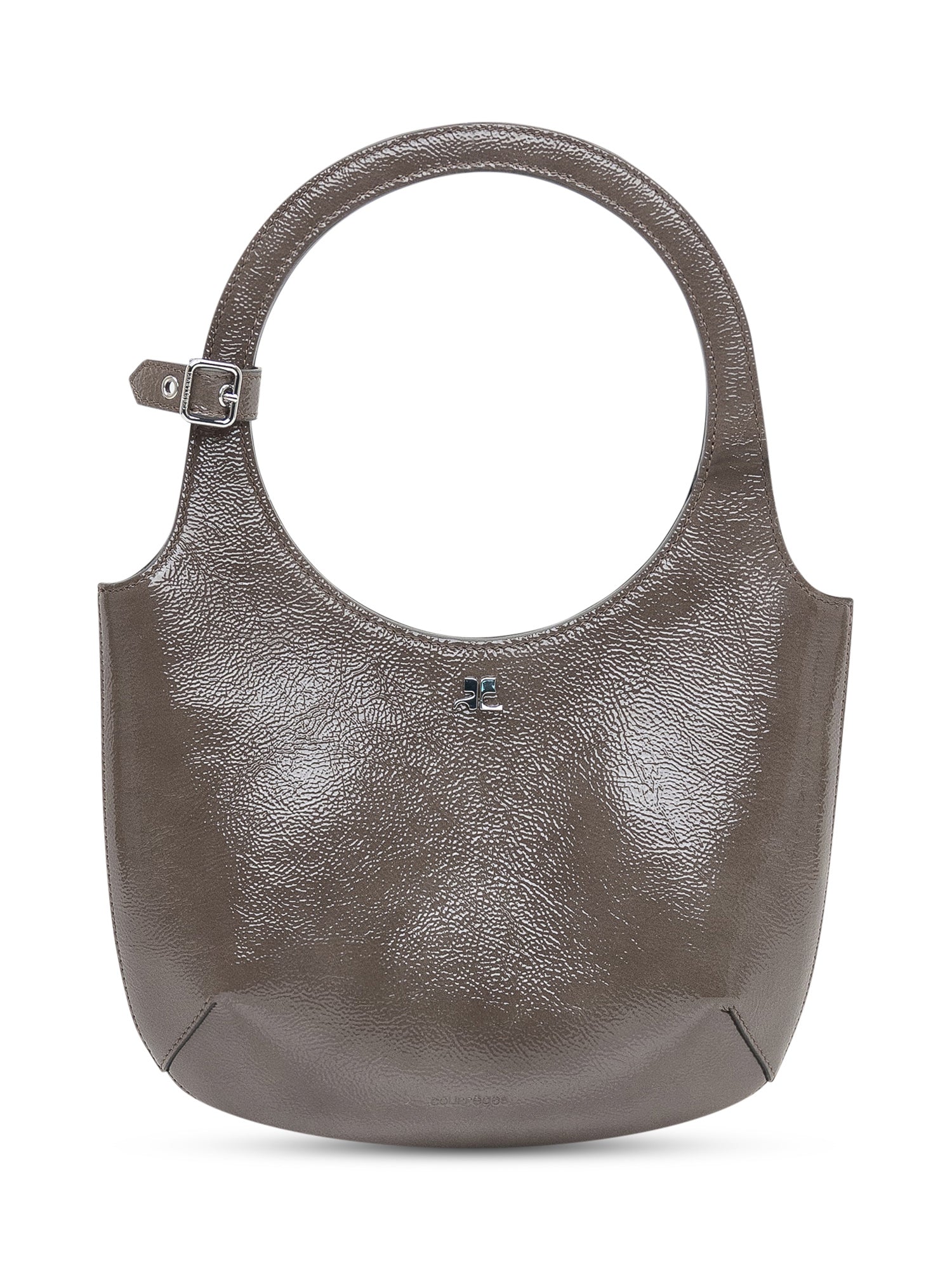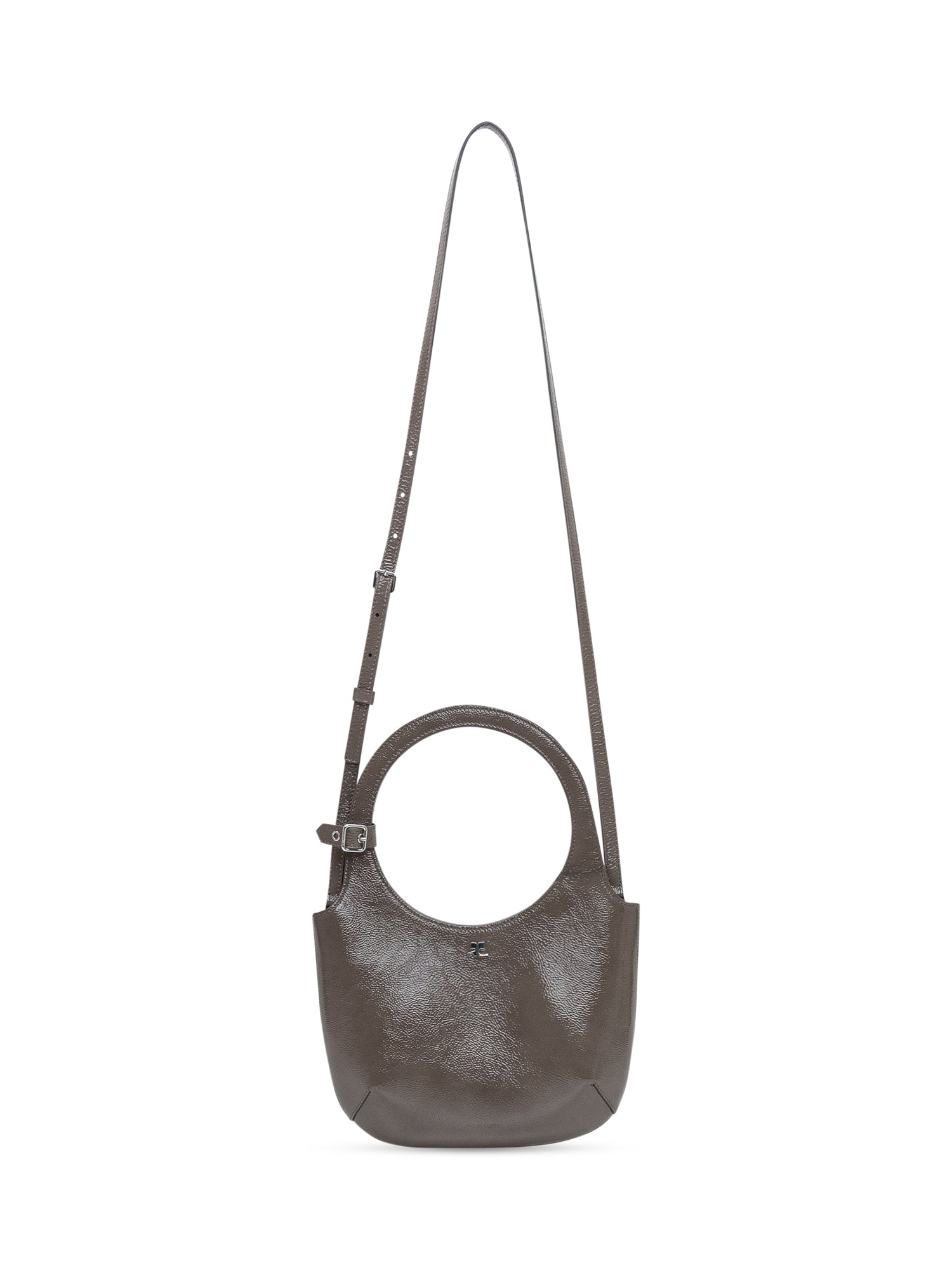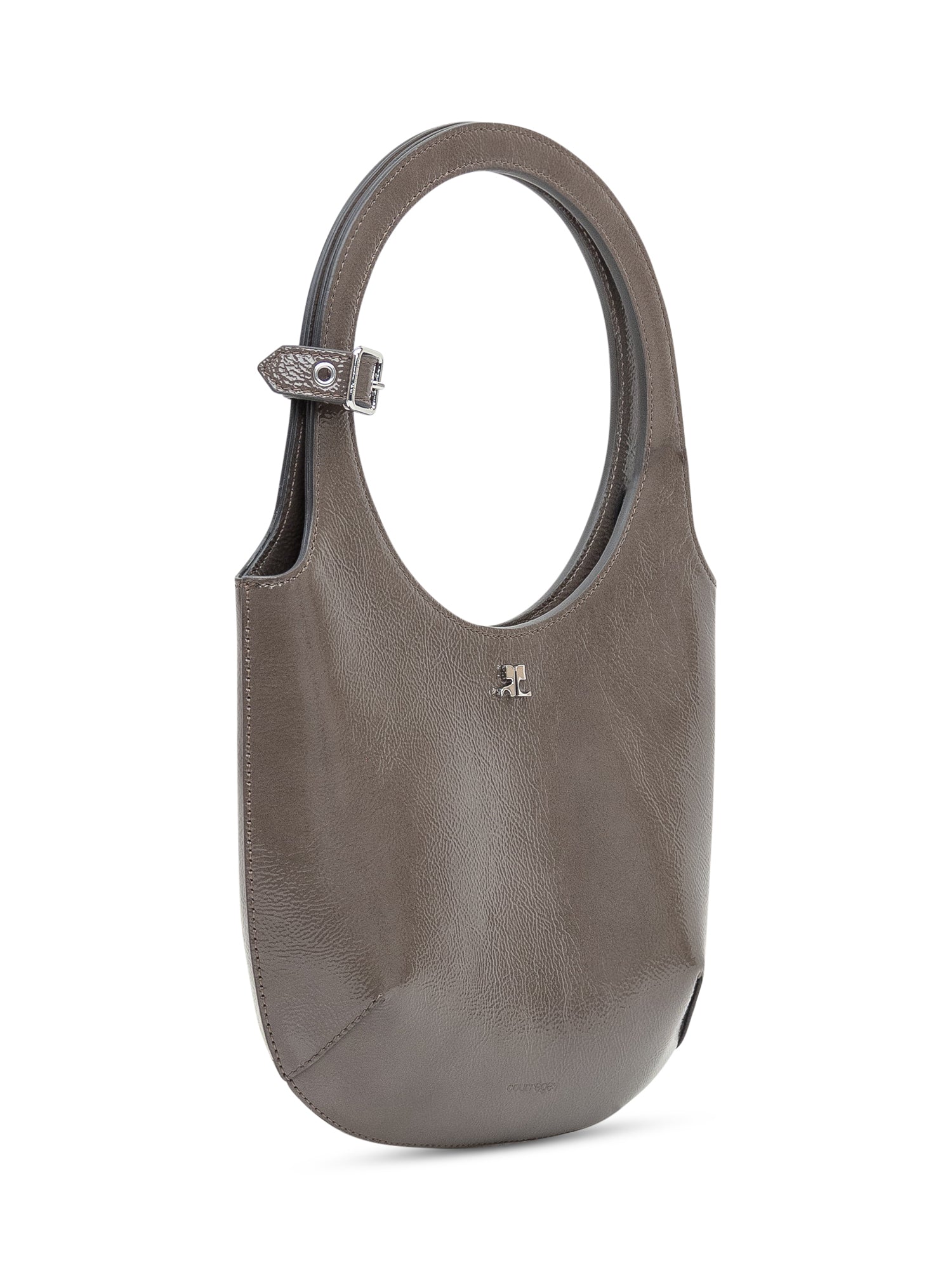 Courrèges Holy Naplack bag in grey patent leather featuring a circular handle and buckle closure. A sleek, iconic design.