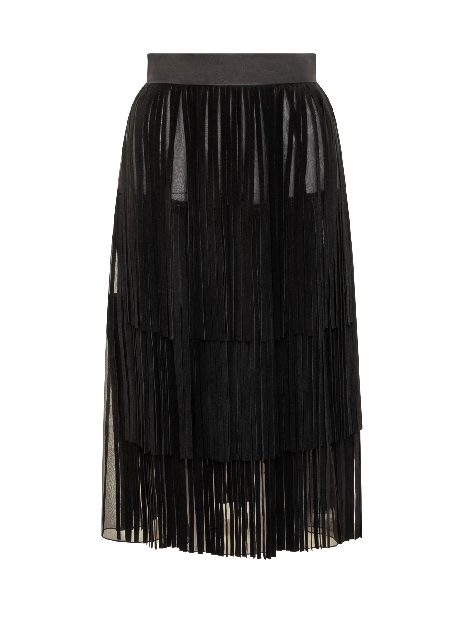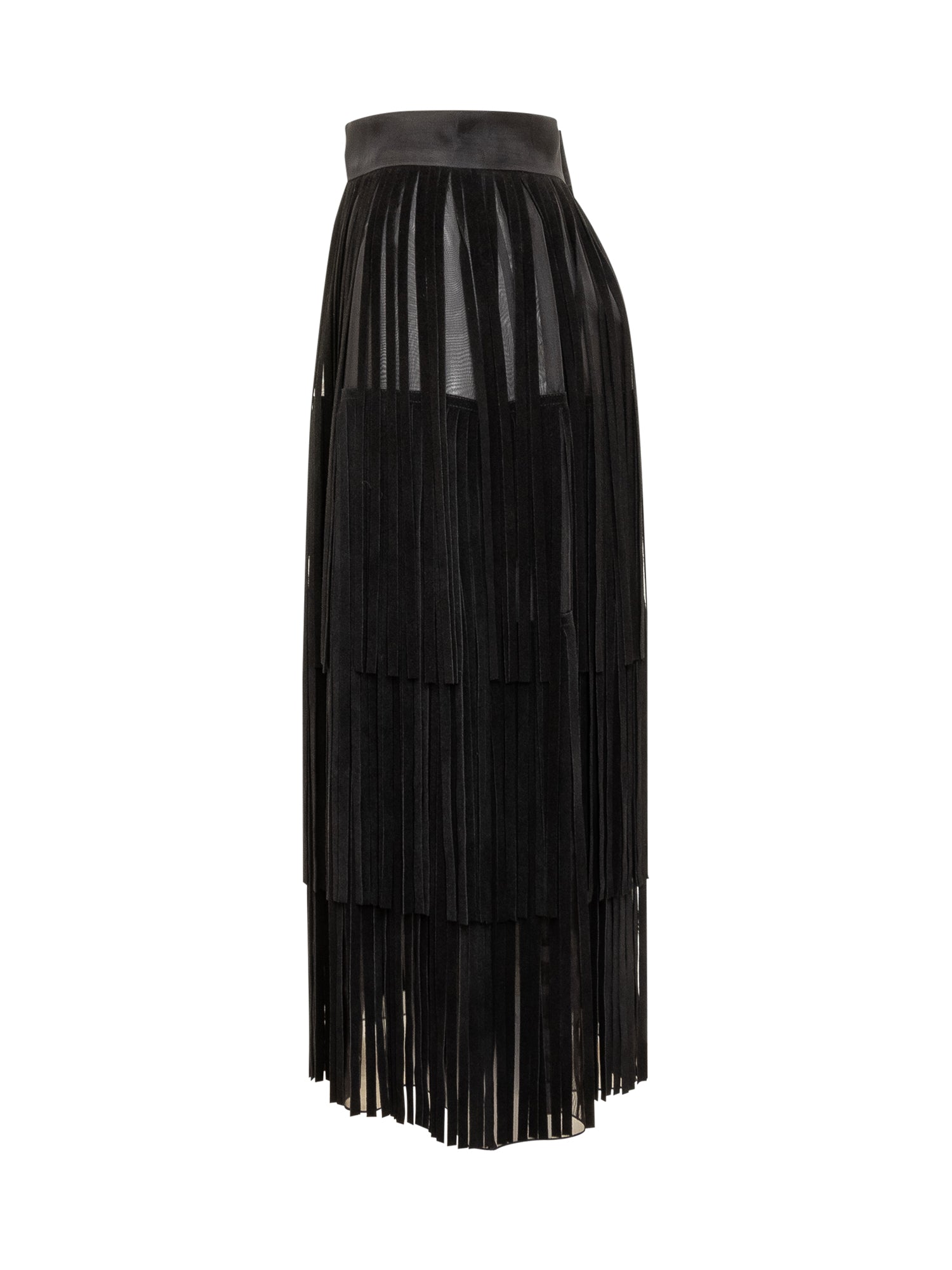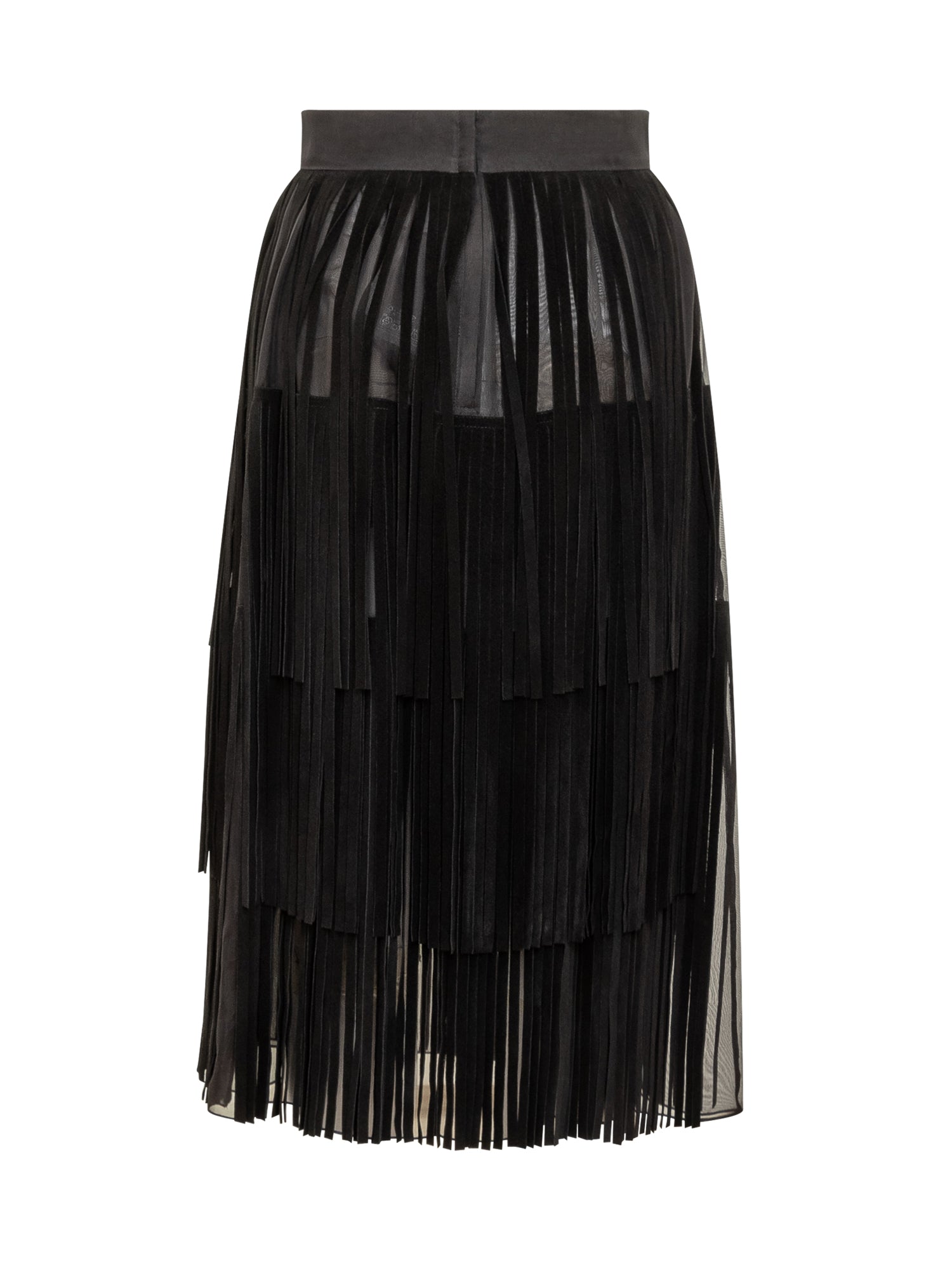 Dolce & Gabbana black tulle midi skirt featuring layered fringes for a flowing, lightweight effect.