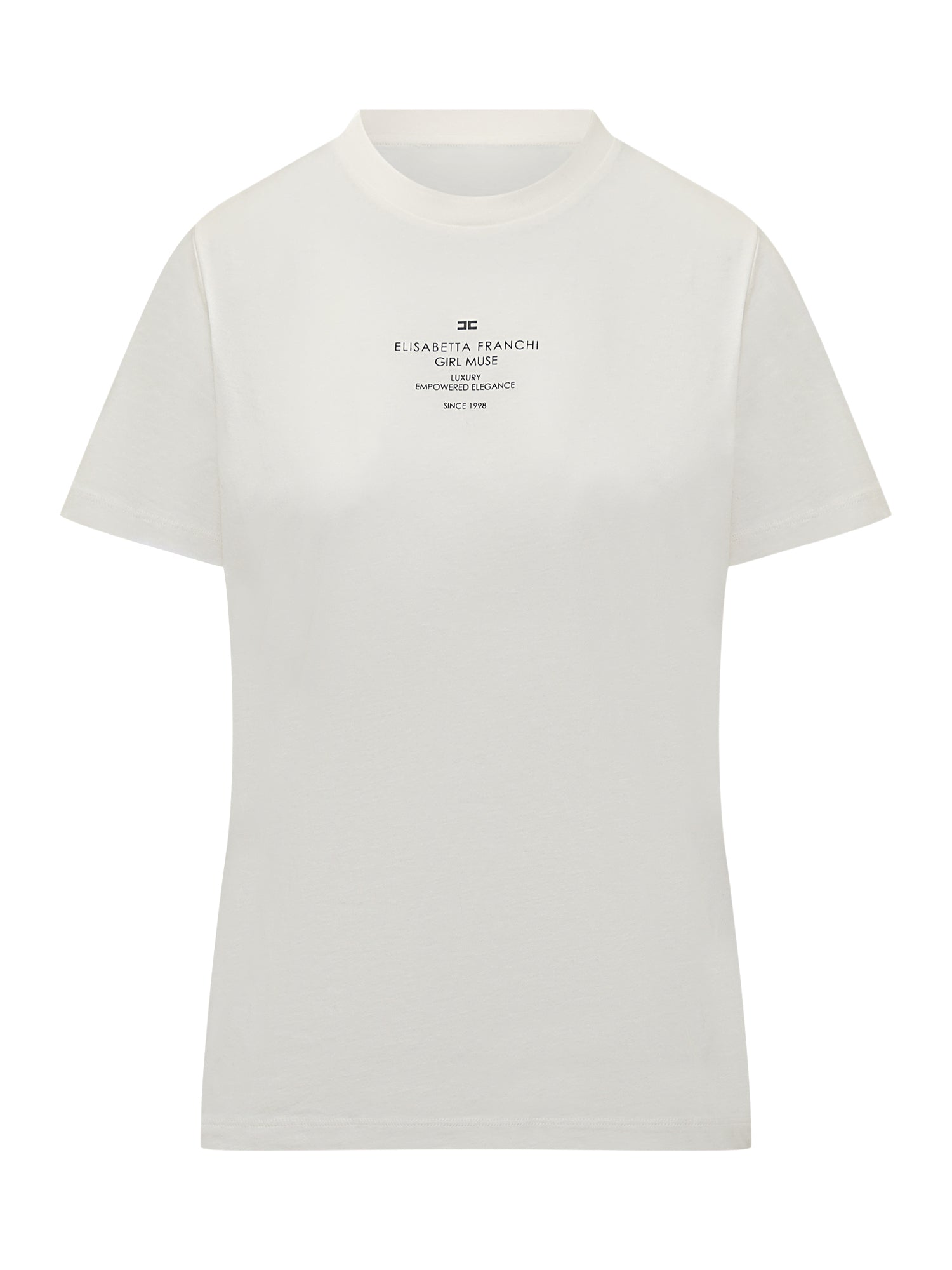 White Elisabetta Franchi T-shirt with central GIRL MUSE print and black text details.