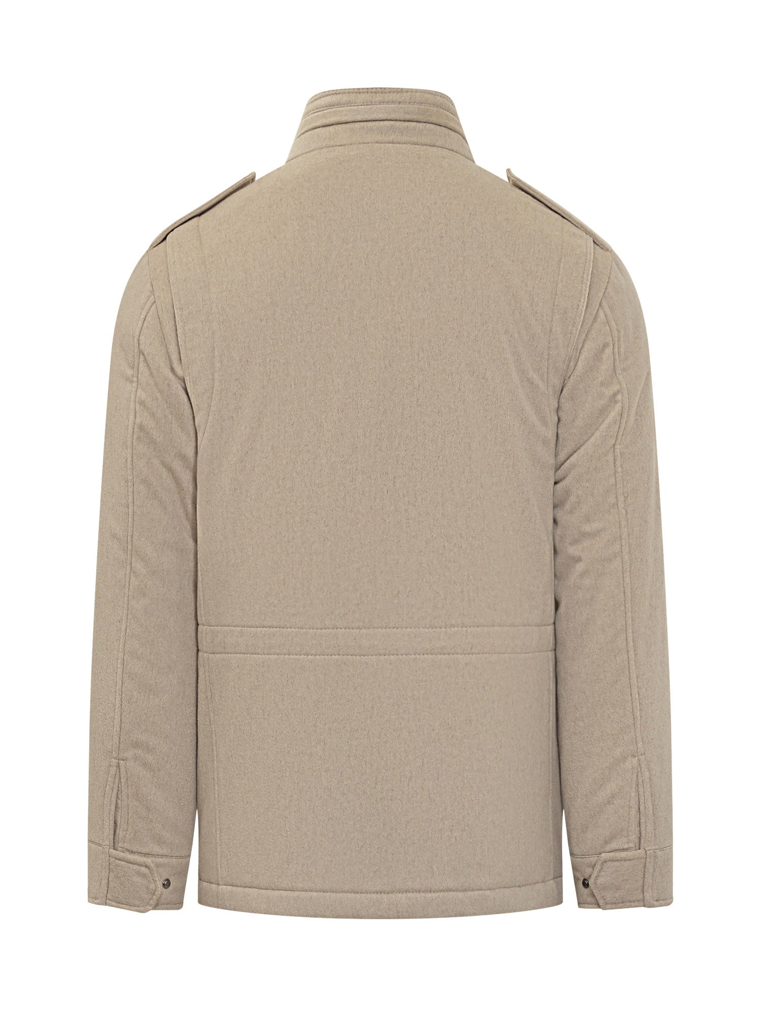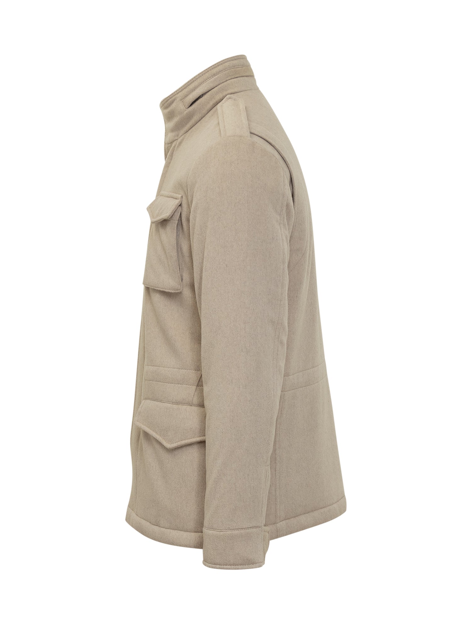 Esterno military-style jacket with stand-up collar, concealed closure and four flap pockets.