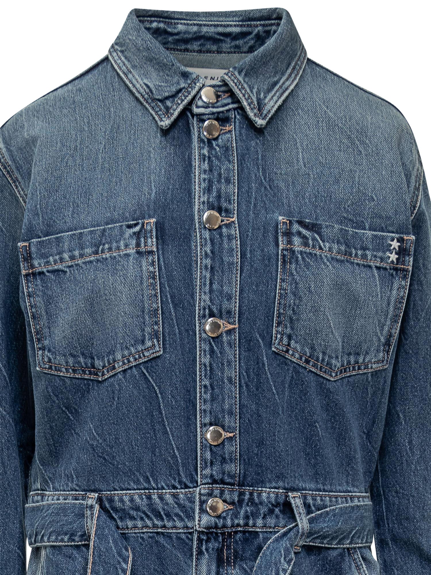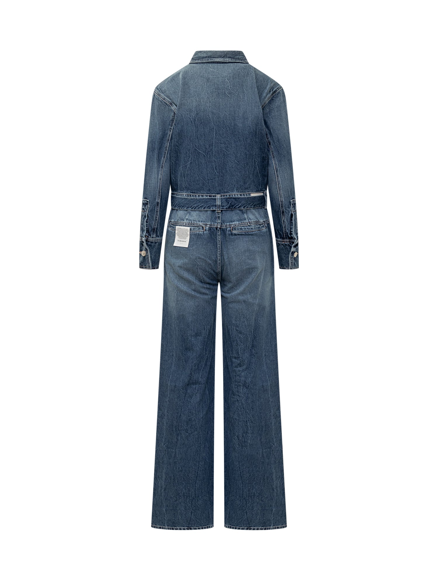 Icon Denim Indie jumpsuit in blue denim with front button closure and matching waist belt. Relaxed fit and wide leg.