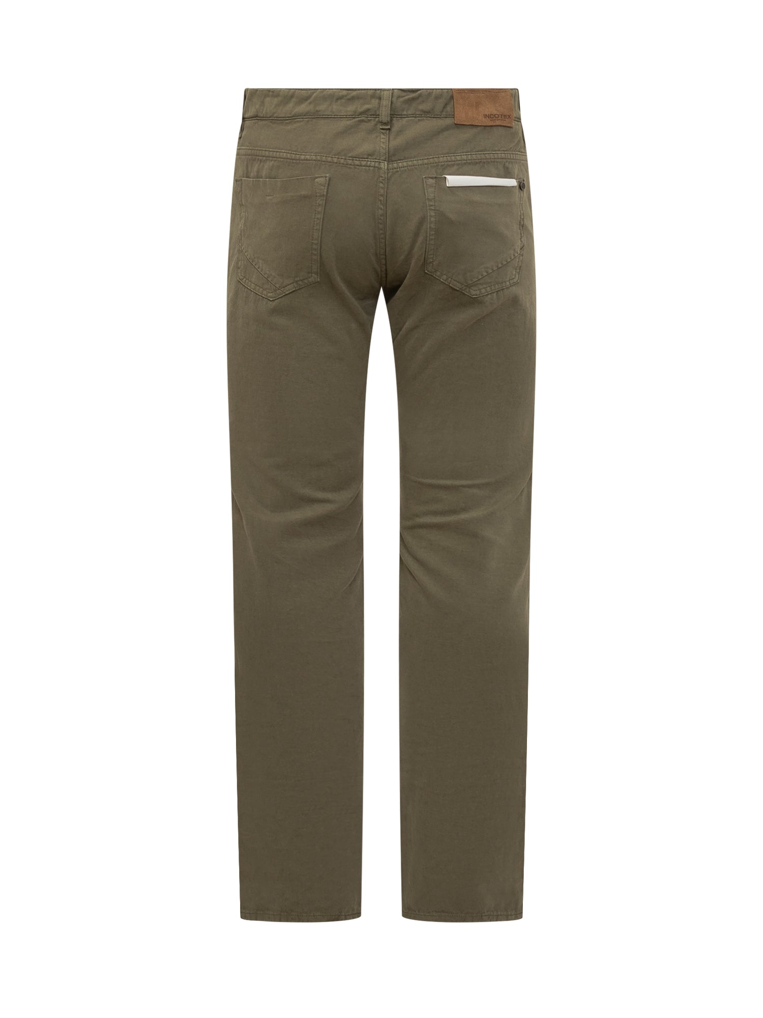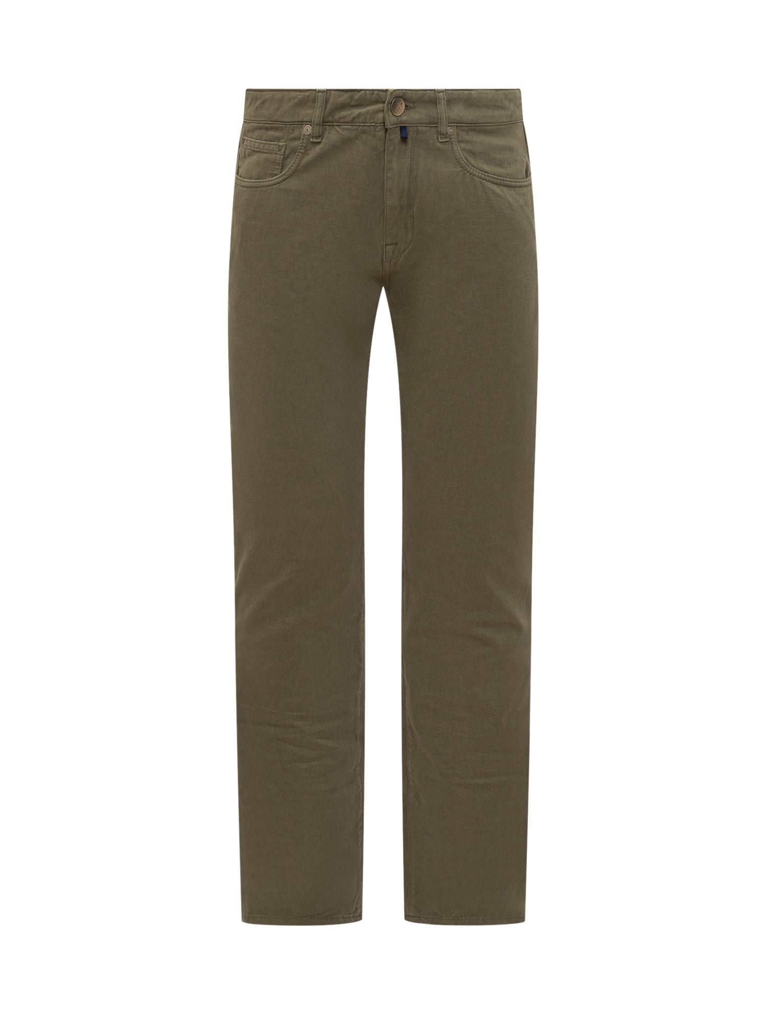 Incotex military green cotton jeans with regular fit and five-pocket design. Button and zip closure.
