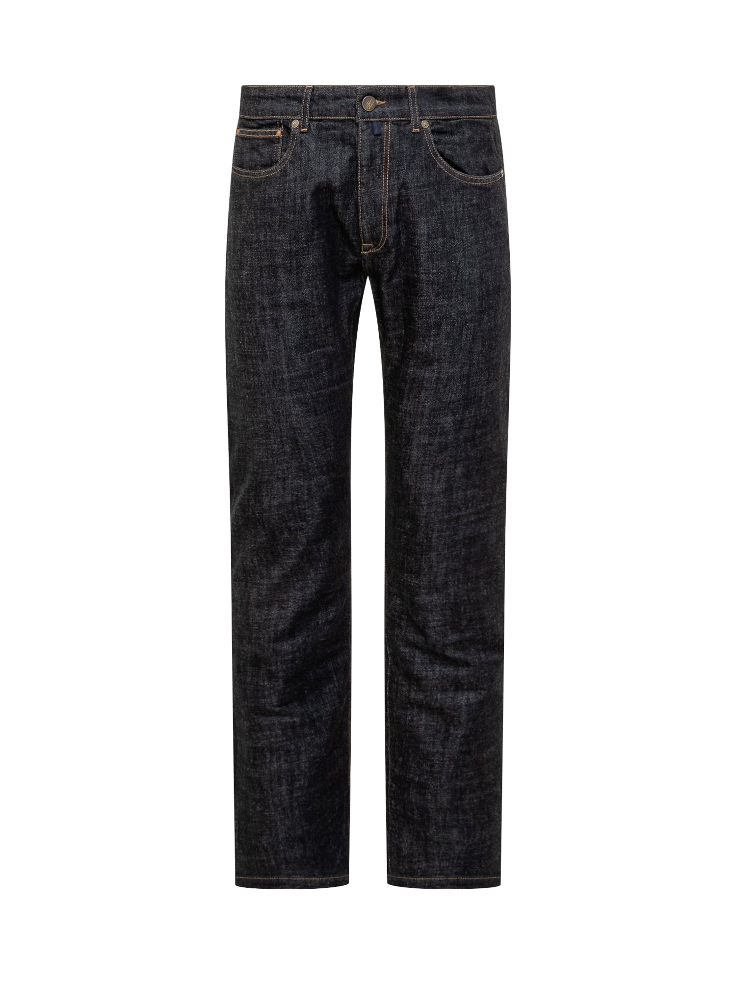 Incotex dark blue denim jeans with contrast stitching. Straight fit with button and zip closure.