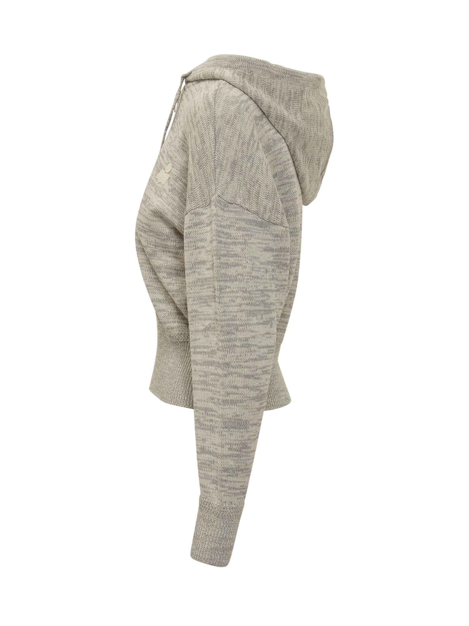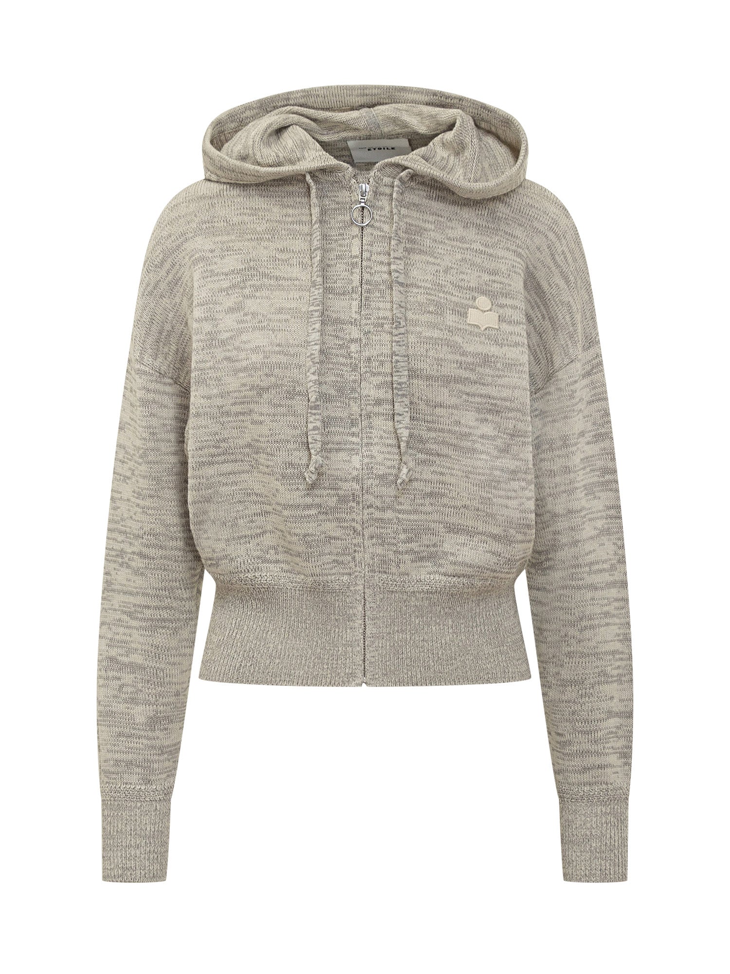 Isabel Marant Étoile grey melange cotton and wool hoodie featuring a zip closure, drawstring hood, and tonal logo on the chest.