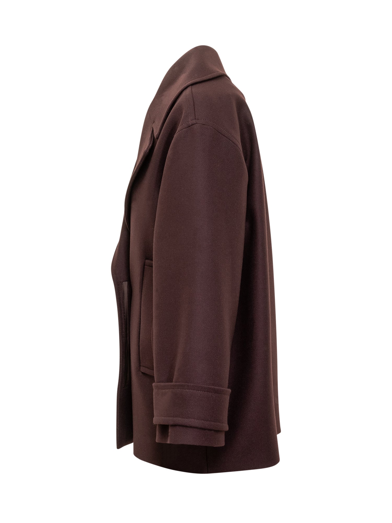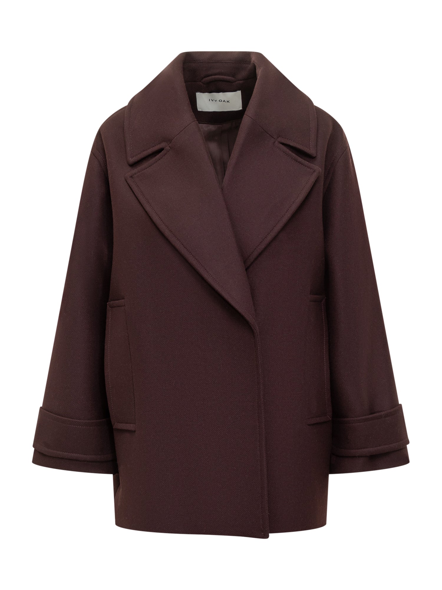 Ivy Oak oversized wool coat in bordeaux with wide lapels and side pockets.