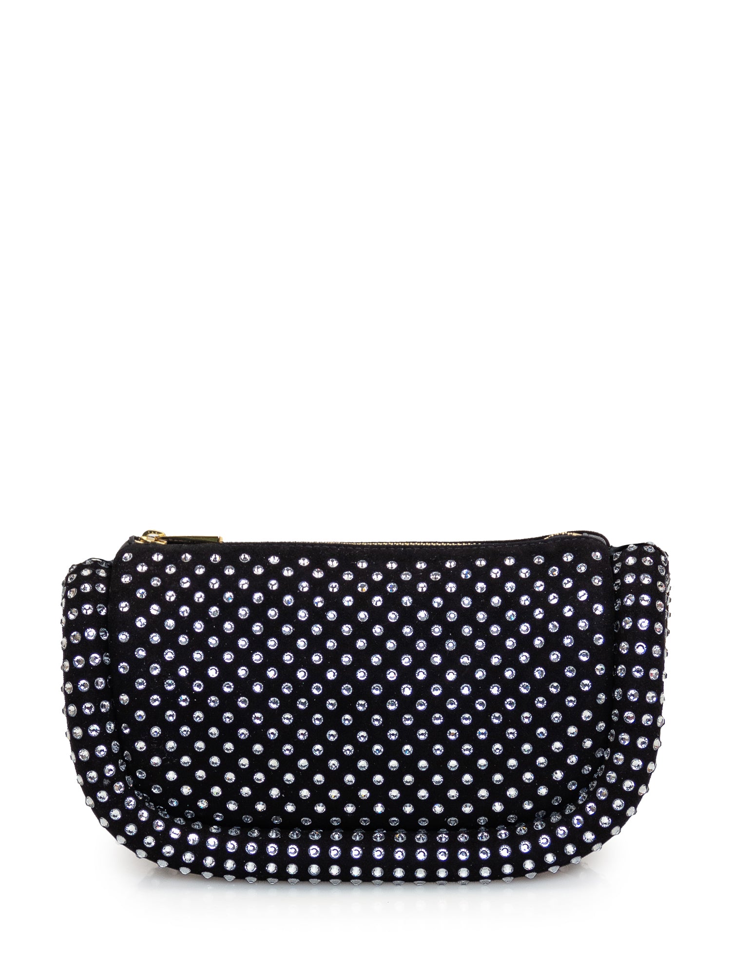 Black suede shoulder bag. Zip closure. Logo on the side. All-over crystals.