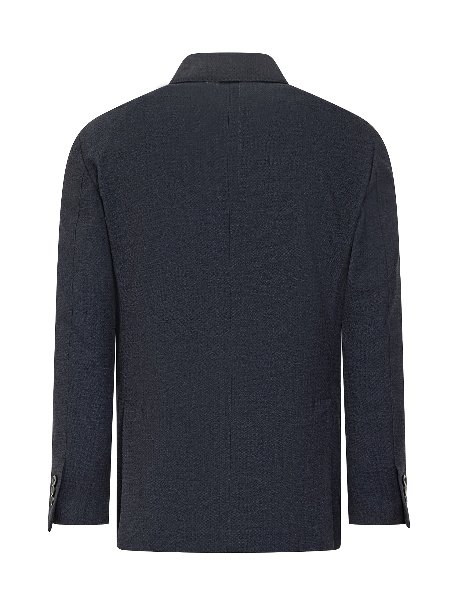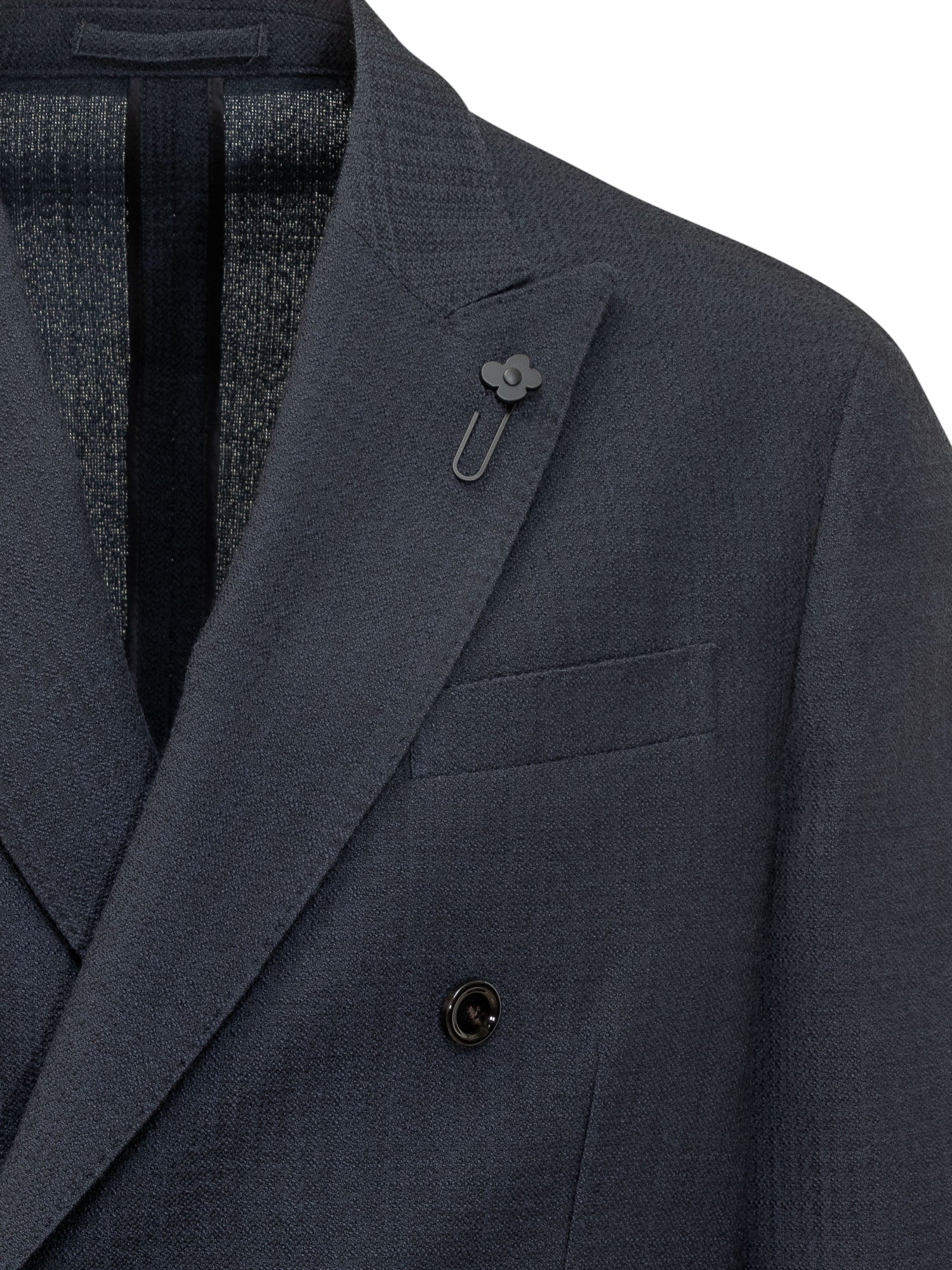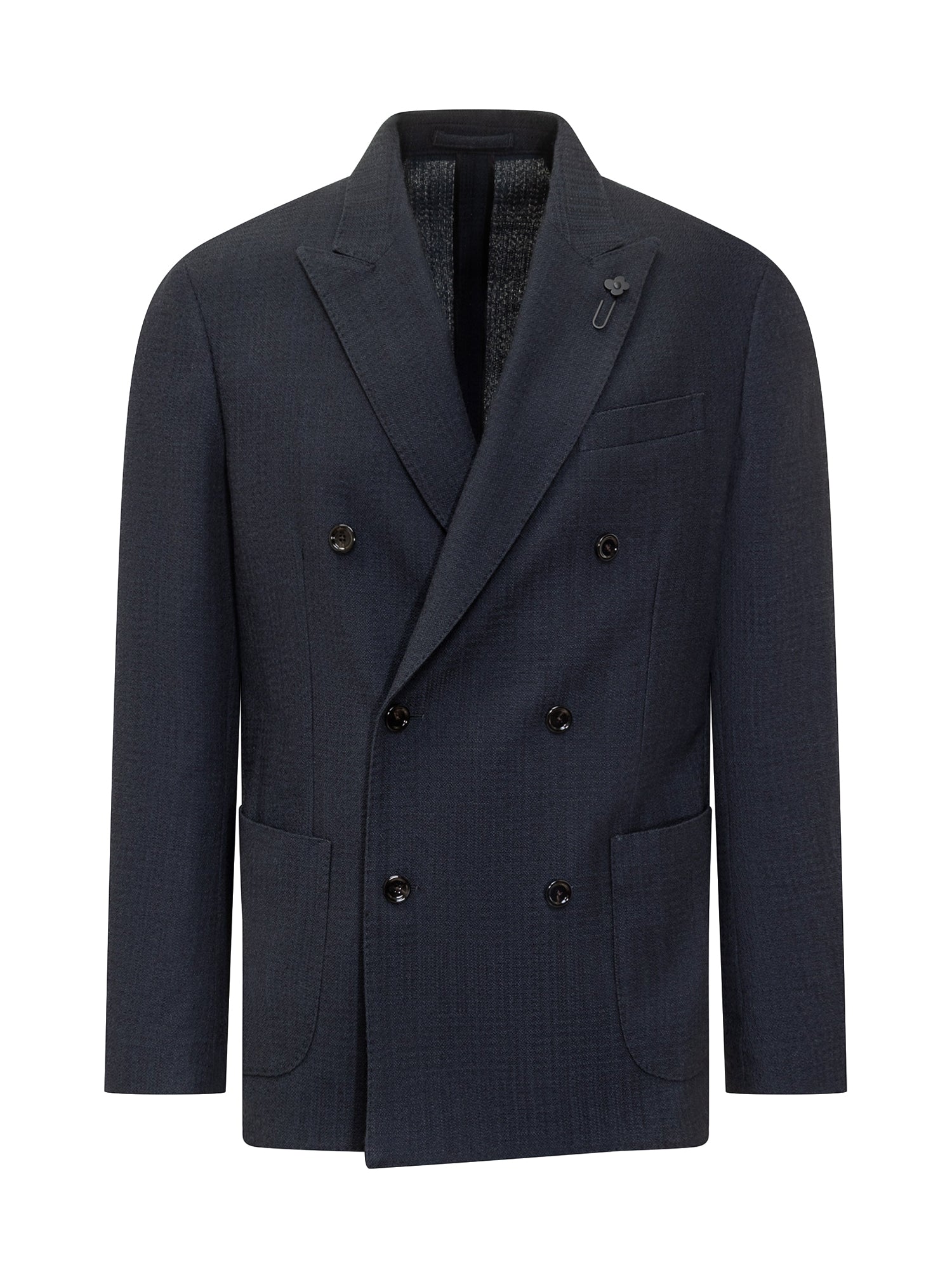Lardini double-breasted blazer in blue wool with refined texture. Tailored cut with classic lapels, applied pockets, and double-breasted closure.