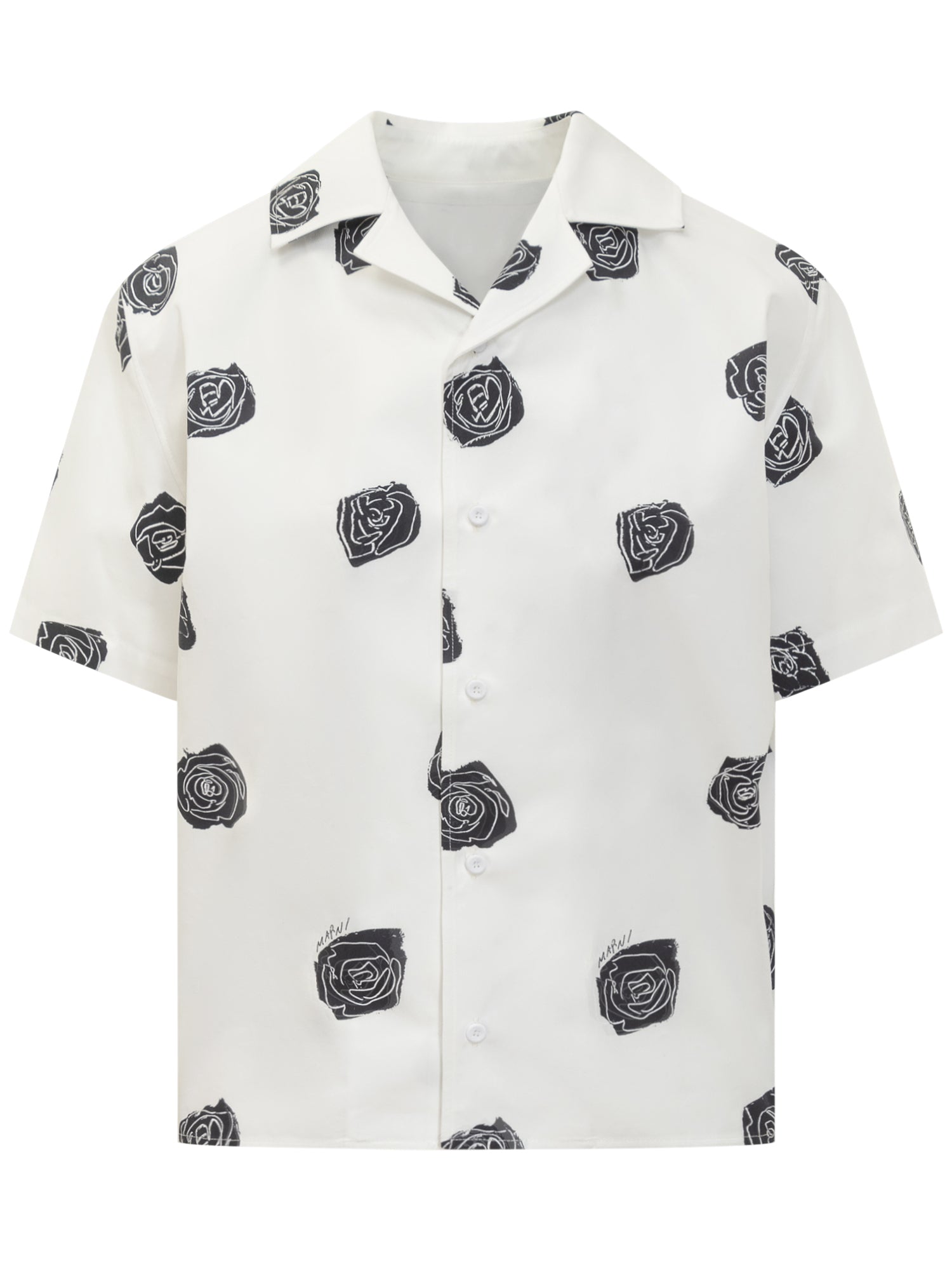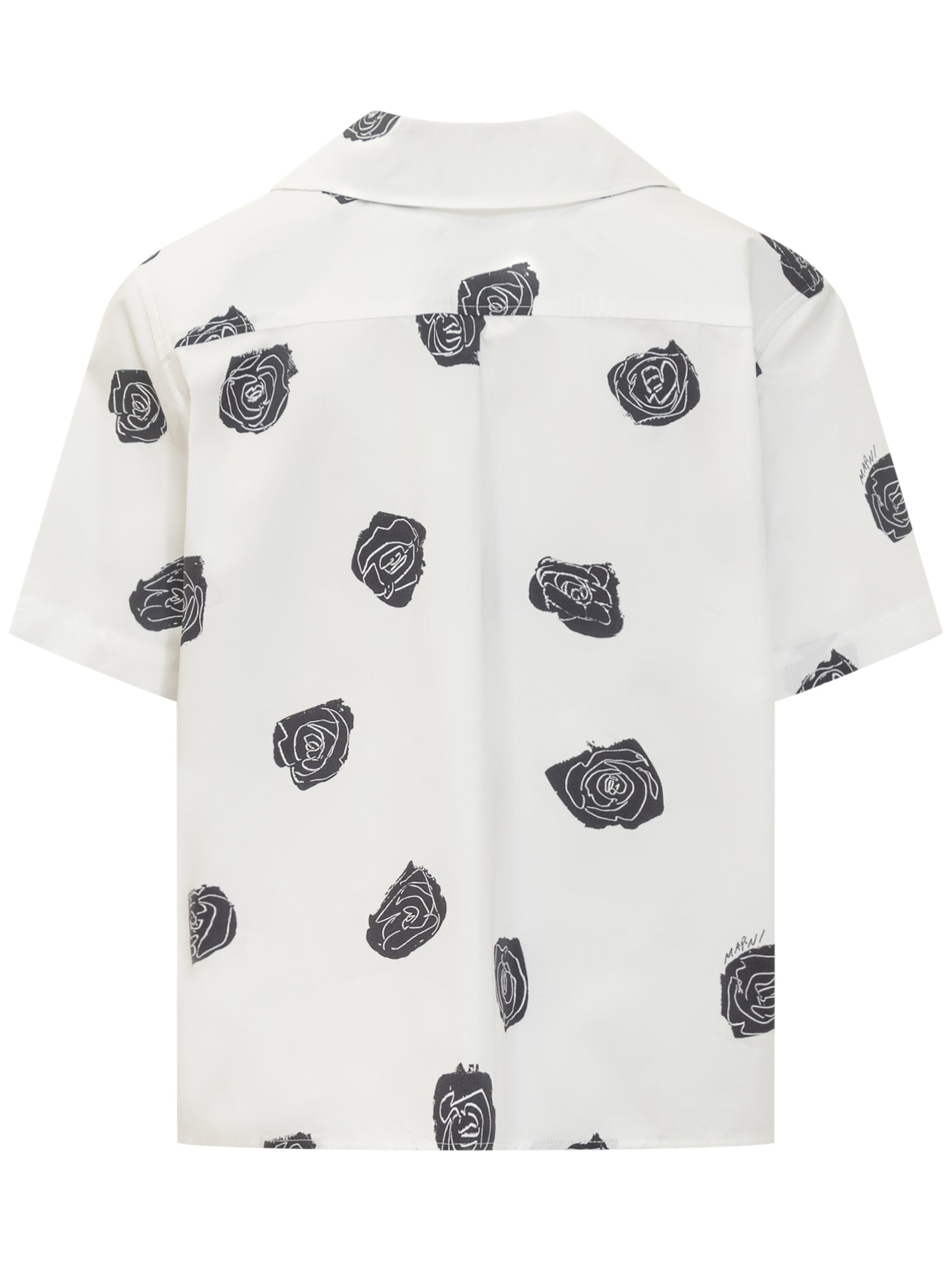 White cotton shirt. Cropped fit. Classic collar. Floral print. Button fastening.