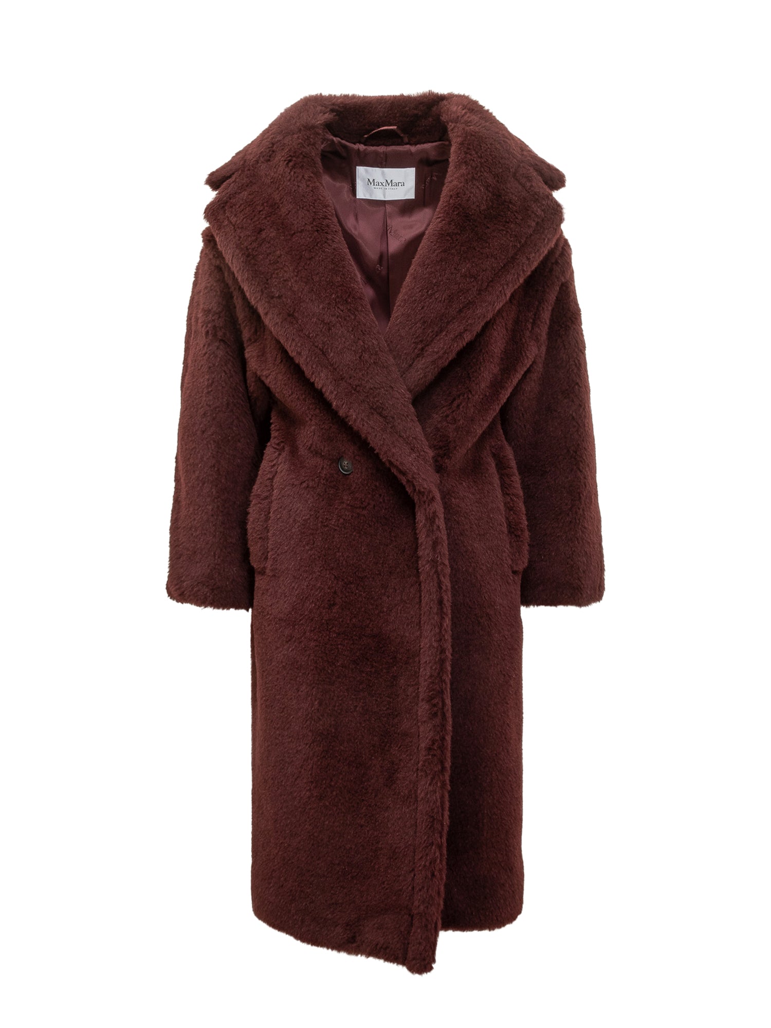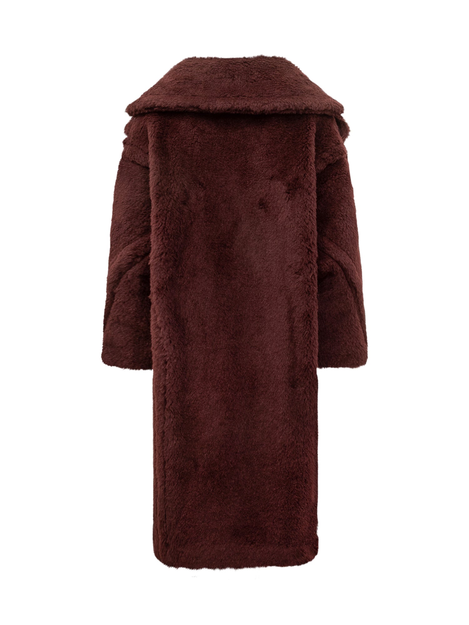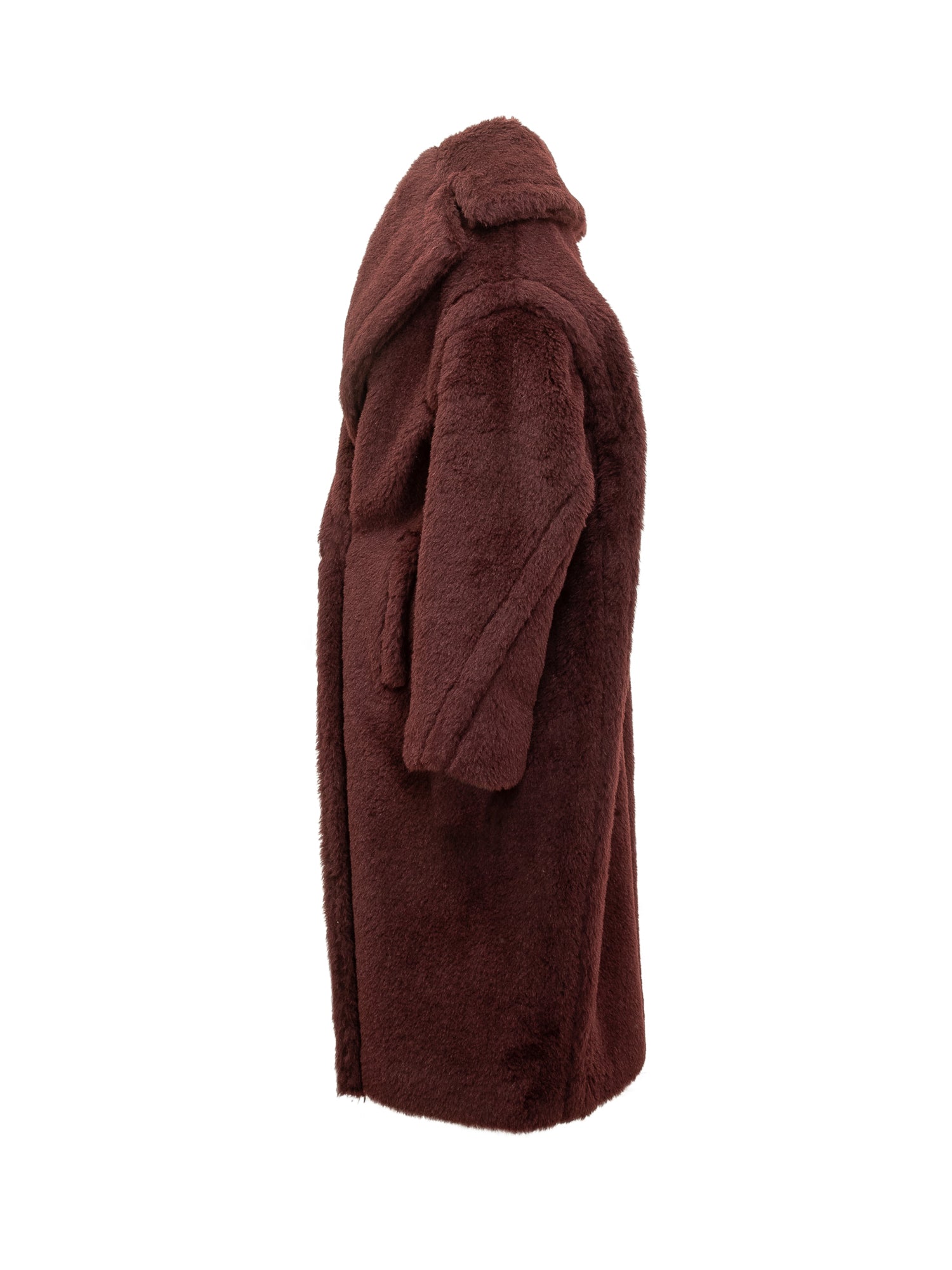 Max Mara Tedgirl coat in camel and silk teddy fabric, in deep burgundy. Featuring wide lapels and an oversized fit.