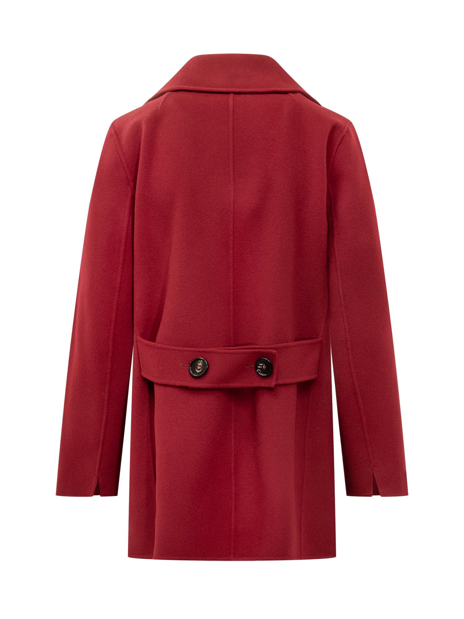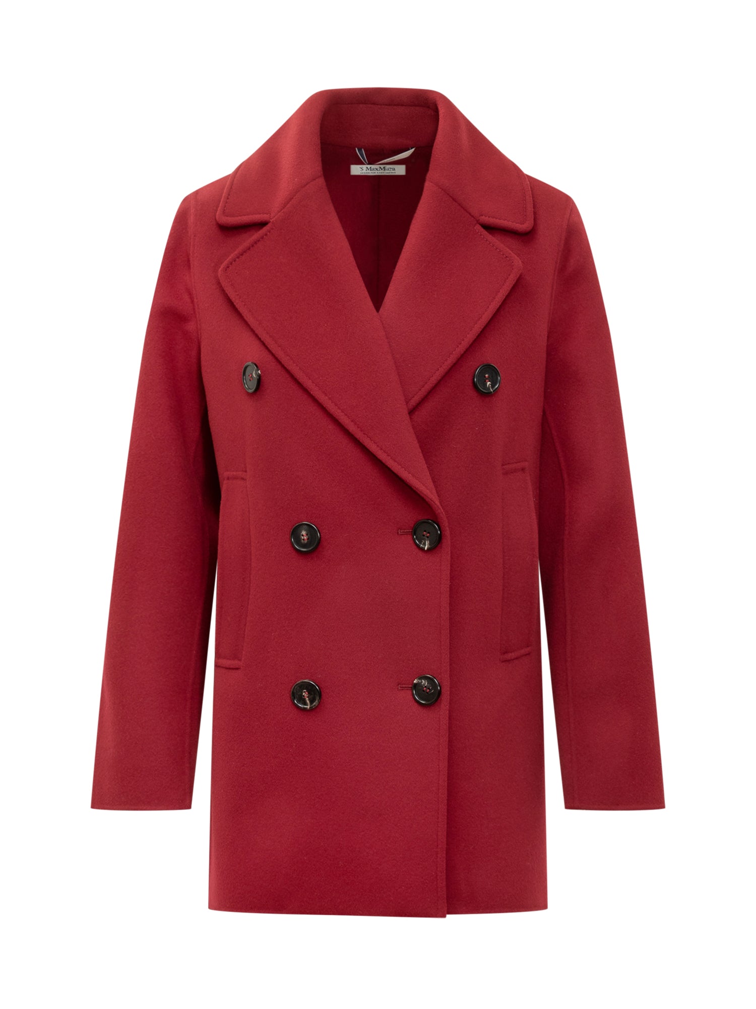 Max Mara Studio red wool double-breasted coat with classic lapels and black buttons.