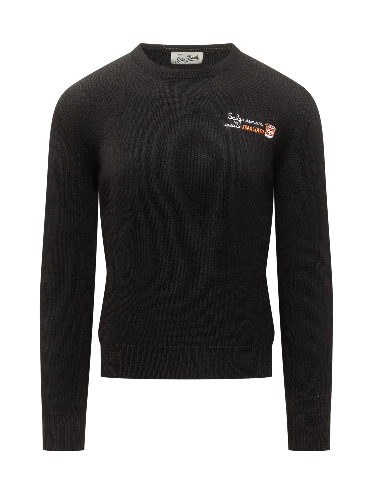 Saint Barth black sweater with chest embroidery and witty Negroni Sbagliato lettering.