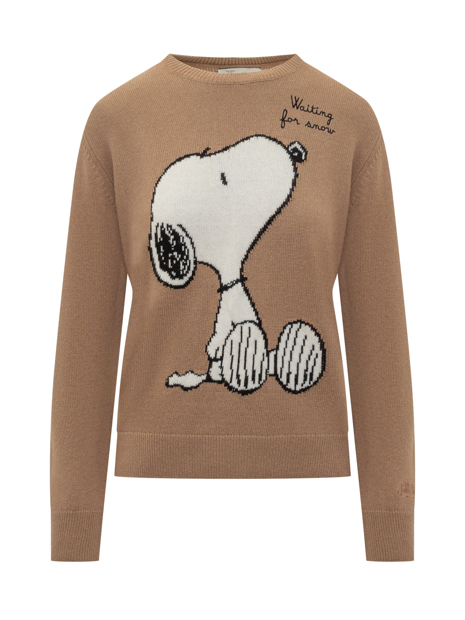 MC2 Saint Barth brown wool sweater with large Snoopy graphic and Waiting for Snow lettering.
