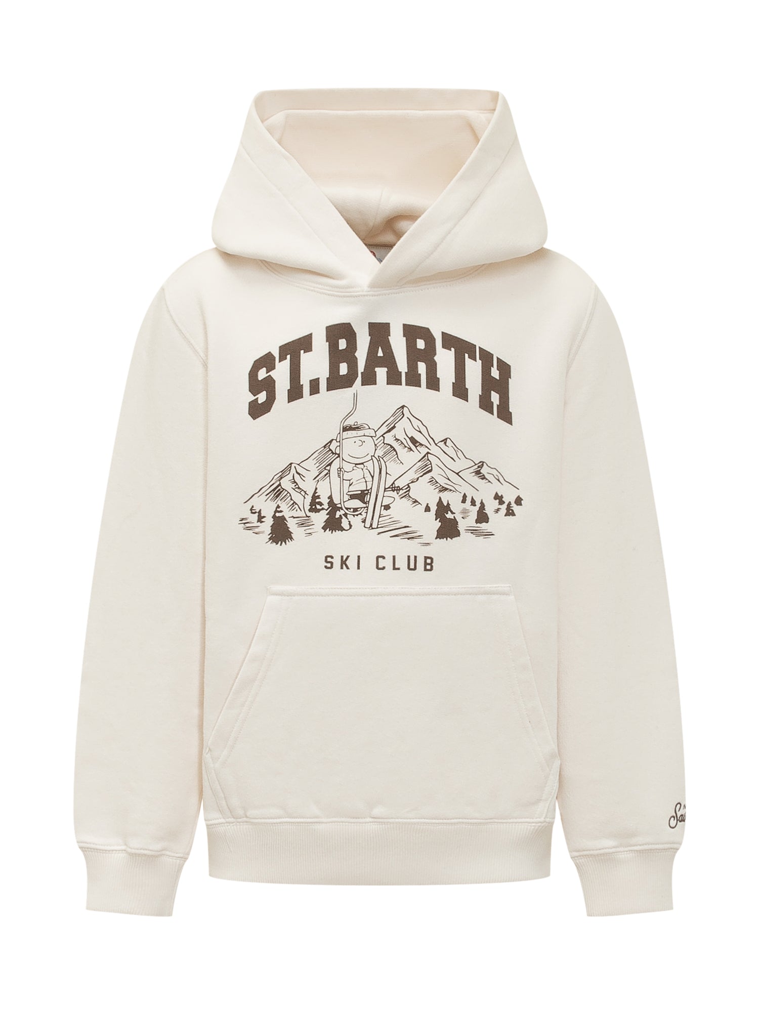 Soft hoodie with mountain-inspired Ski Club print, featuring a kangaroo pocket and elastic trims for a comfortable fit.