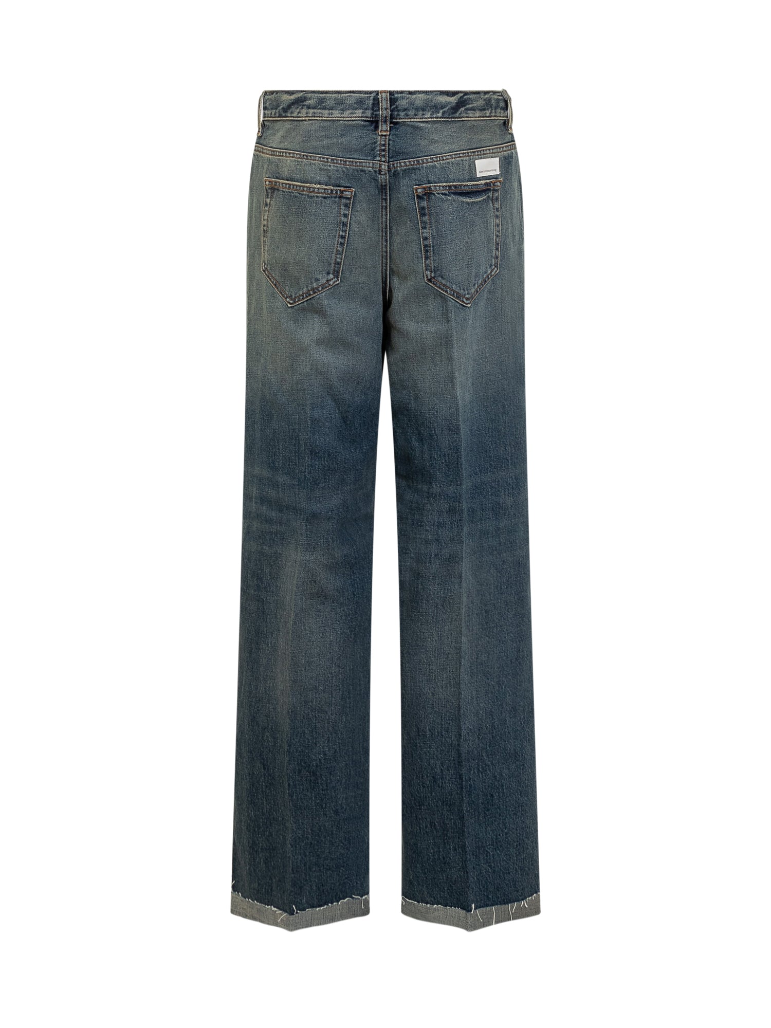 Nine in the Morning jeans in blue denim with vintage wash and subtle distressed details. Wide-leg design with mid-rise waist, button and zip closure, pockets, and frayed hem