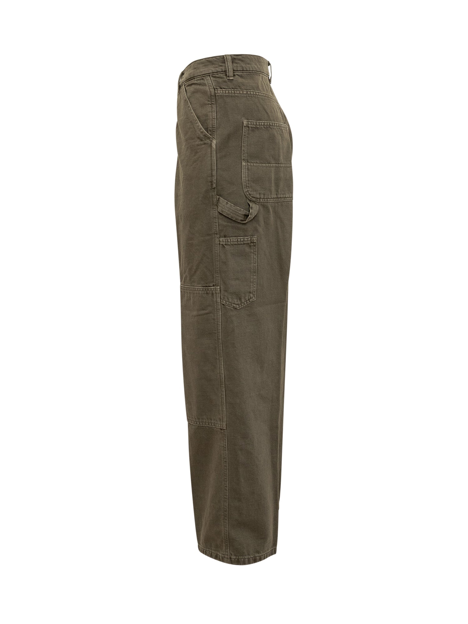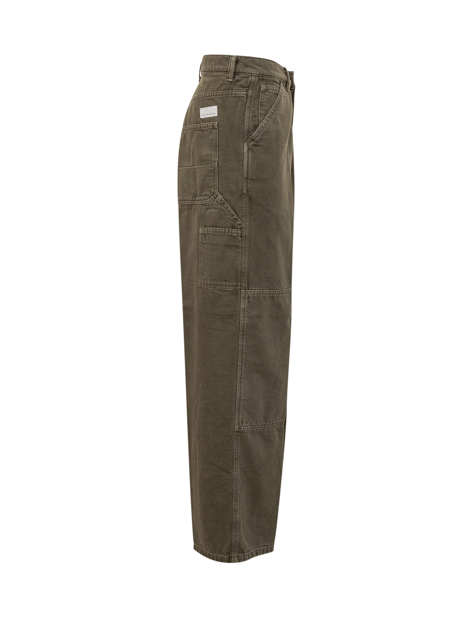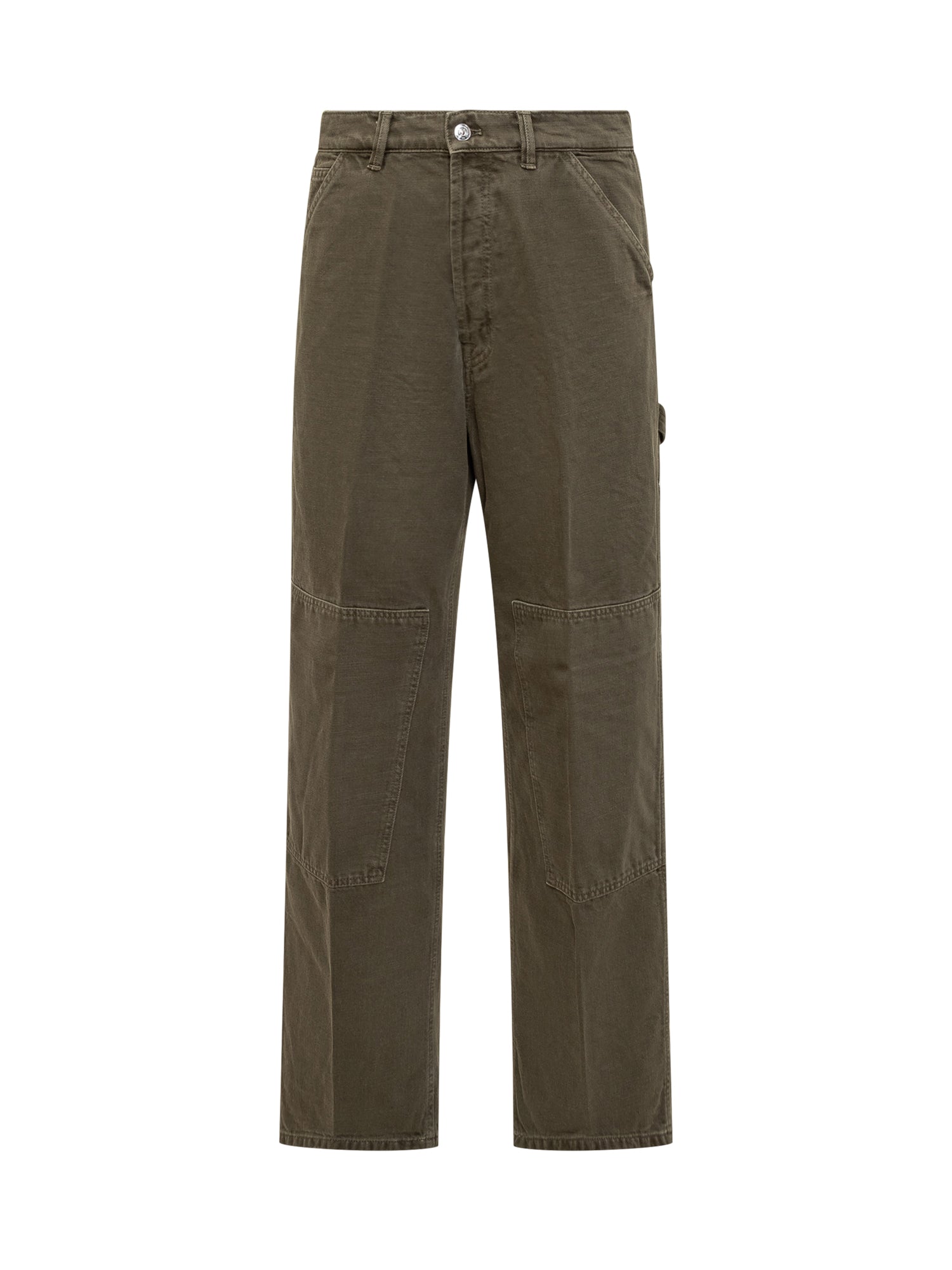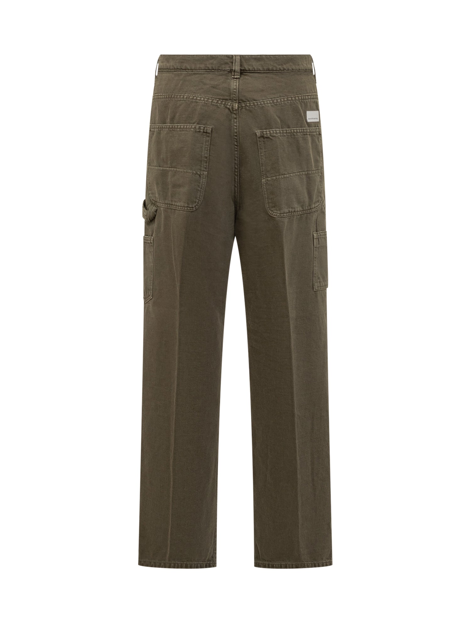 Nine in the Morning olive green cotton trousers with straight-leg fit and reinforced stitching. Side utility detail with button and zip closure.