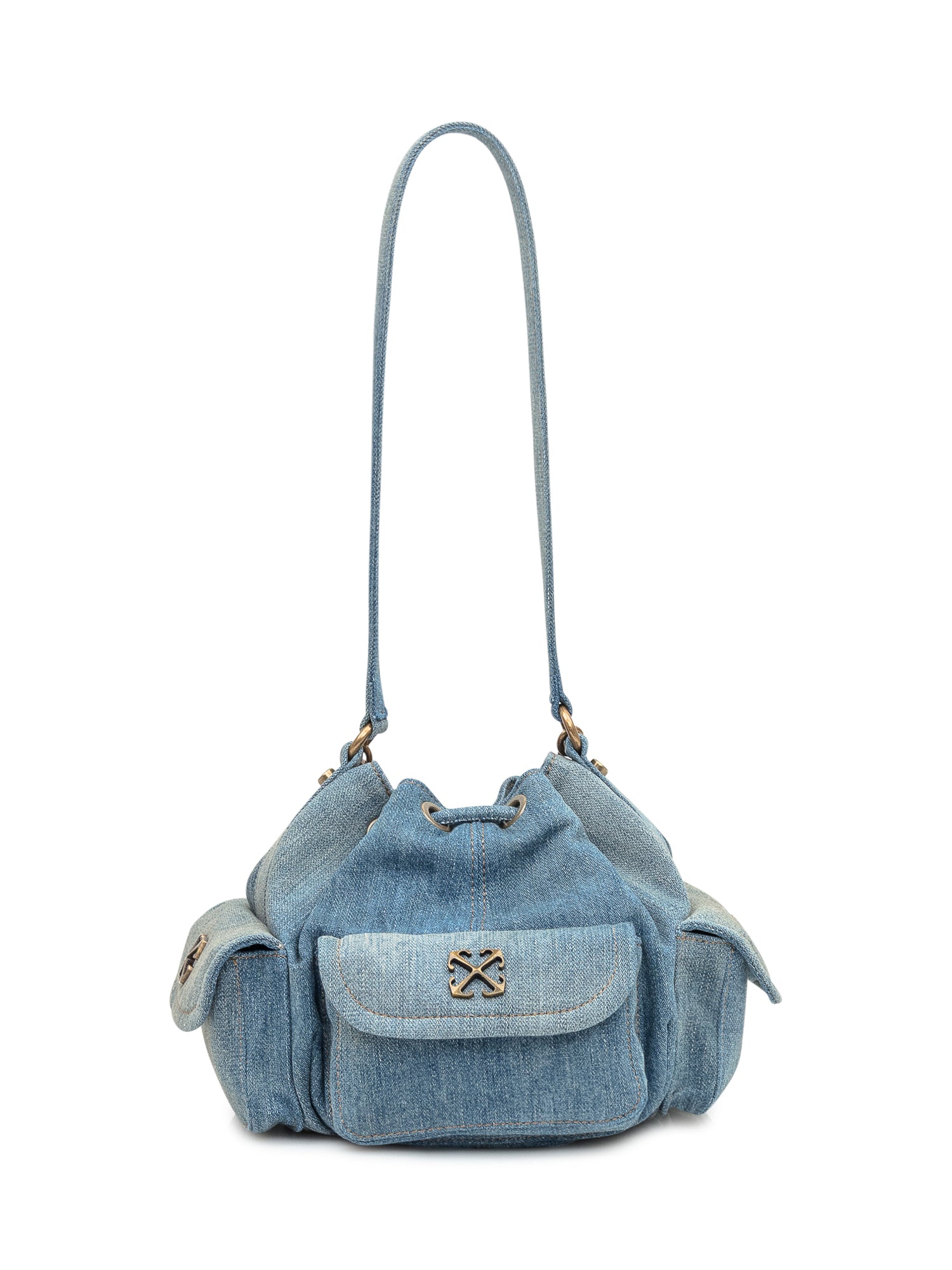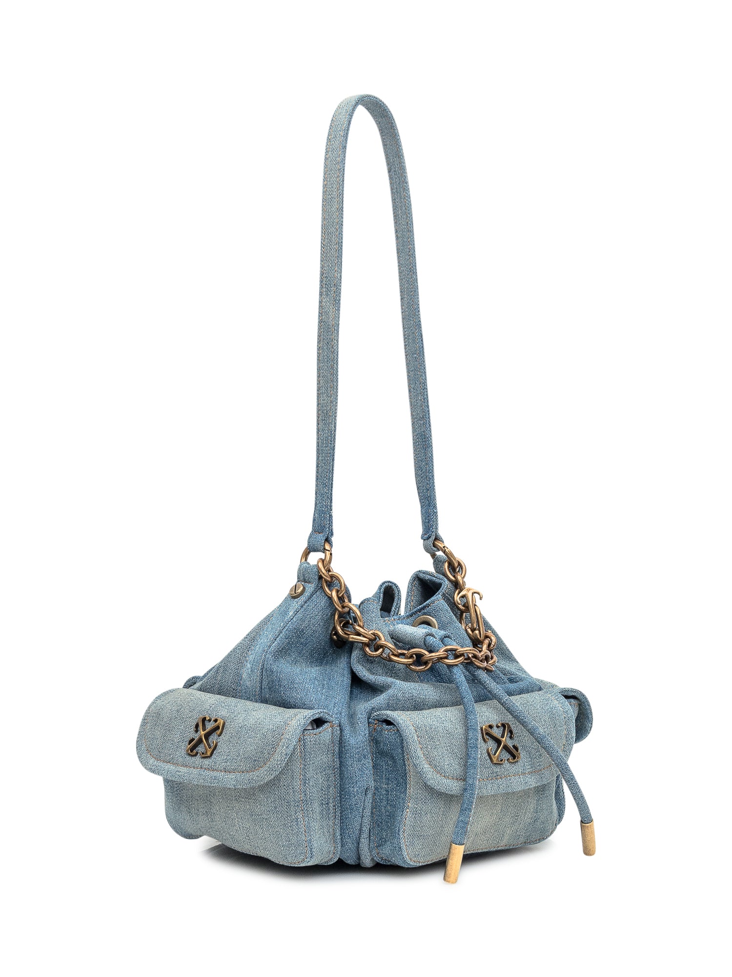 Off-White Dumbo Bucket bag in denim with gold-tone chain and front Arrow logo. Bucket silhouette with drawstring closure and side pockets.