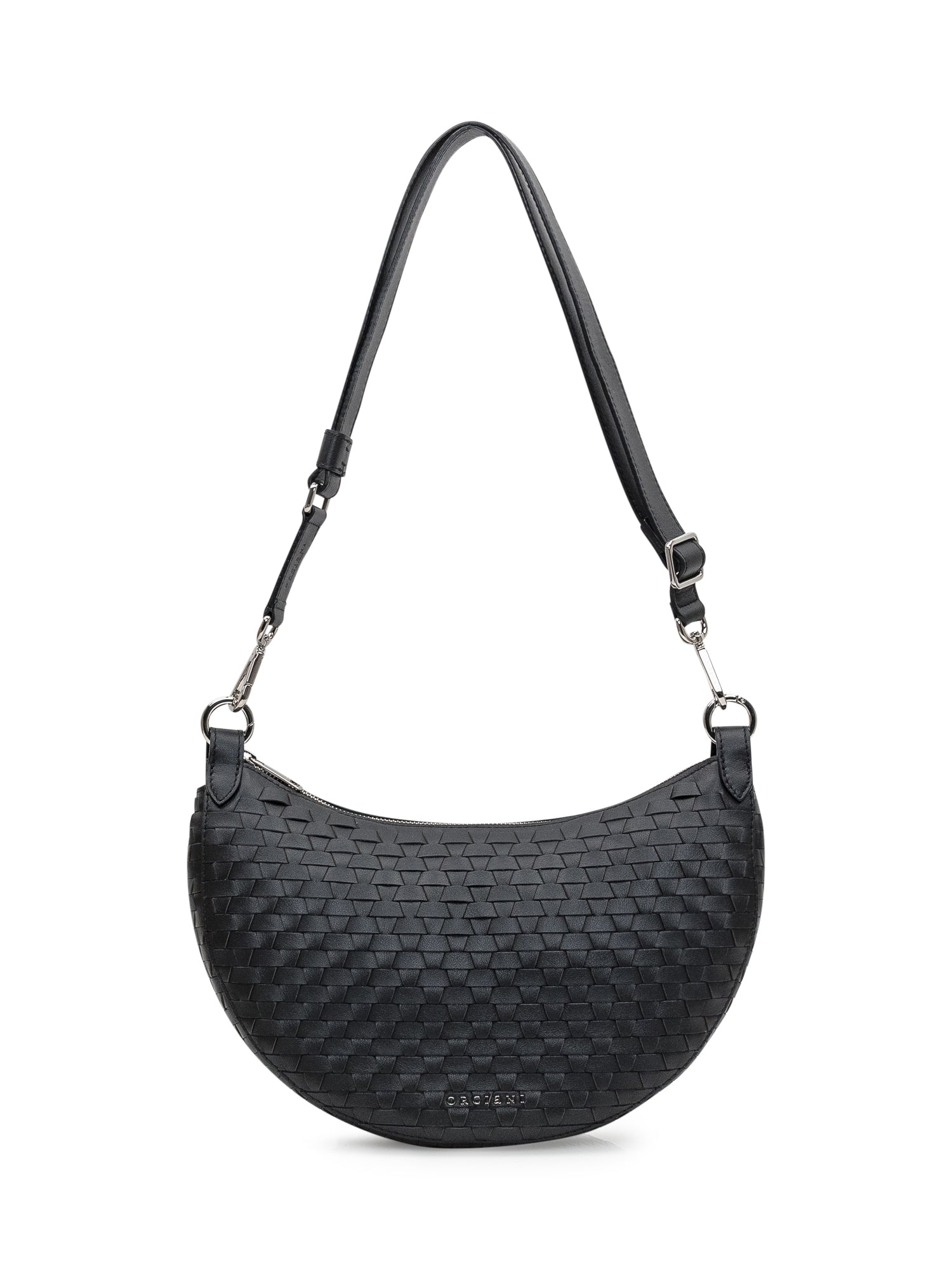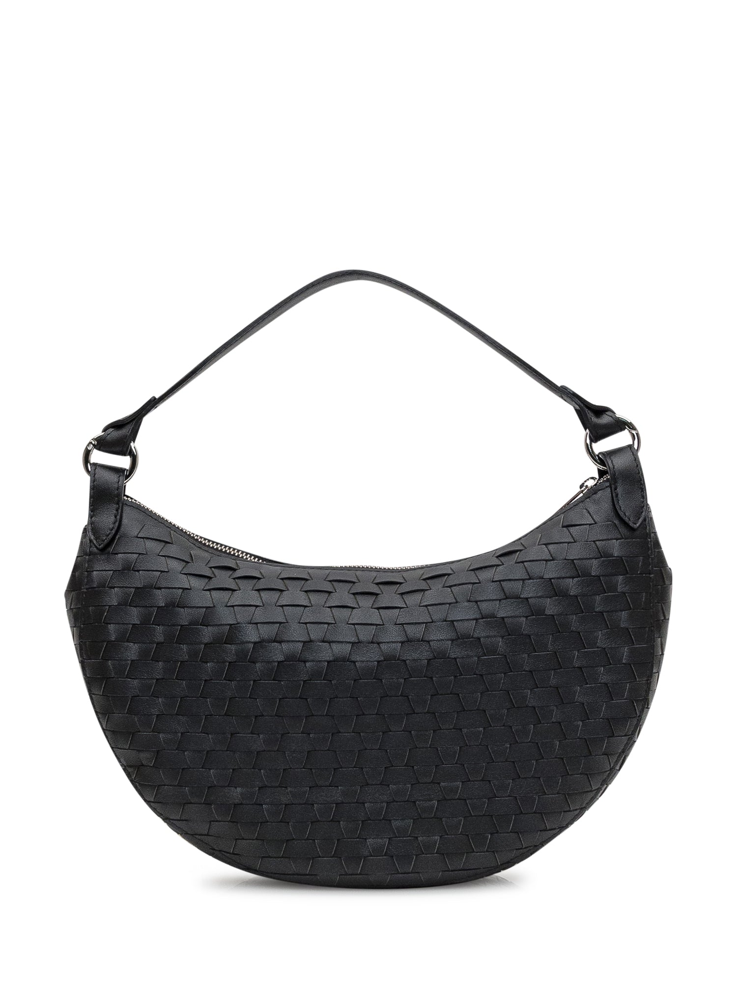 Black woven leather bag. Two open internal pockets. Zip closure. Adjustable shoulder strap and removable handle. Palladium finish.