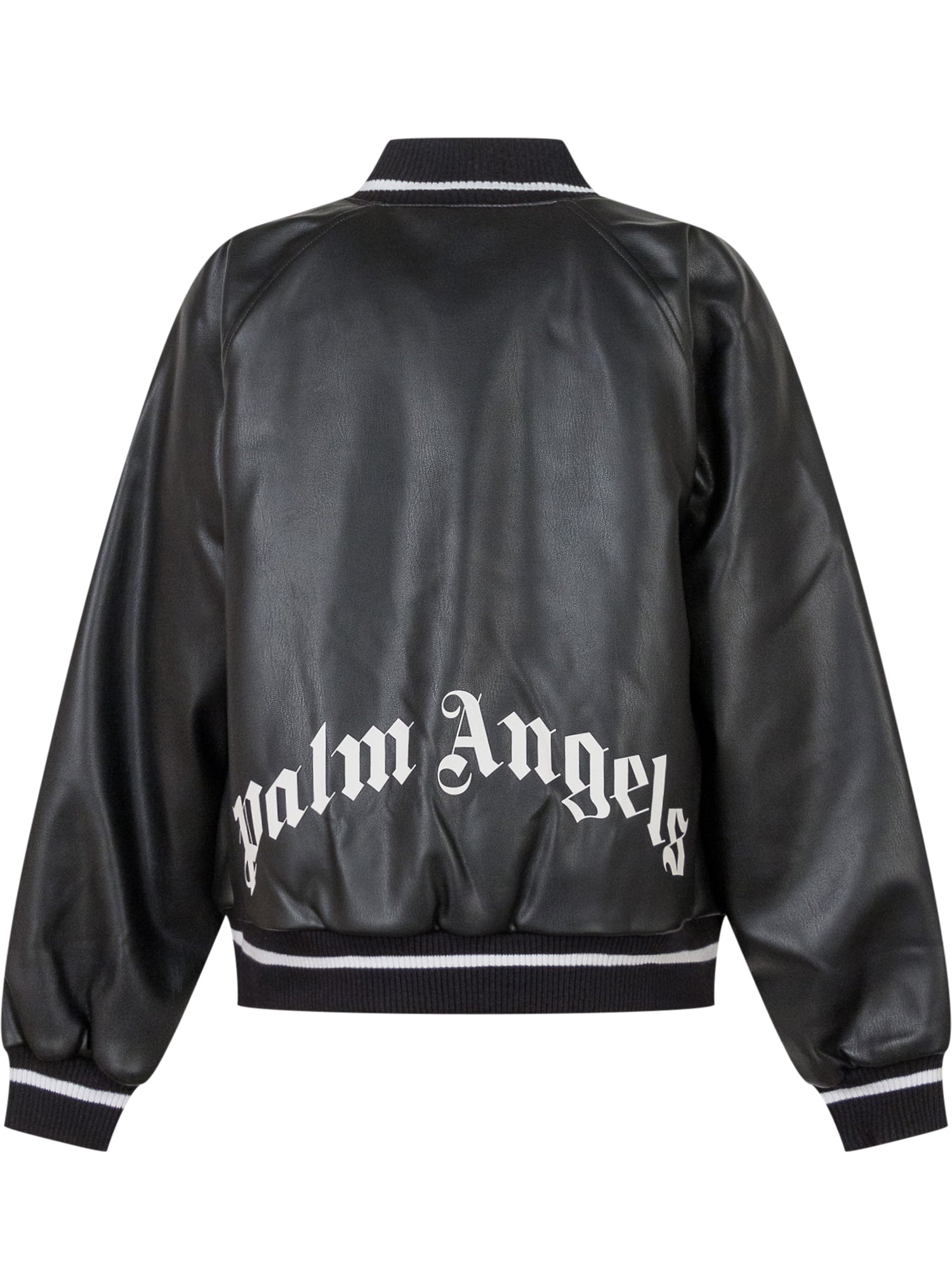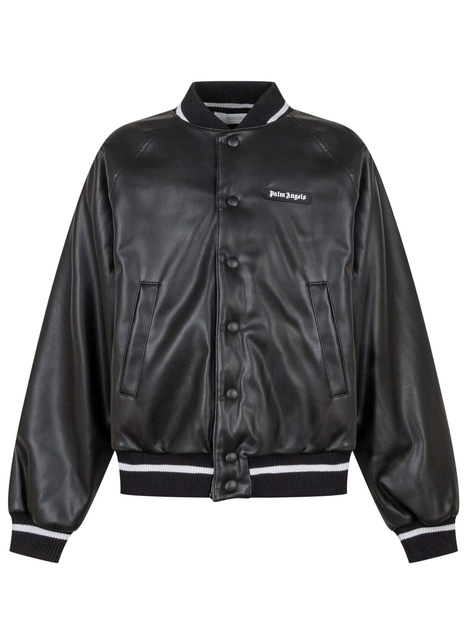 Palm Angels bomber jacket in black faux leather with snap button closure, side pockets and ribbed striped details.