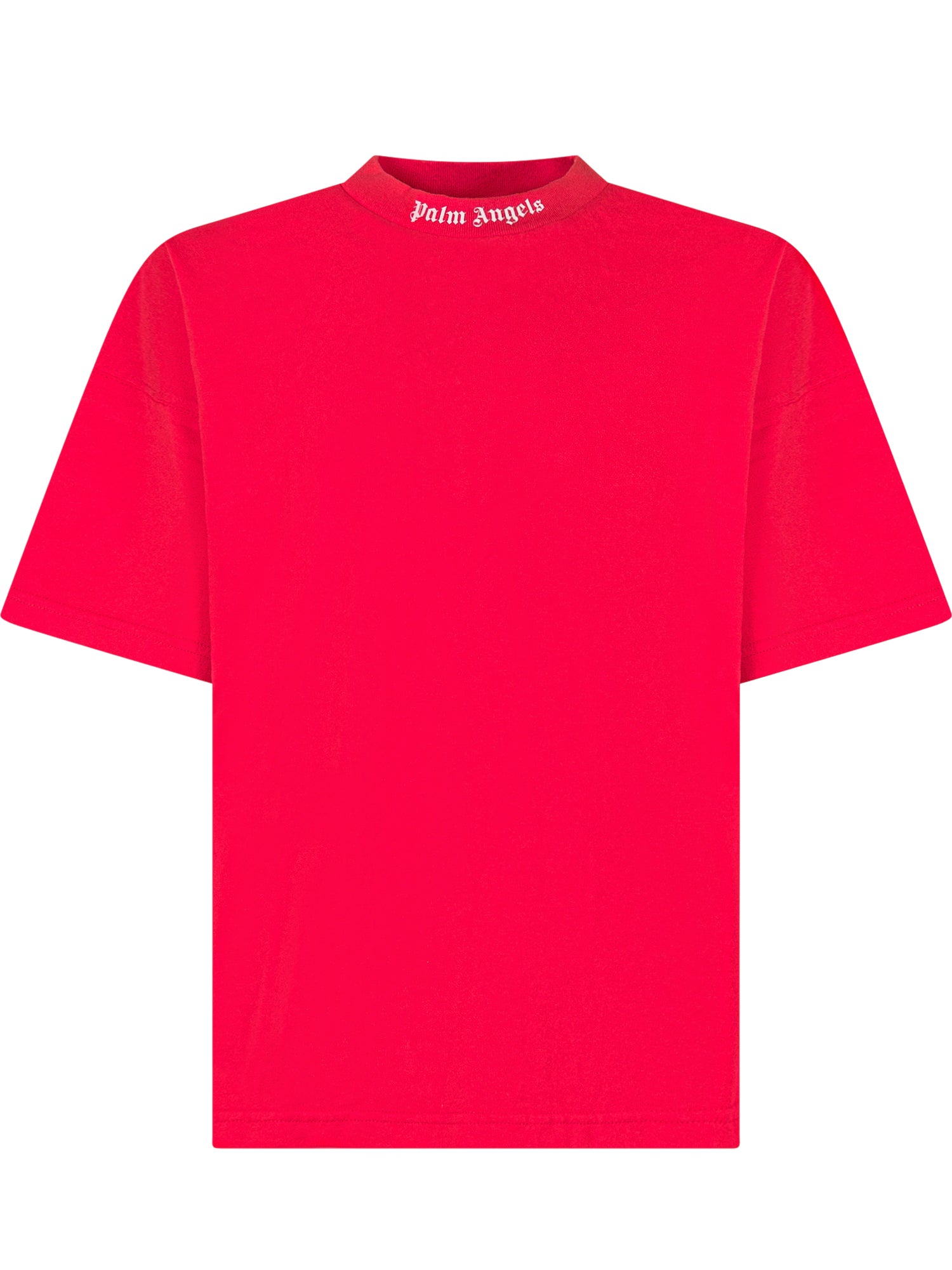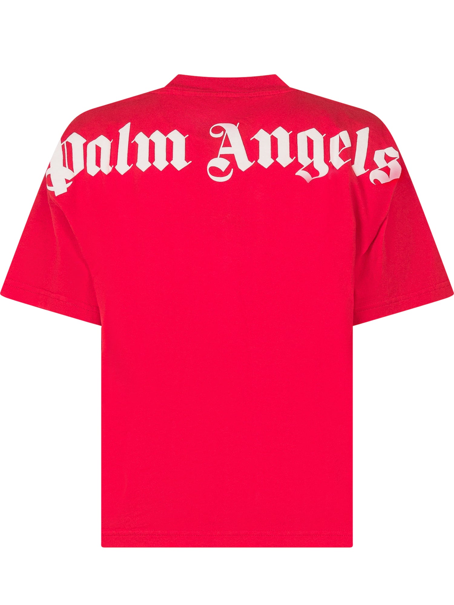 Palm Angels red cotton T-shirt with relaxed fit. Features high crew neck with logo detail and bold contrasting Palm Angels lettering on the back.