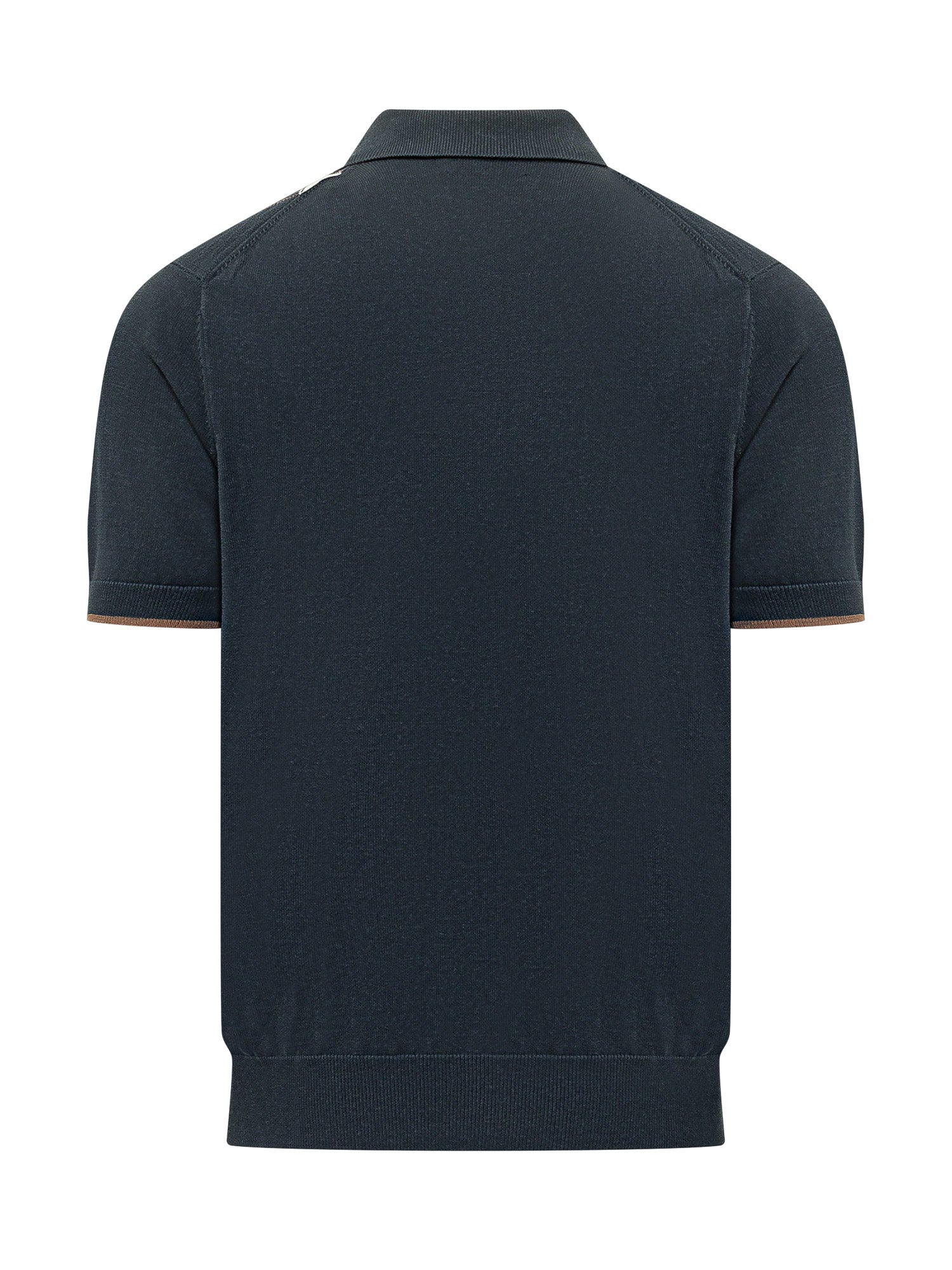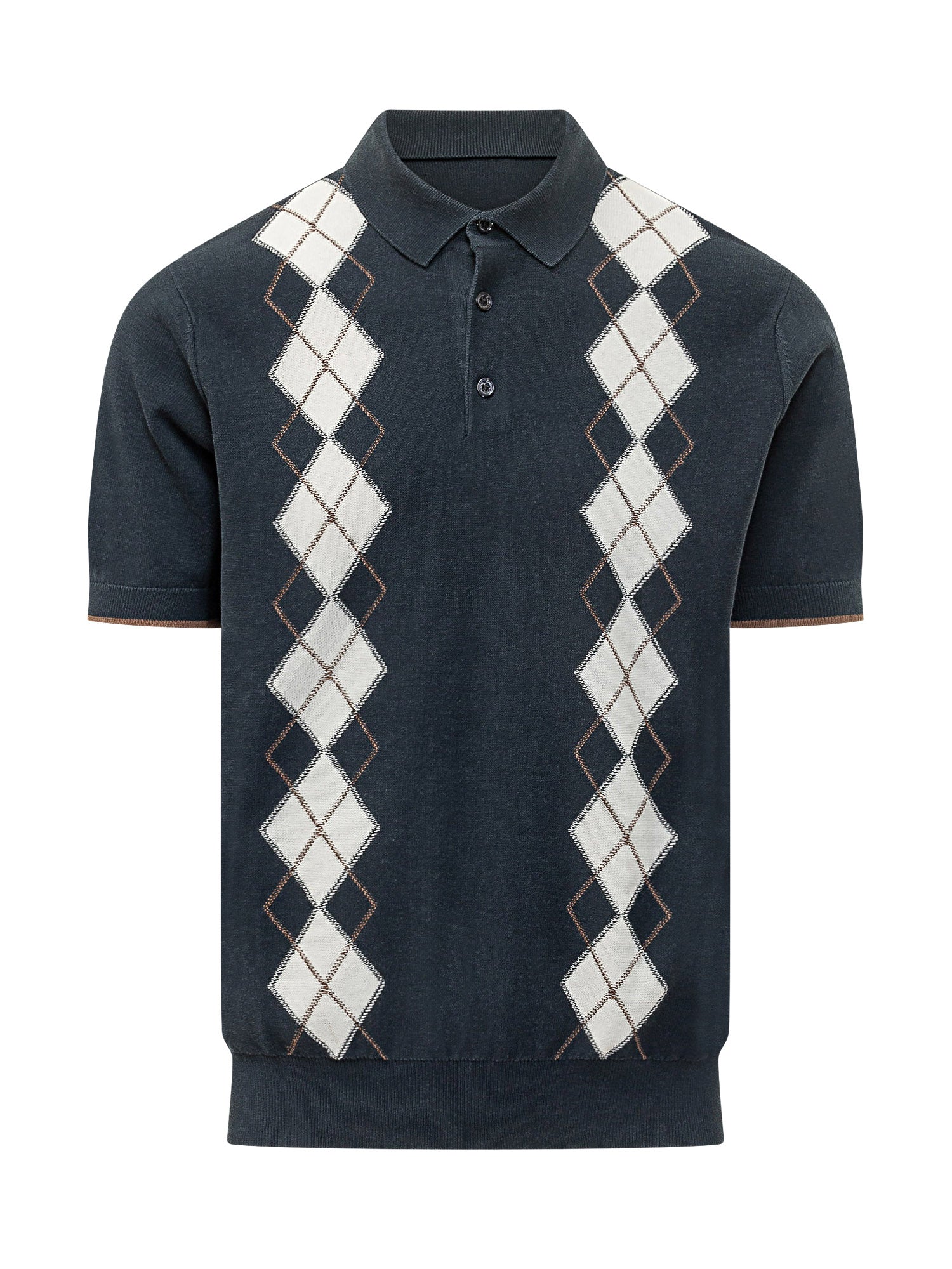 Short-sleeved polo featuring a classic collar and front button placket. Adorned with contrasting argyle pattern on the front and striped details on the sleeve hems, finished with a ribbed hem. Regular fit for an elegant look with a retro-inspired charm.