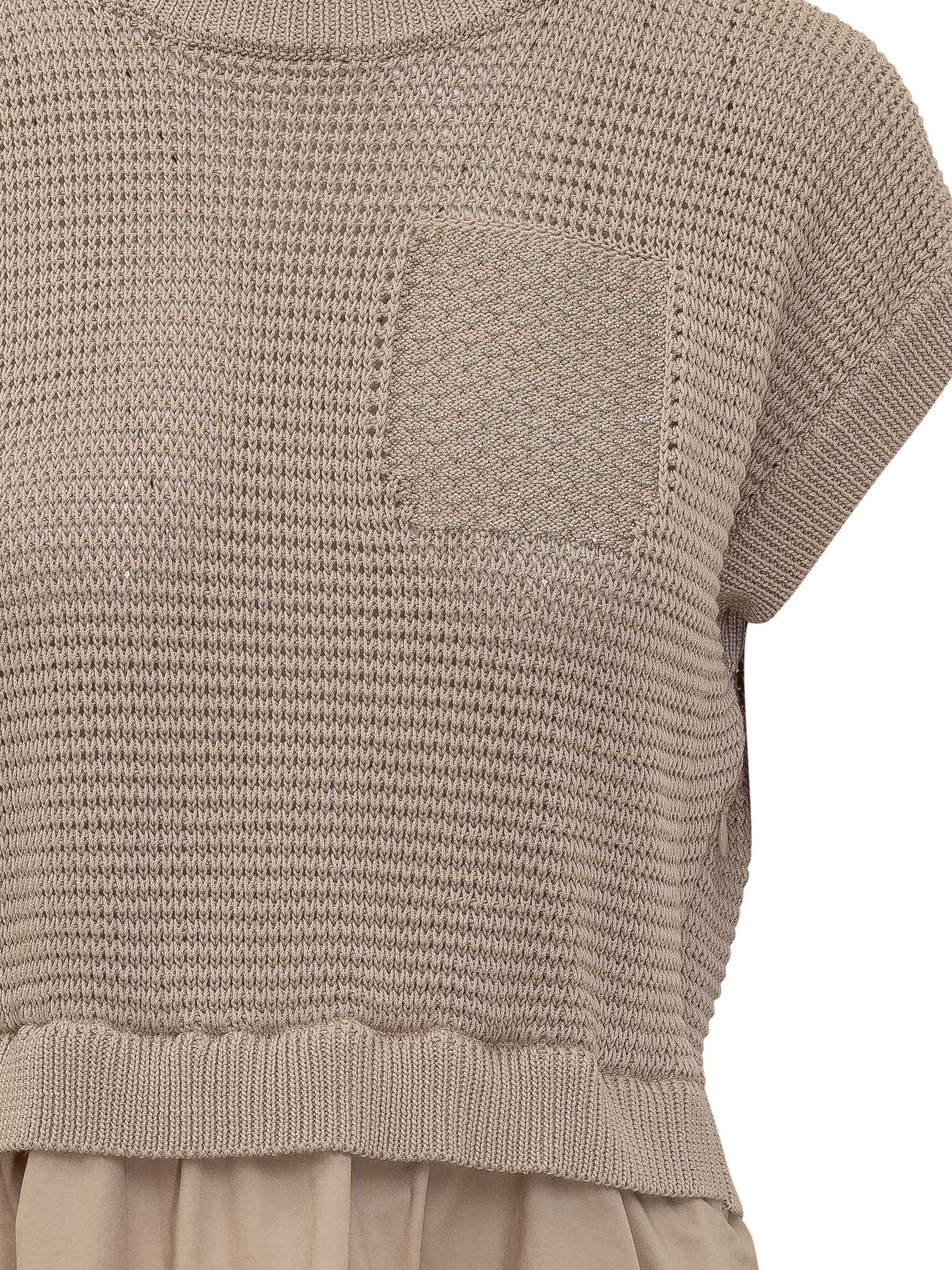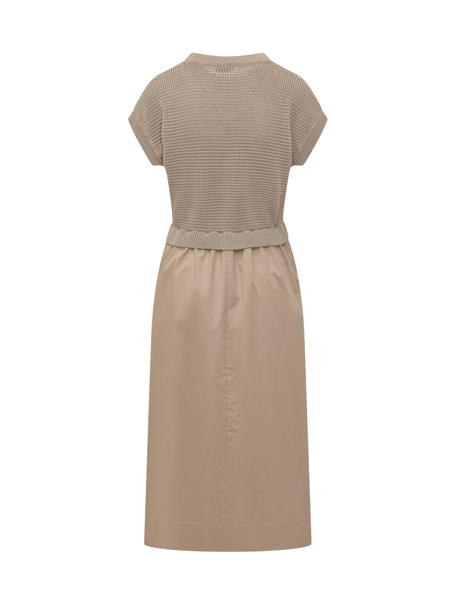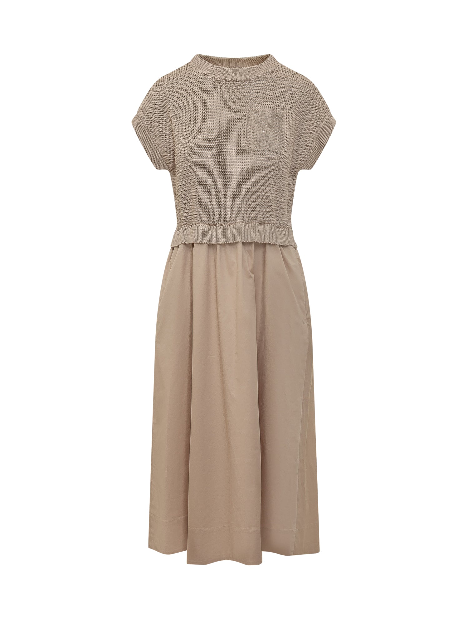 Midi dress featuring a textured tricot knit upper with a relaxed fit. Crew neck, short kimono sleeves and a chest patch pocket. Flowing skirt in smooth fabric with lightly gathered waist.