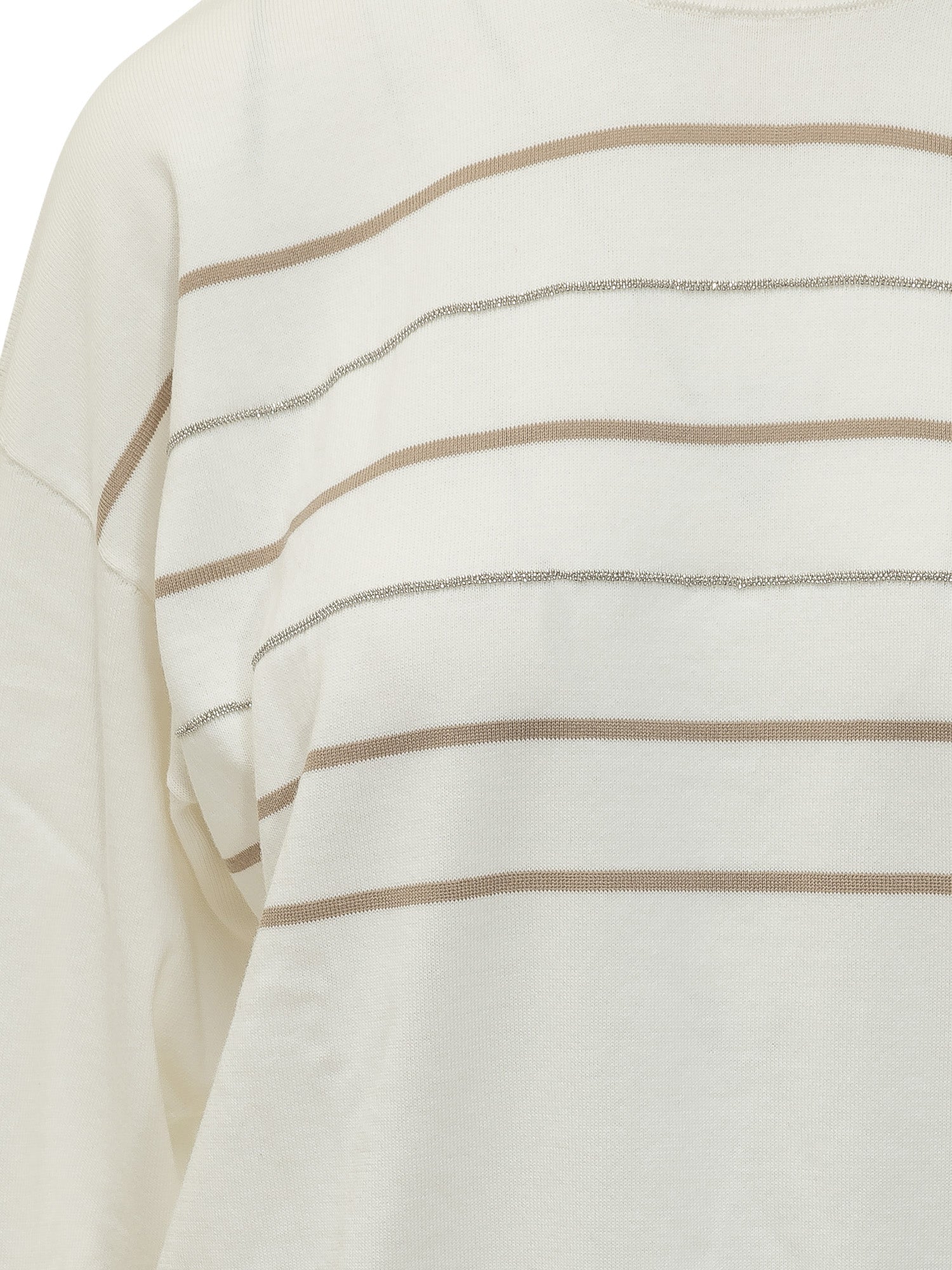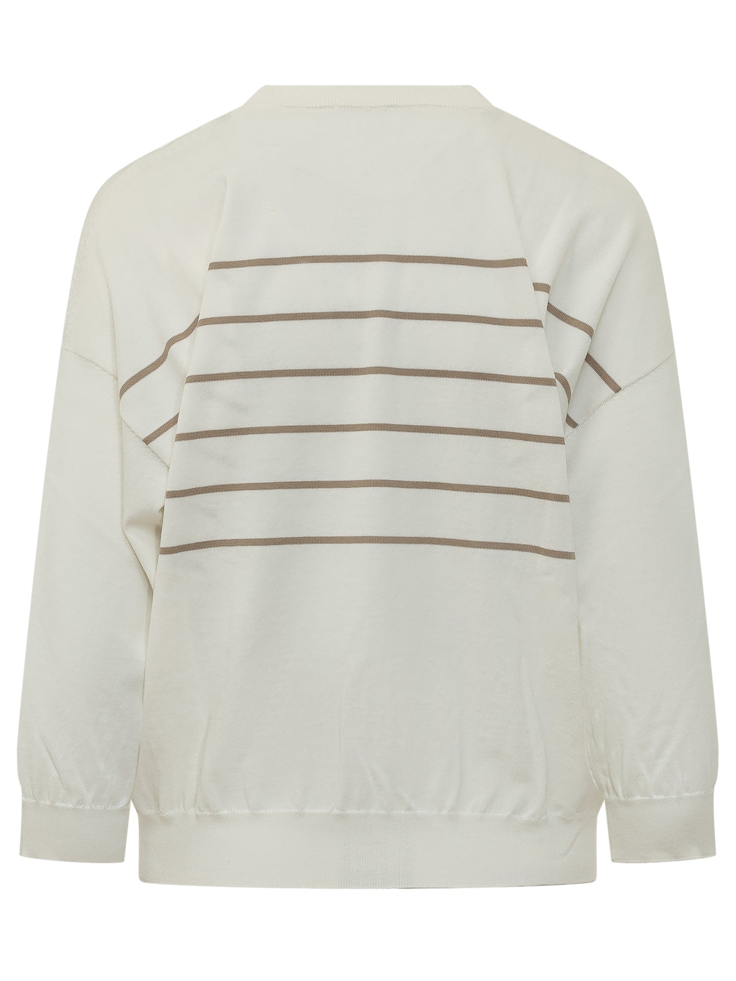 Tricot knit top with a relaxed fit, featuring a crew neck and long sleeves. Horizontal stripe pattern with contrasting knit detailing on the front. Ribbed hem and cuffs.