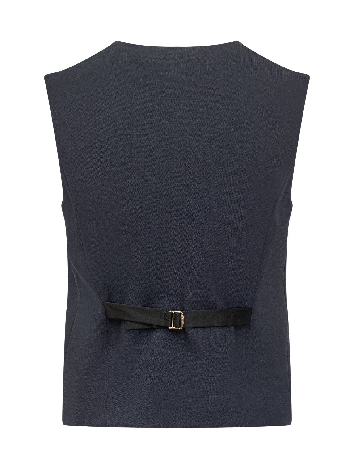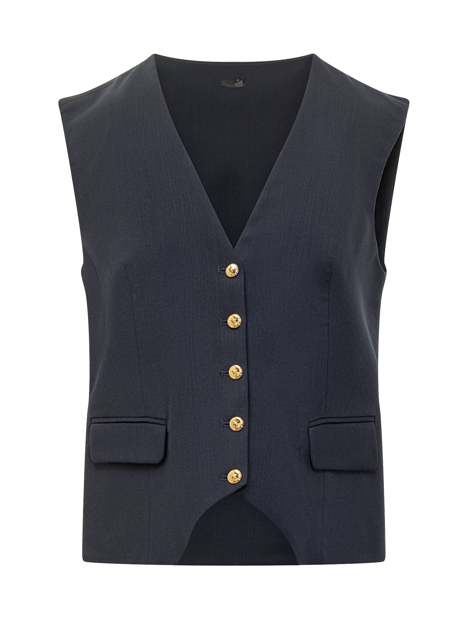 Pinko dark blue tailored waistcoat with six gold buttons and flap pockets.