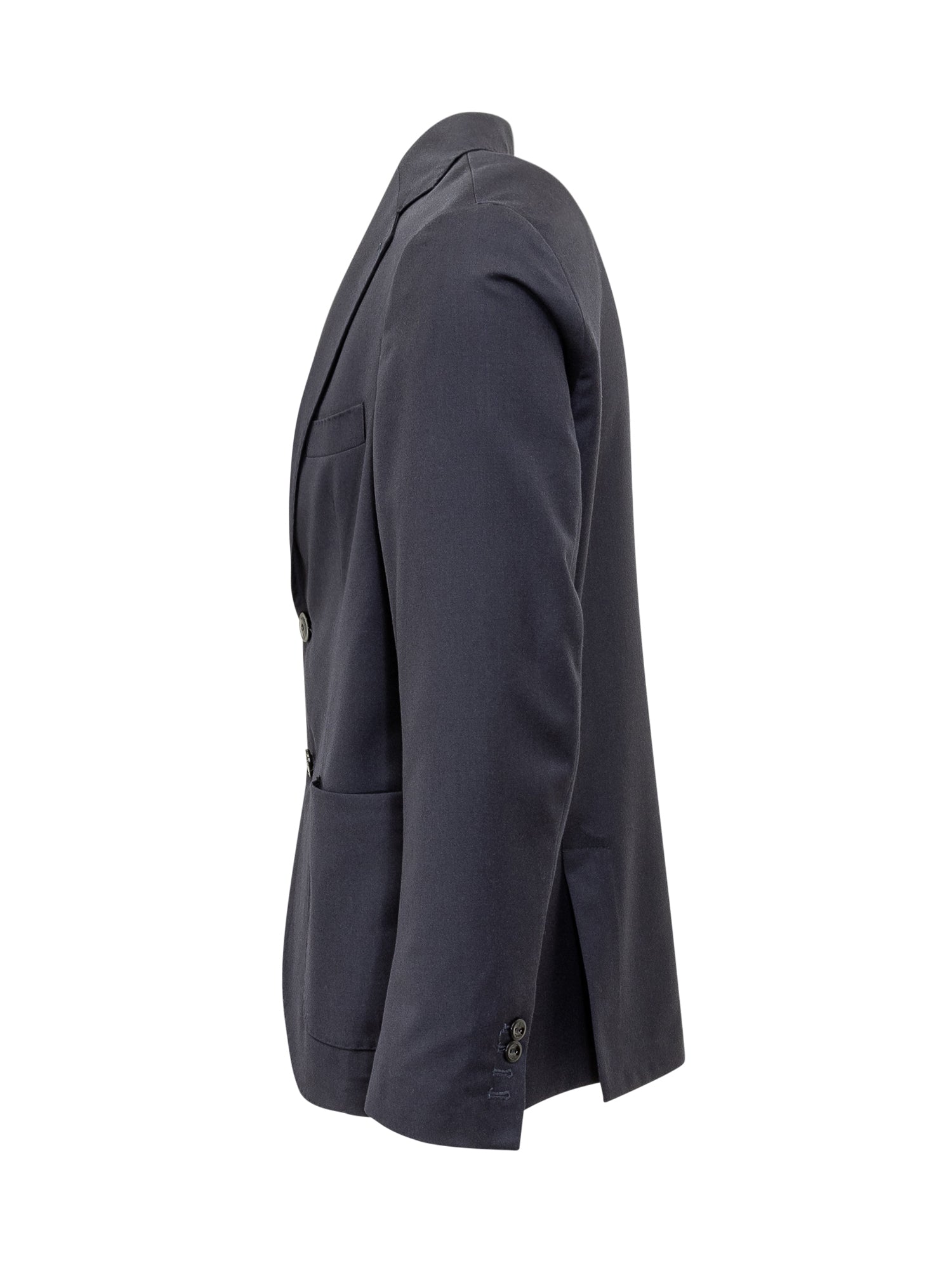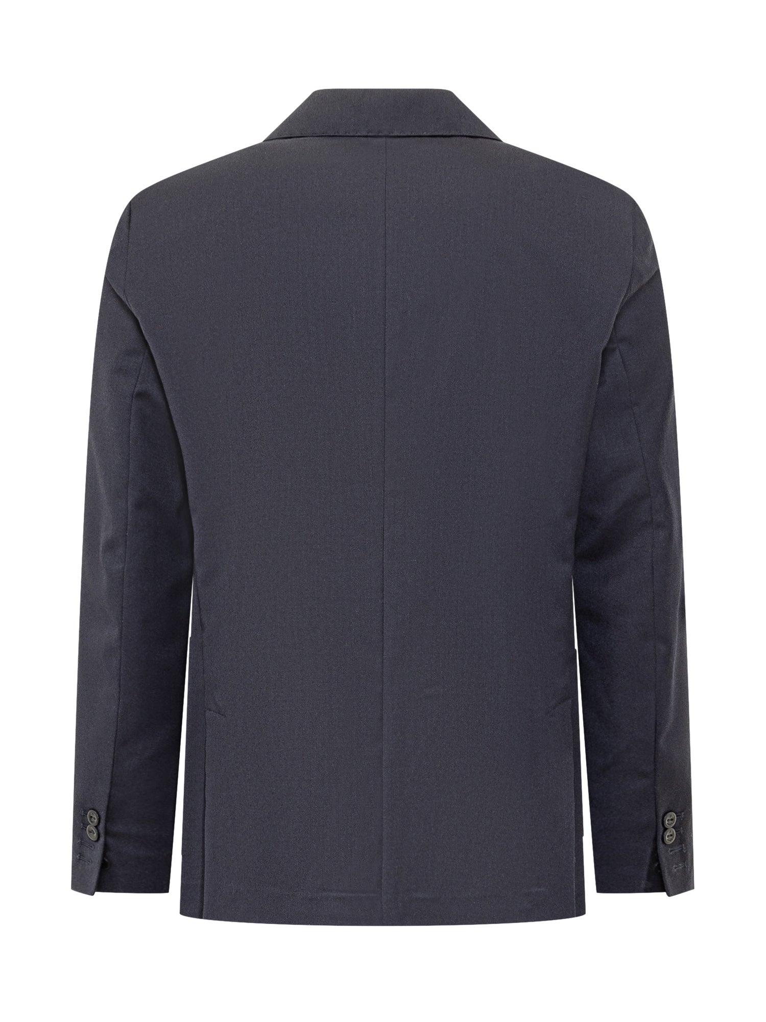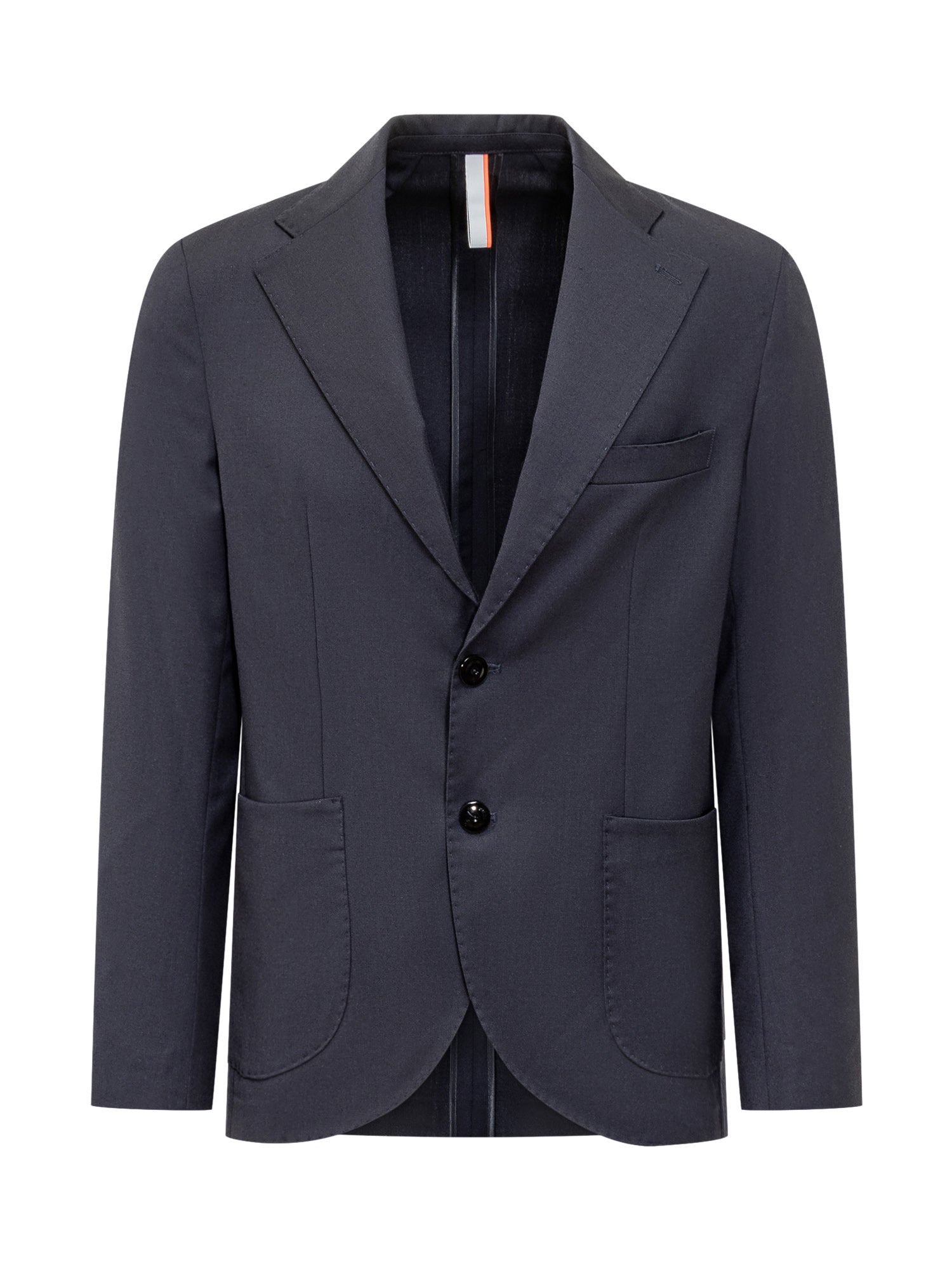 PMDS blue single-breasted blazer with two-button closure and patch pockets.