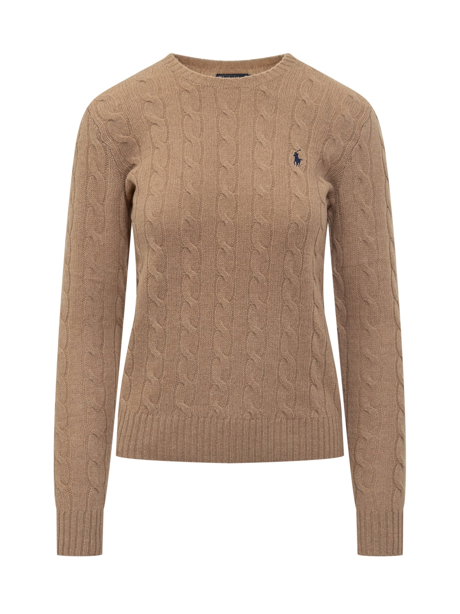 Polo Ralph Lauren beige wool sweater featuring a cable-knit texture and embroidered chest logo.