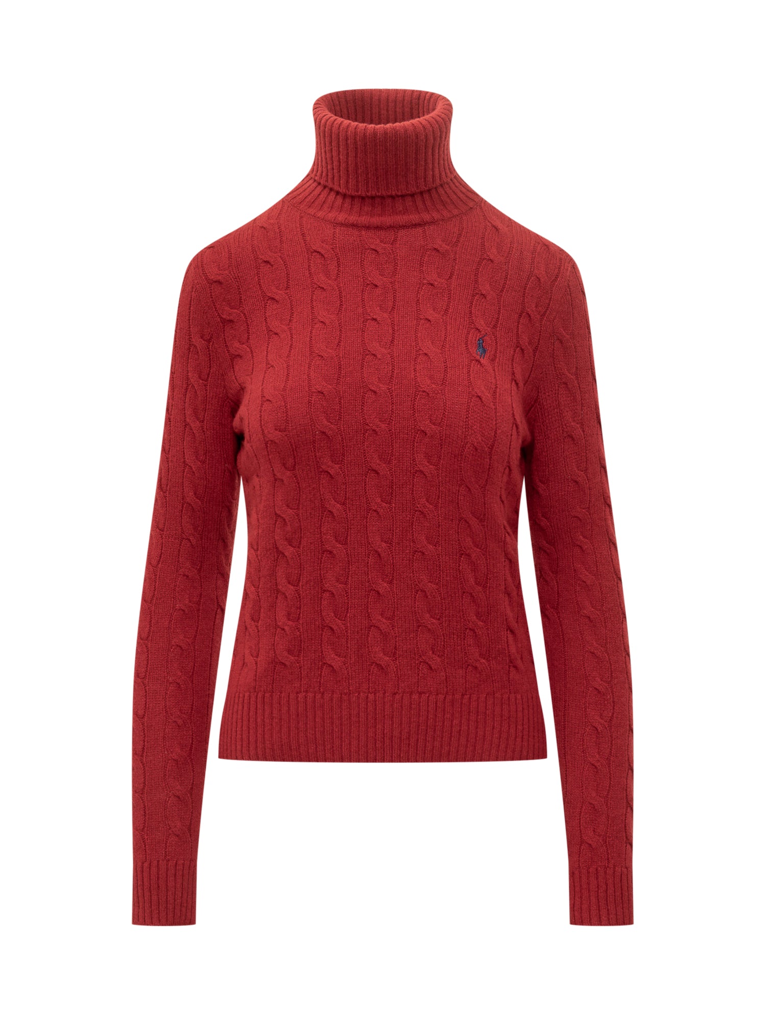 Polo Ralph Lauren red cable knit turtleneck with slim fit and embroidered chest logo.