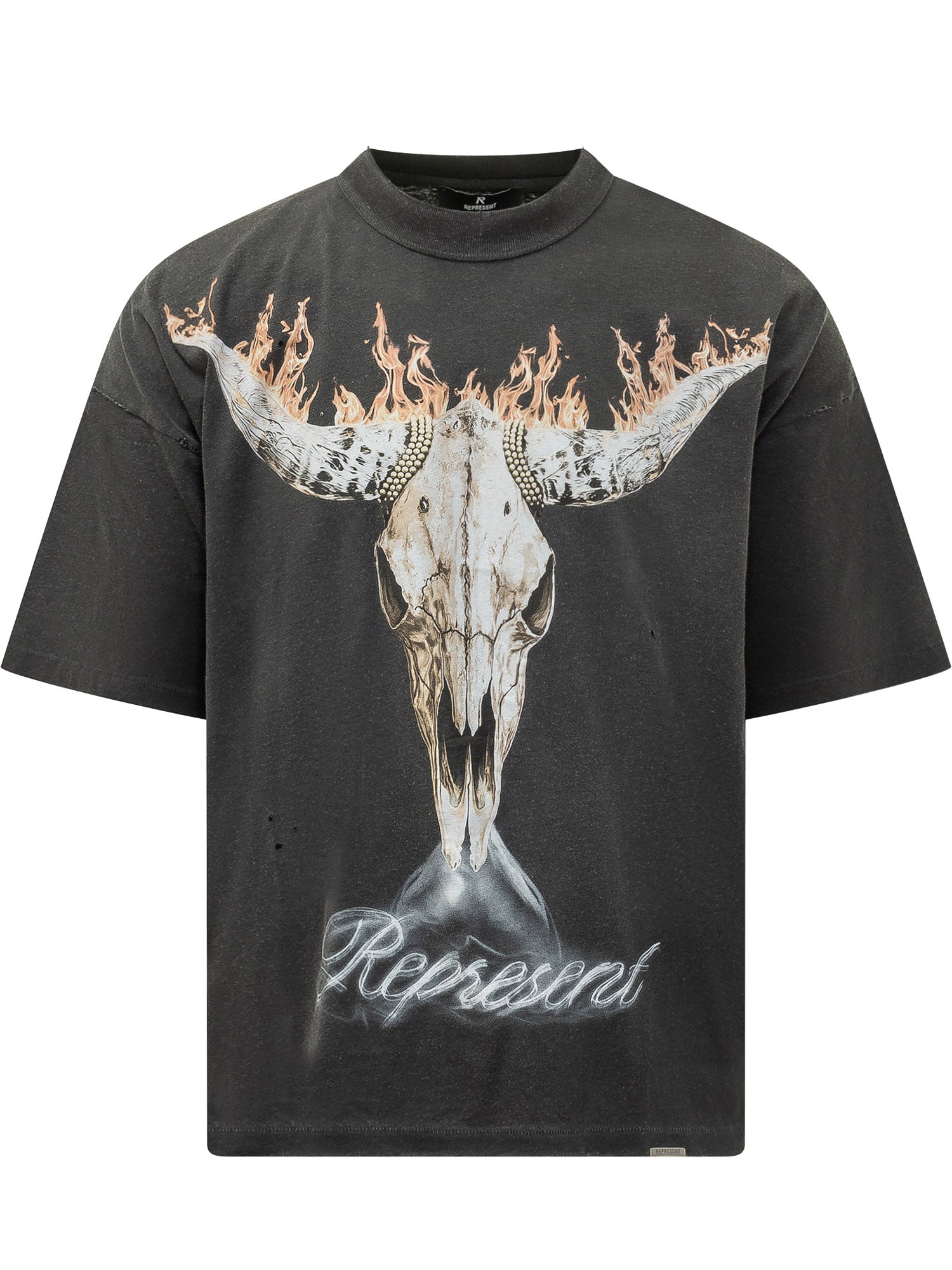 Short sleeve cotton T-shirt featuring a ribbed crew neck. Designed with a bold front print of a bull skull with flames and logo lettering at the bottom. Regular fit with a strong and contemporary look.