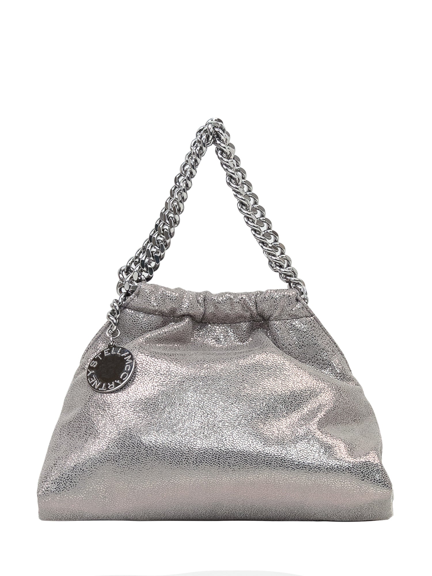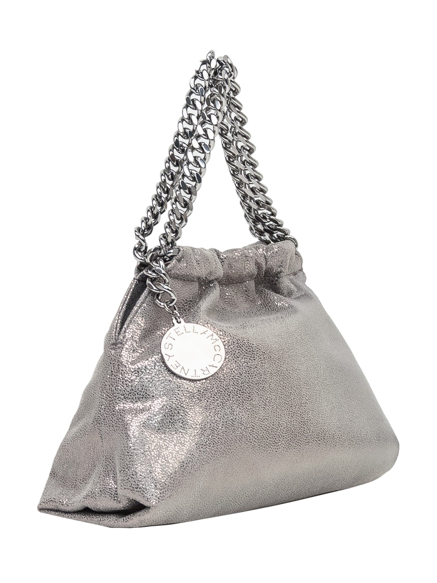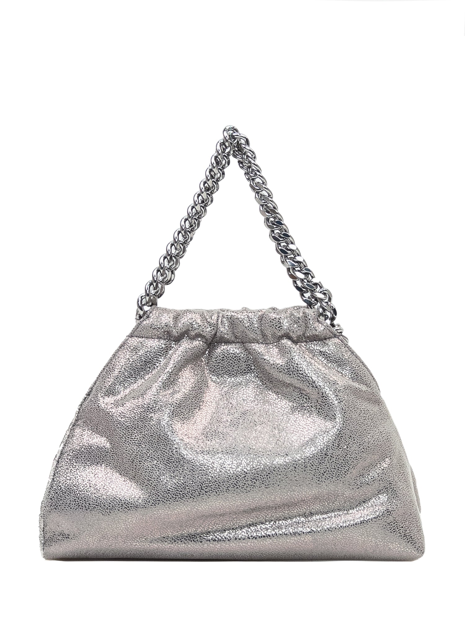 Stella McCartney bag with metallic finish and soft silhouette. Features chain handle, gathered top and logo charm.