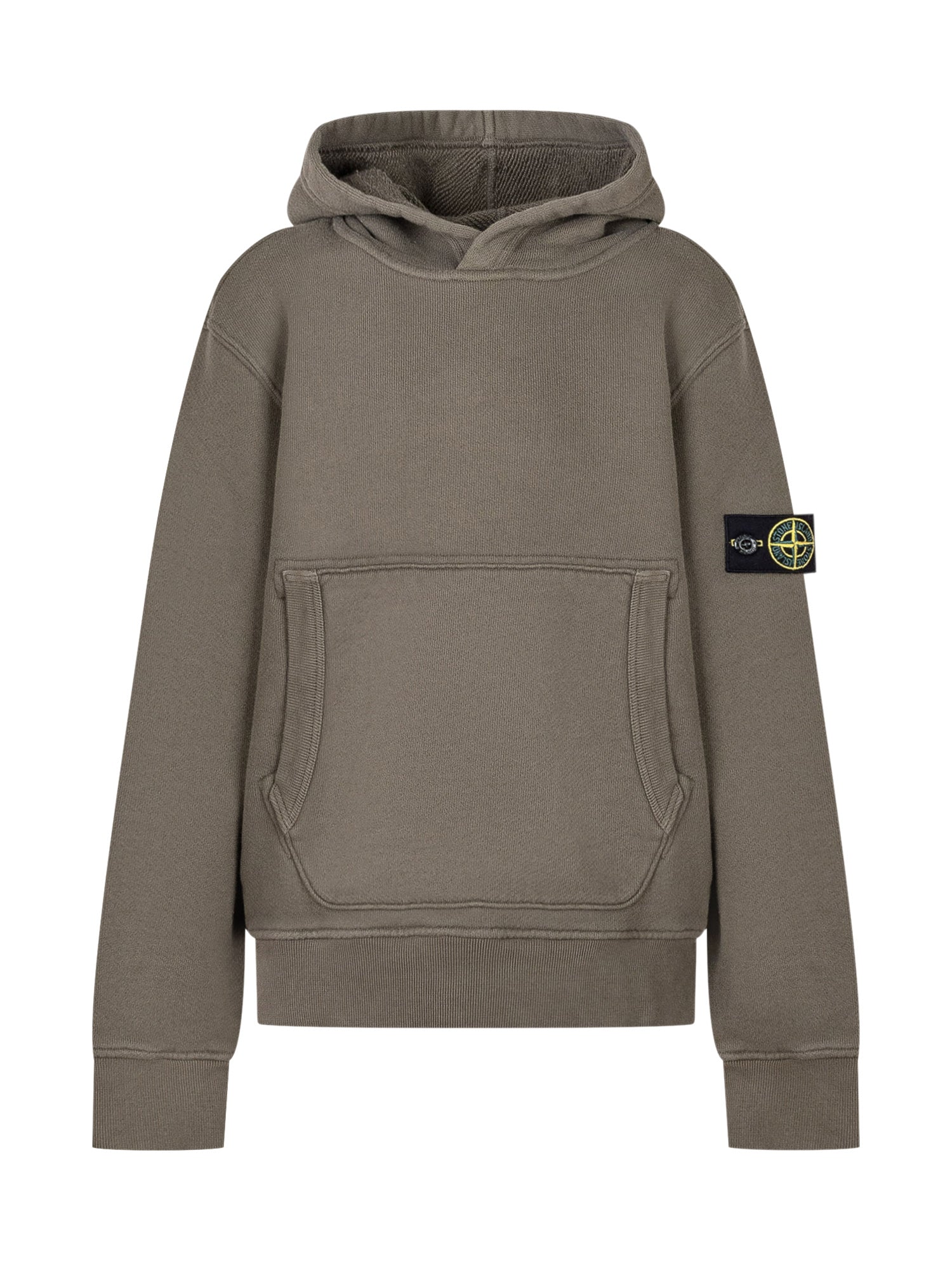 Stone Island Kids green cotton hoodie featuring a front kangaroo pocket and signature logo patch on the sleeve.
