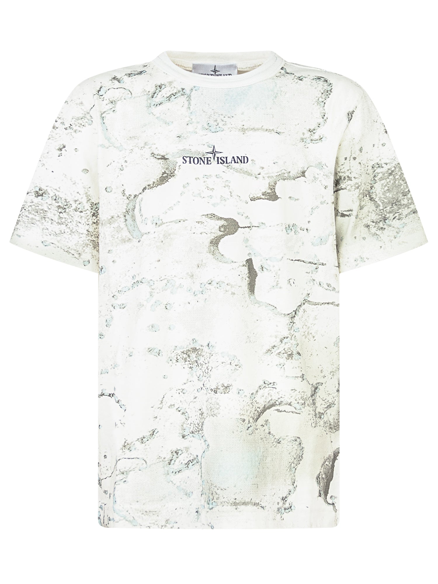 Stone Island Kids white cotton T-shirt with marble-effect abstract print and front logo.