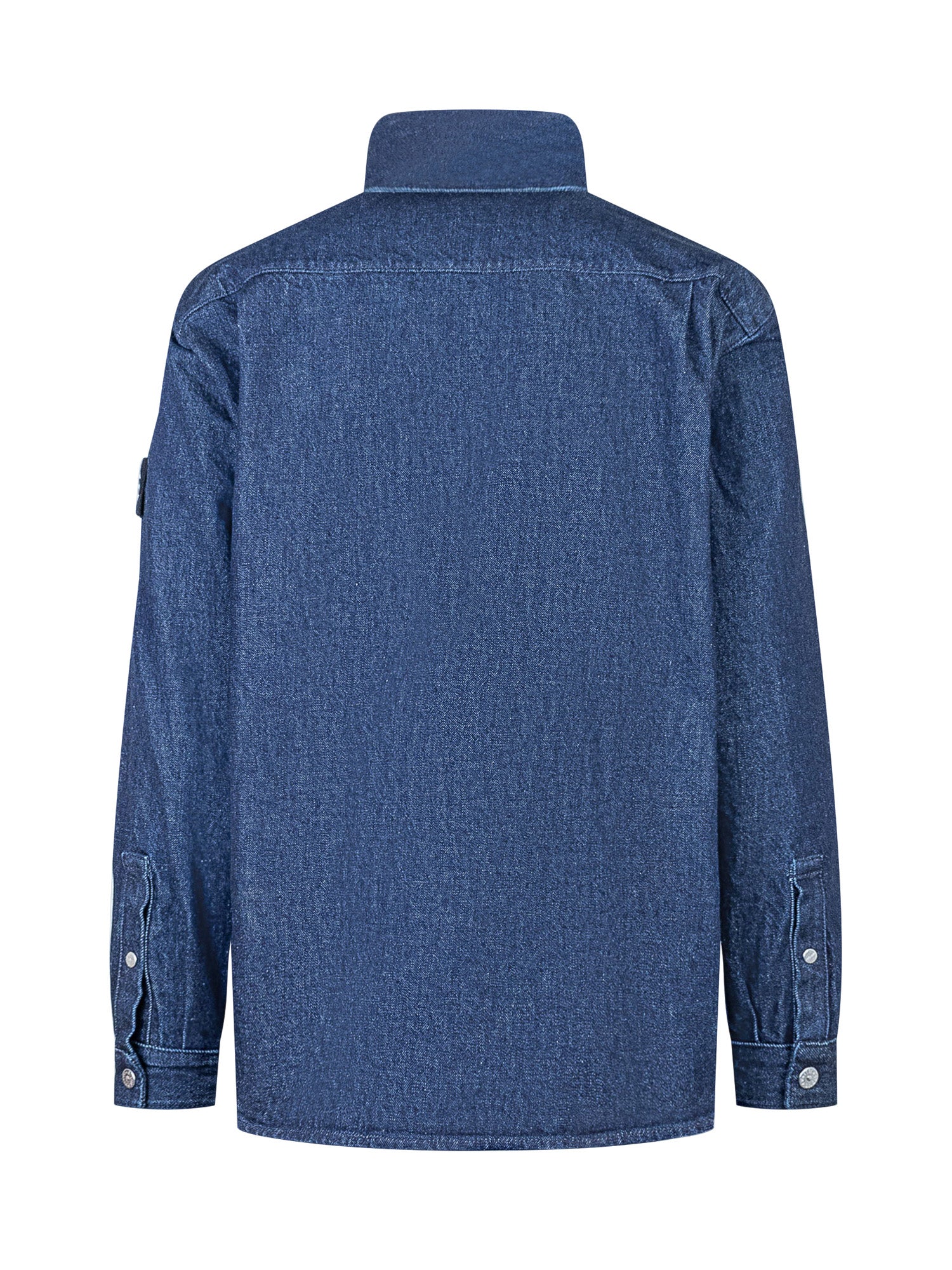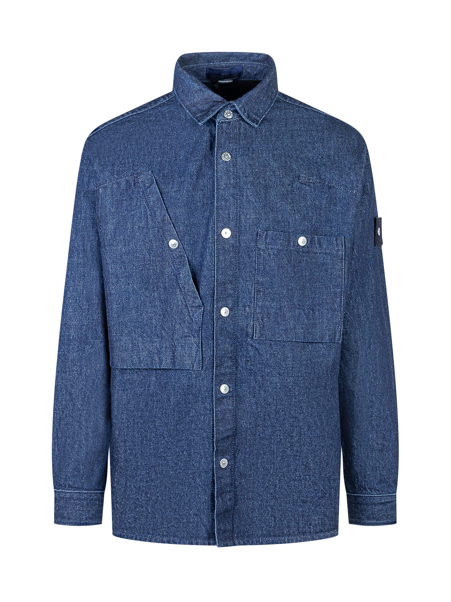Stone Island blue denim shirt with front pockets and signature logo patch on the sleeve. Button closure and regular fit.